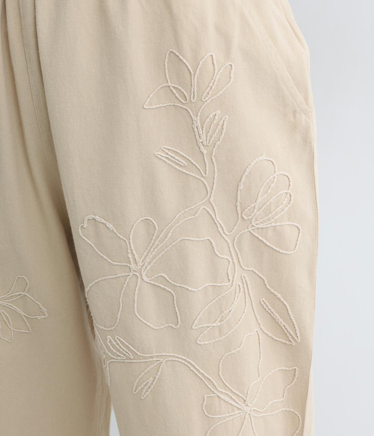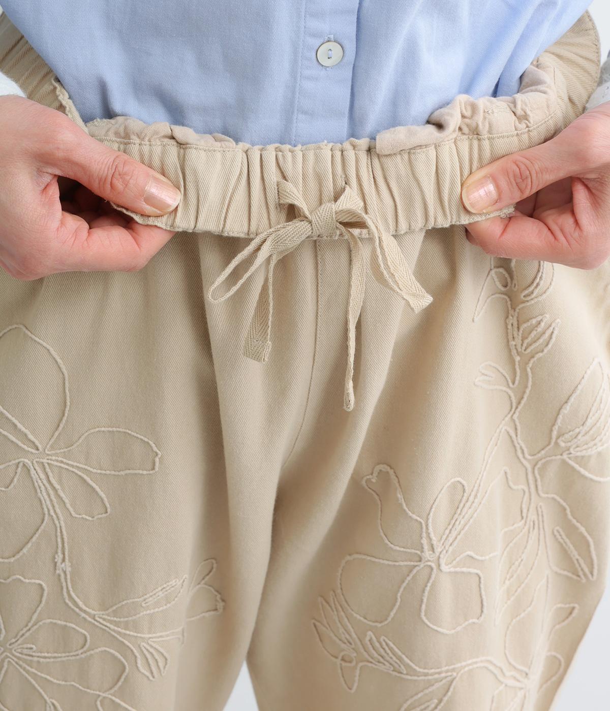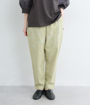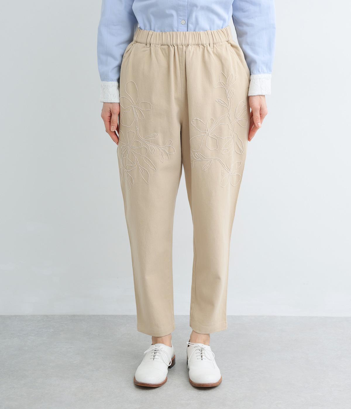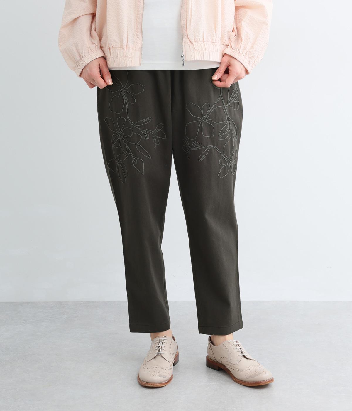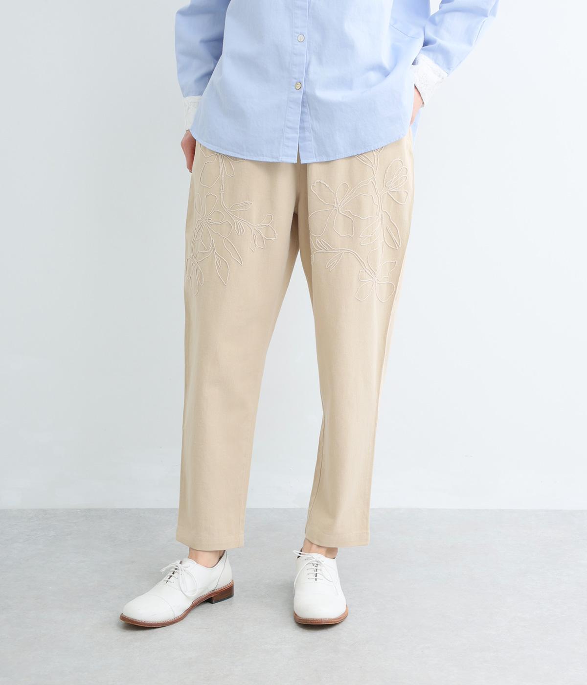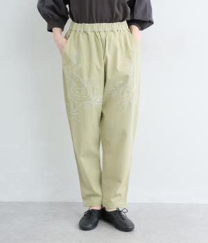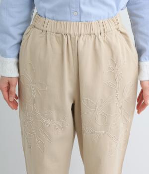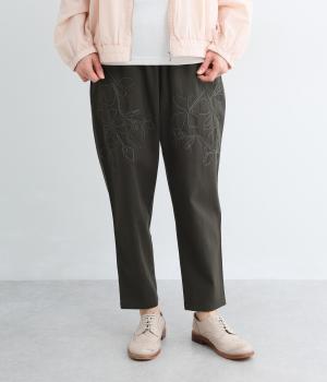 フロントに施したスミレの刺しゅうが、やさしいニュアンスを添えるデザインです。腰まわりにゆとりを持たせつつ、裾にかけてすっきりとしたテーパードシルエットでバランスよく仕上げています。ウエストはゴム仕様で着用感も快適。ベルトループつきなので、コーディネートの幅も広がります。