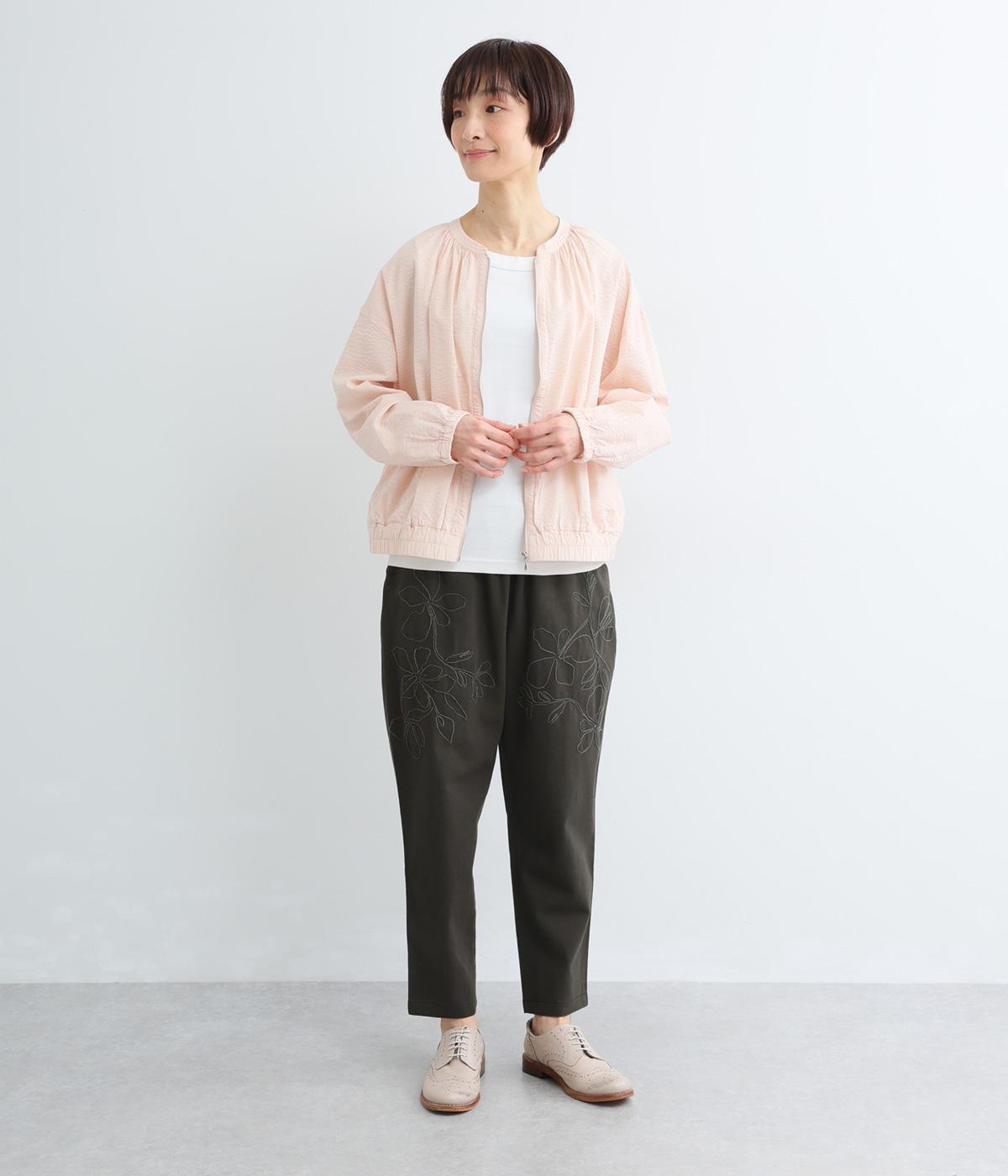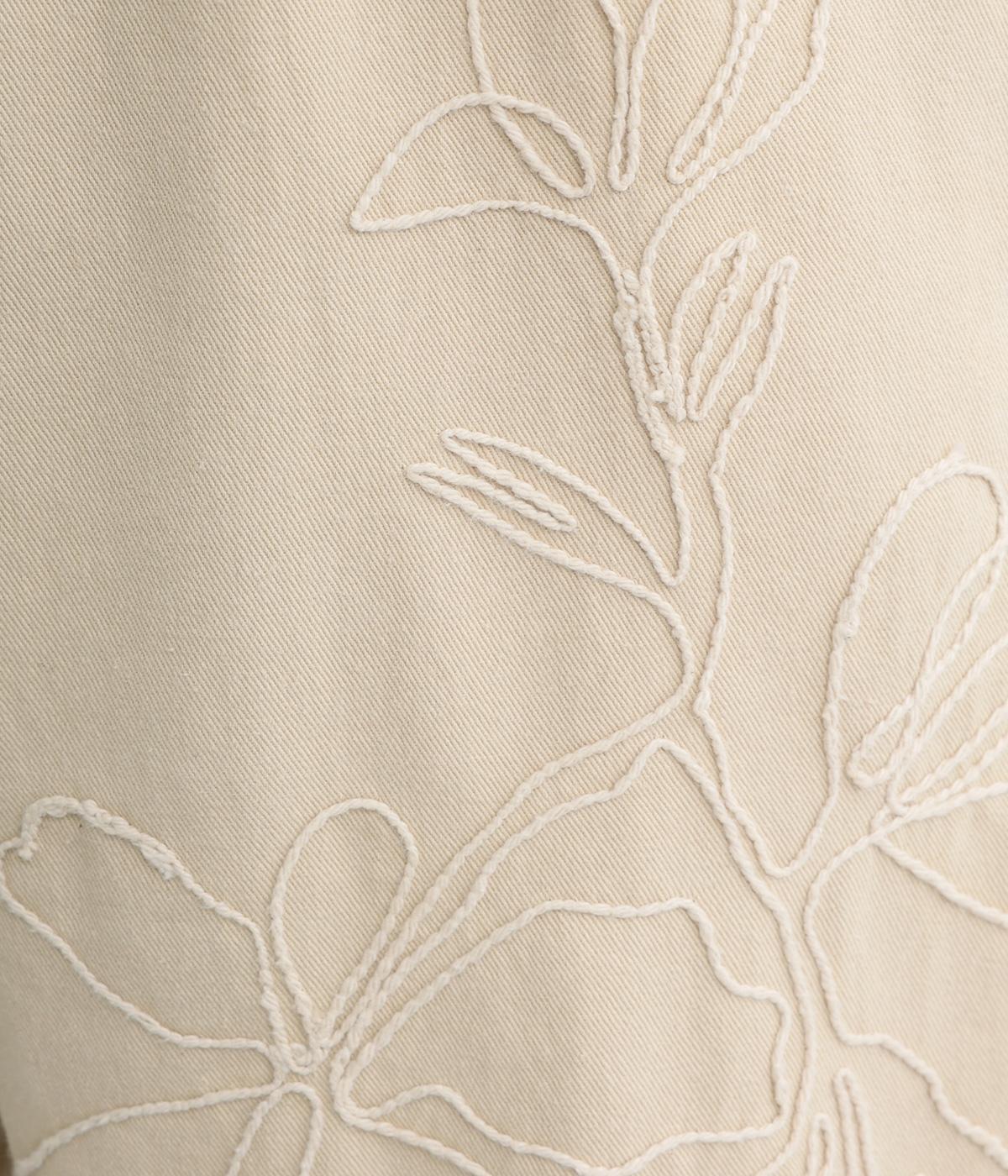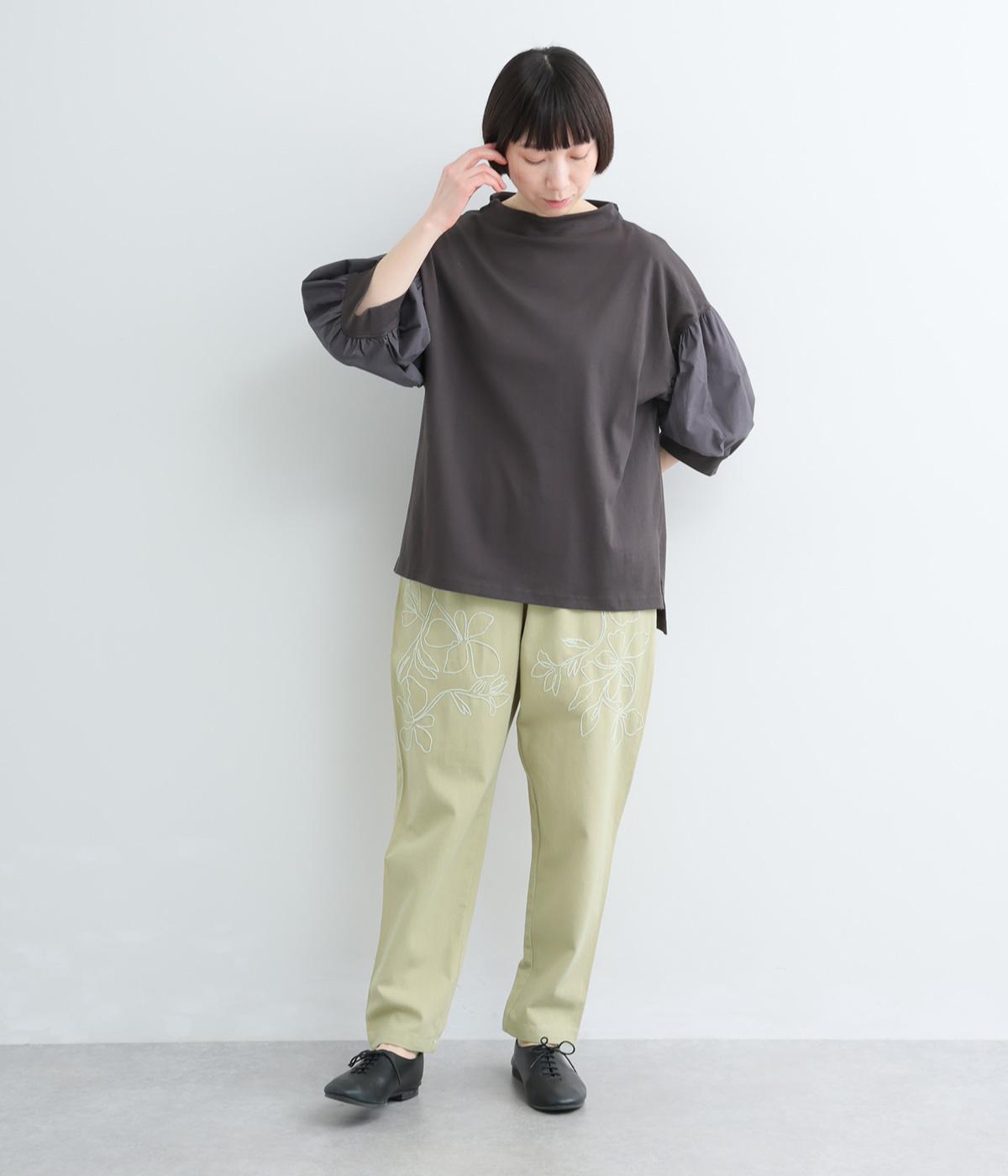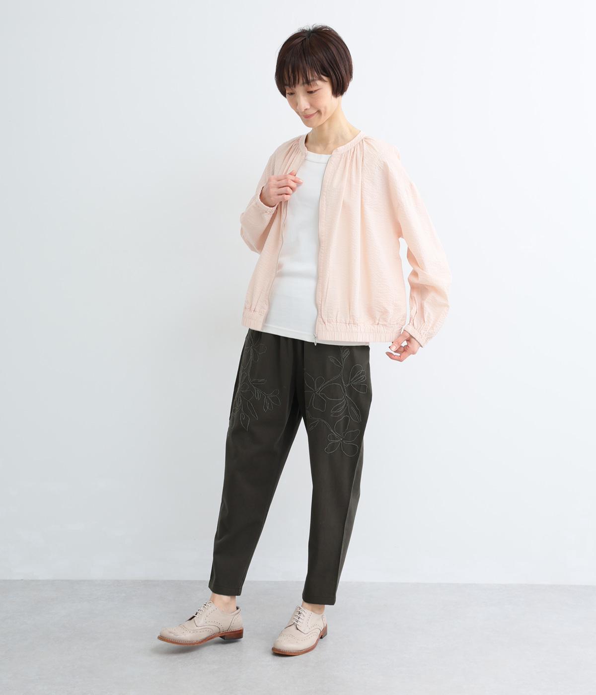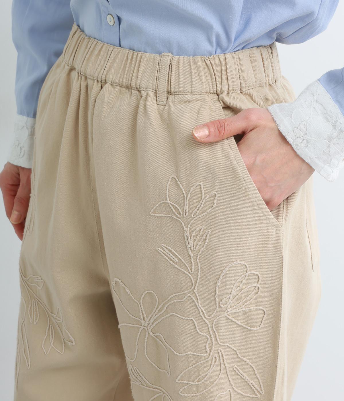 フロントに施したスミレの刺しゅうが、やさしいニュアンスを添えるデザインです。腰まわりにゆとりを持たせつつ、裾にかけてすっきりとしたテーパードシルエットでバランスよく仕上げています。ウエストはゴム仕様で着用感も快適。ベルトループつきなので、コーディネートの幅も広がります。
