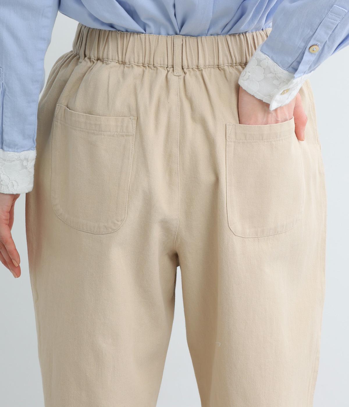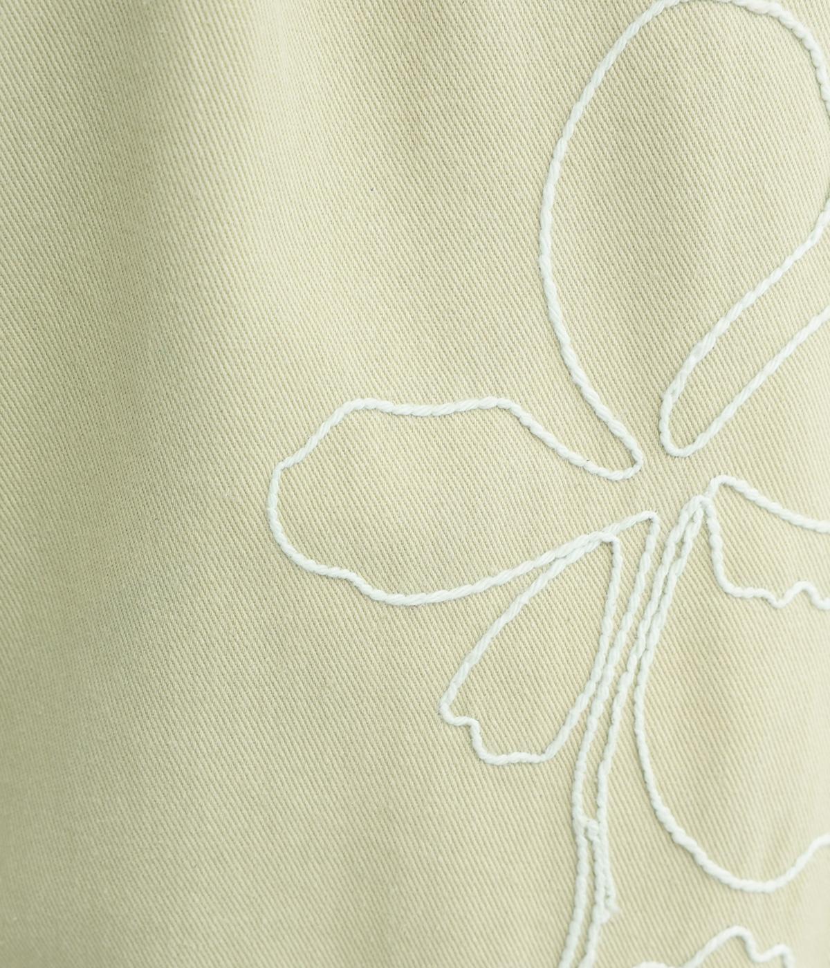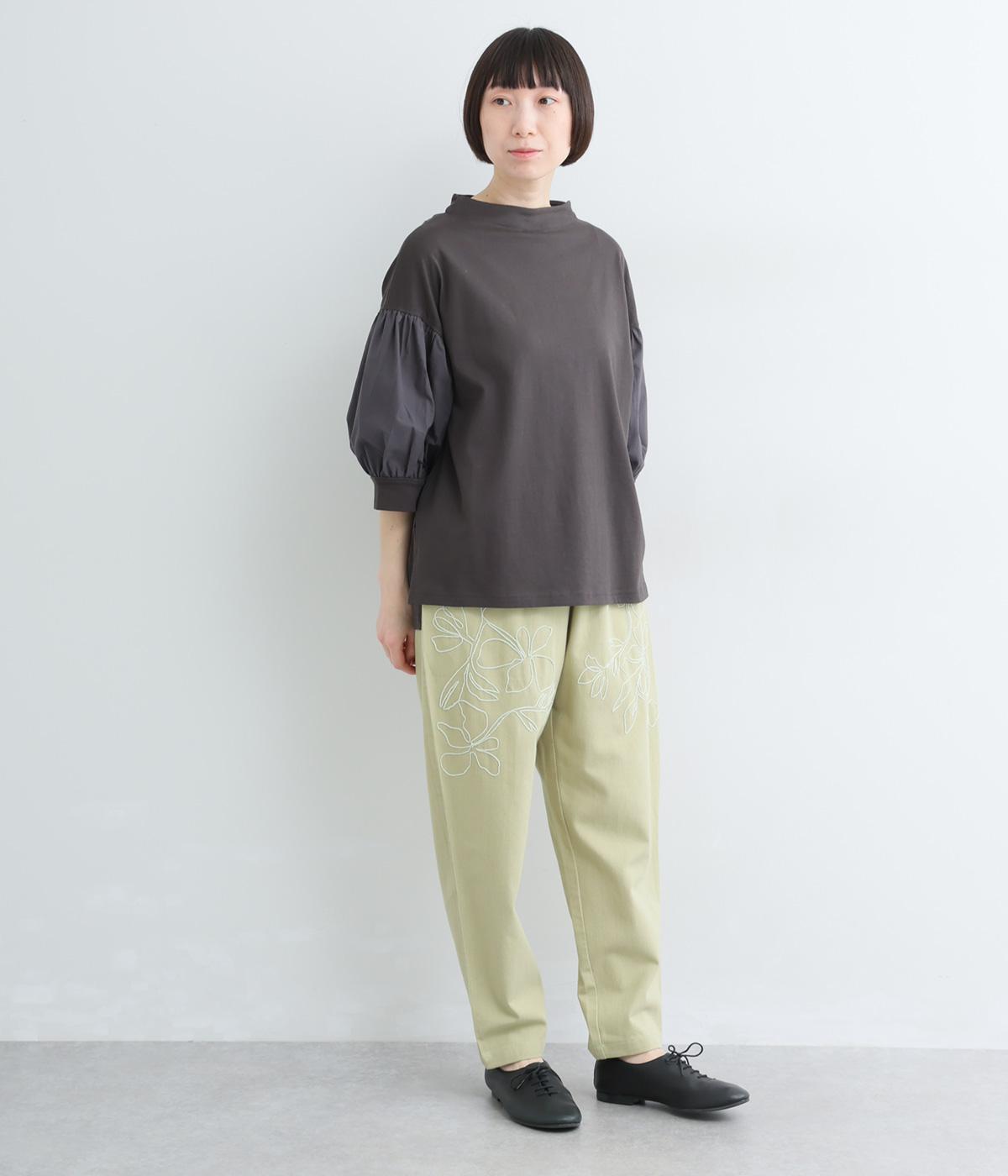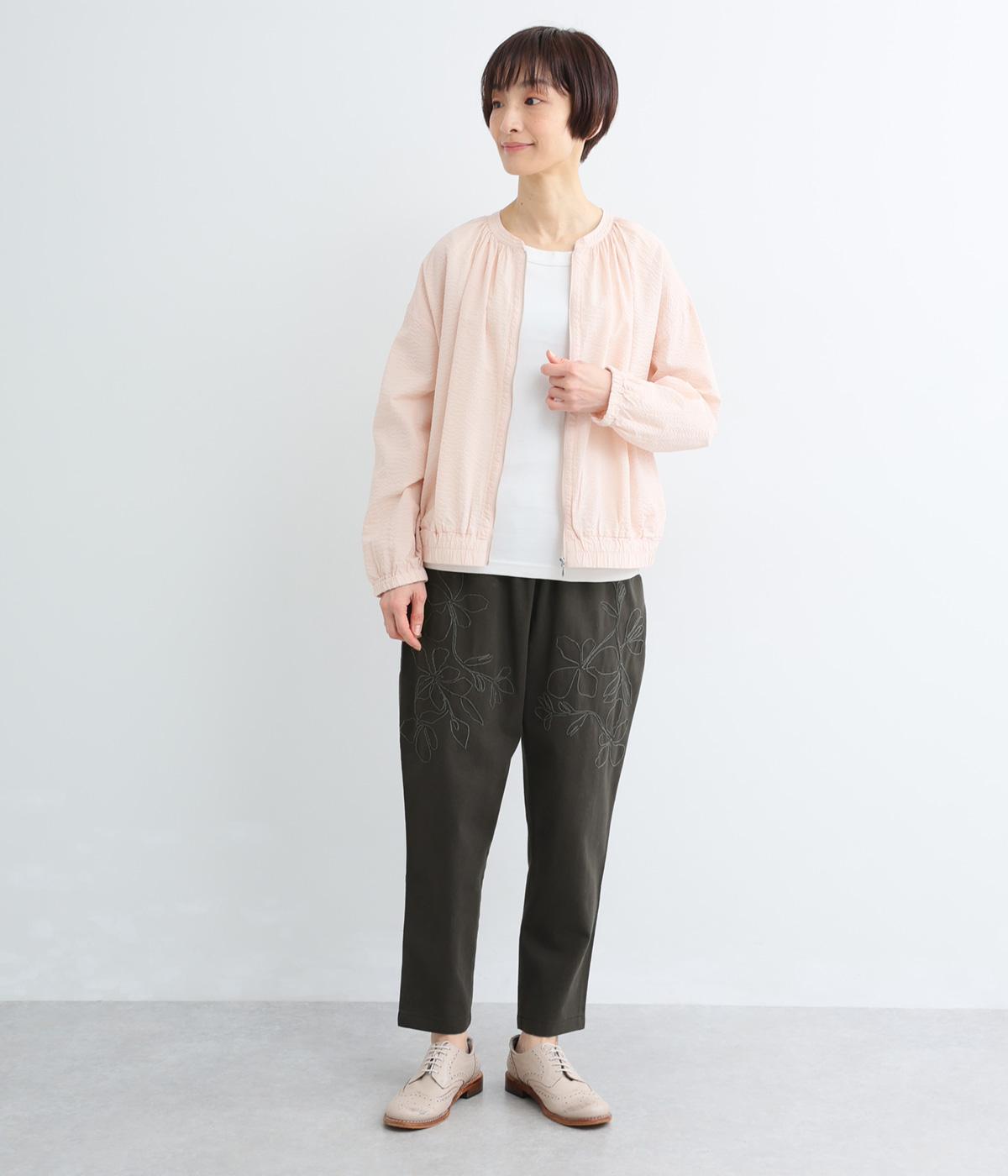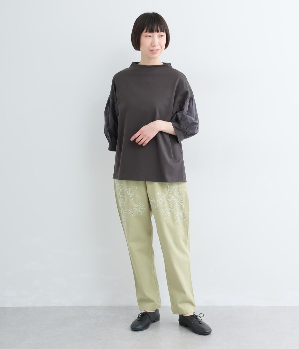 フロントに施したスミレの刺しゅうが、やさしいニュアンスを添えるデザインです。腰まわりにゆとりを持たせつつ、裾にかけてすっきりとしたテーパードシルエットでバランスよく仕上げています。ウエストはゴム仕様で着用感も快適。ベルトループつきなので、コーディネートの幅も広がります。