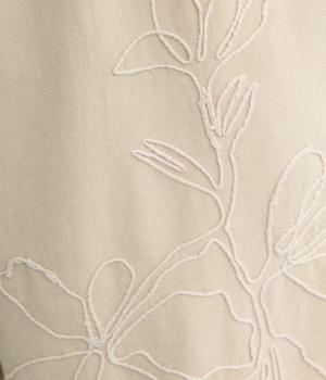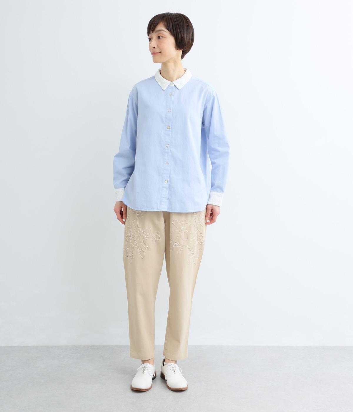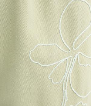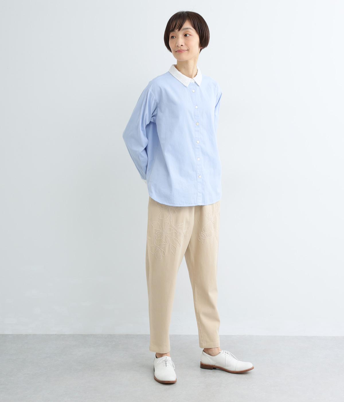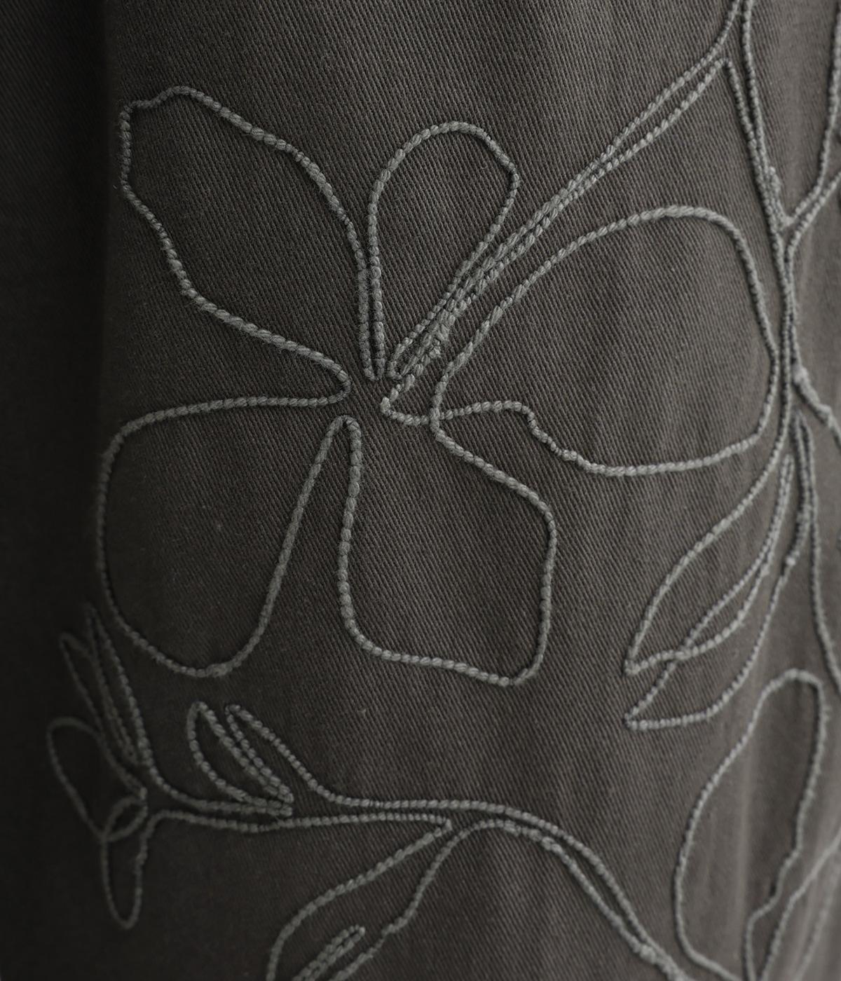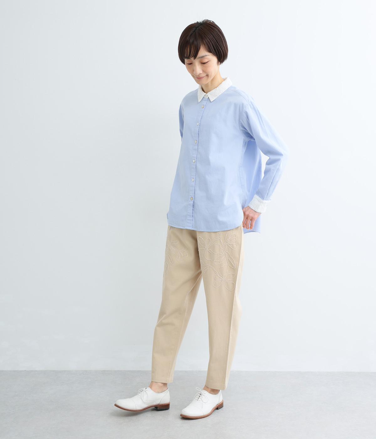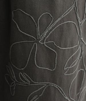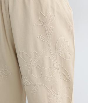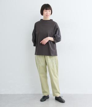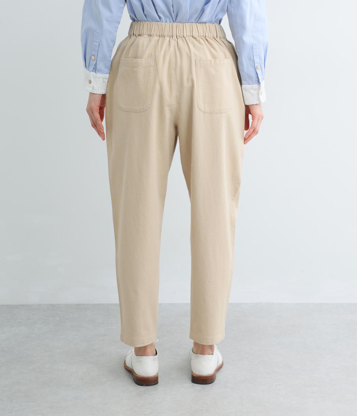 フロントに施したスミレの刺しゅうが、やさしいニュアンスを添えるデザインです。腰まわりにゆとりを持たせつつ、裾にかけてすっきりとしたテーパードシルエットでバランスよく仕上げています。ウエストはゴム仕様で着用感も快適。ベルトループつきなので、コーディネートの幅も広がります。