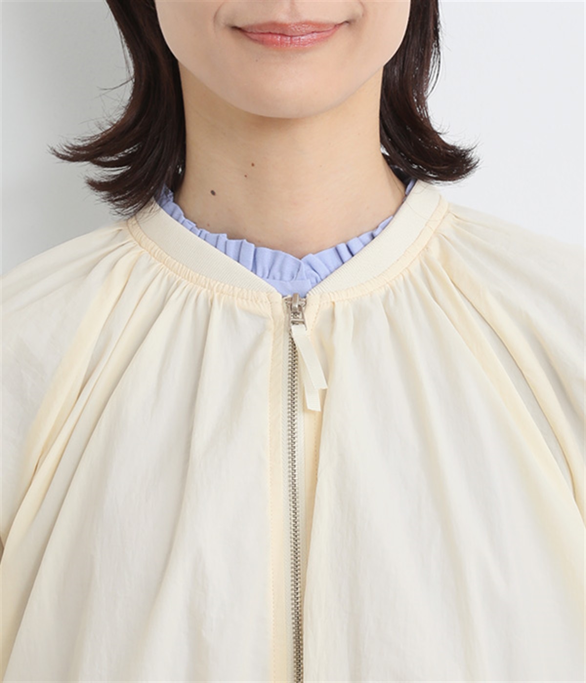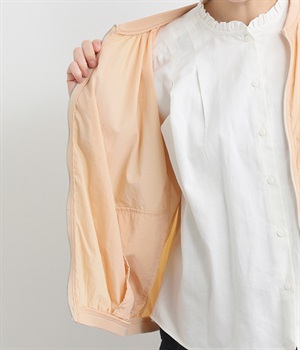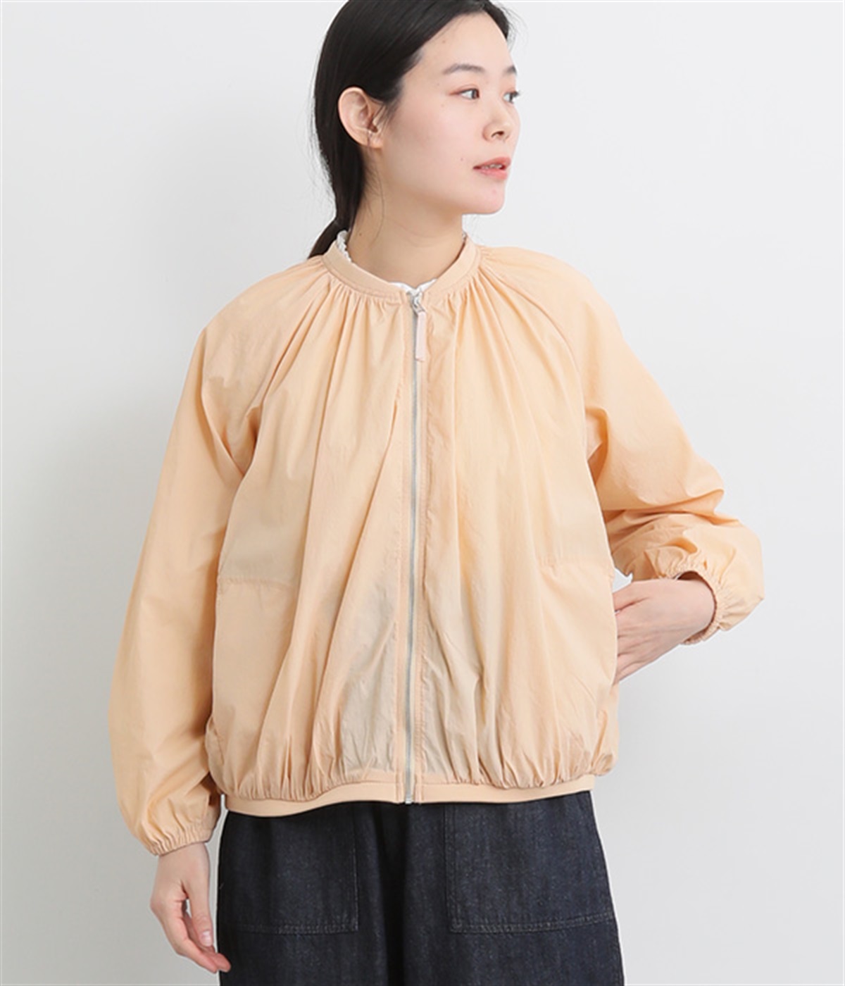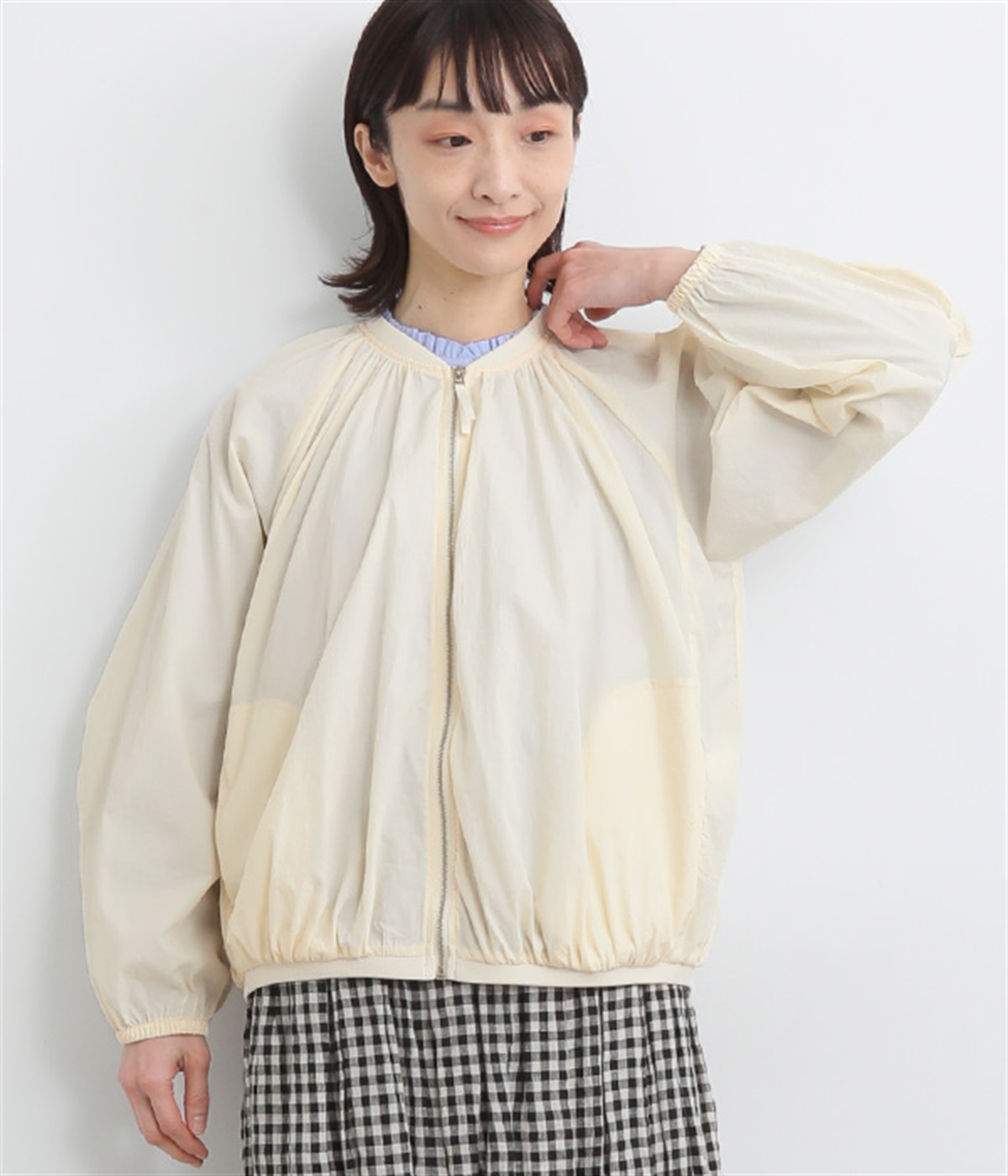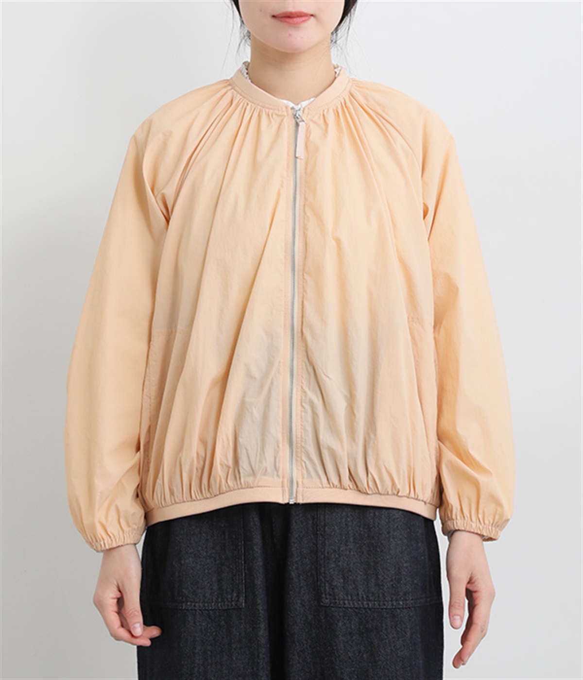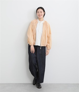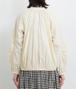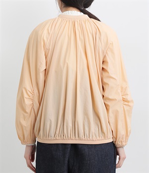 ネック、裾、袖にギャザーをたっぷりと入れた立体的なシルエットのライトブルゾンです。袖口はゴムシャーリングで、襟と裾のリブ使いがカジュアルな印象です。カーディガン感覚で気軽に羽織れて、シアー素材でお洒落着用にアップデート。