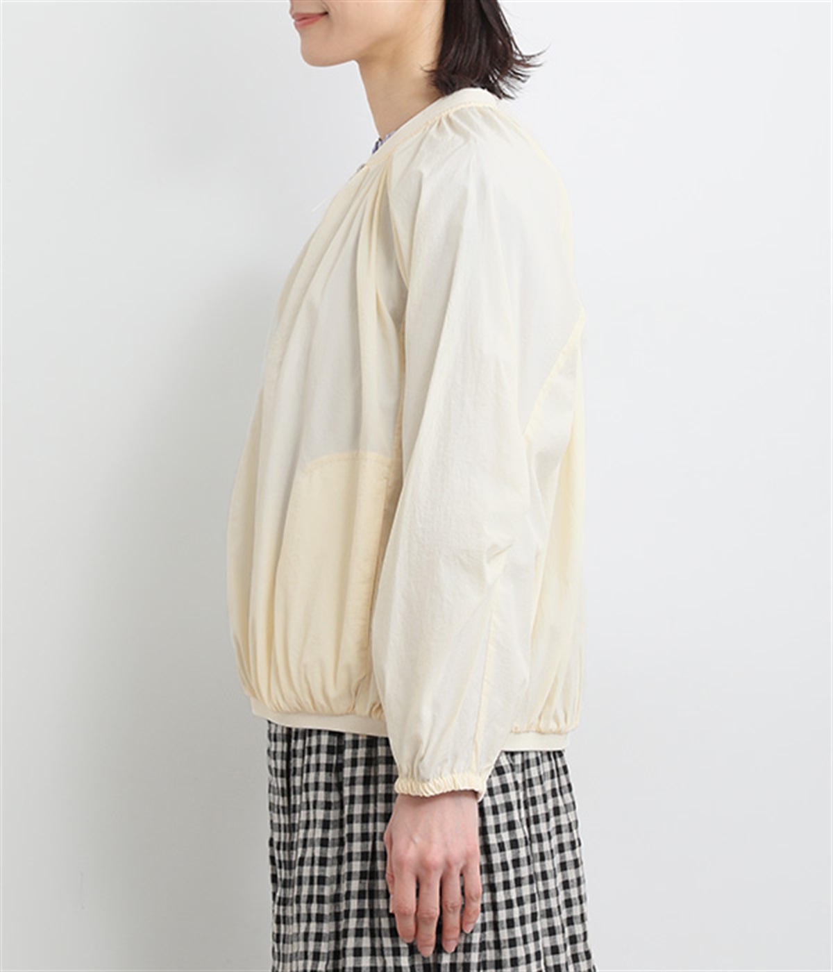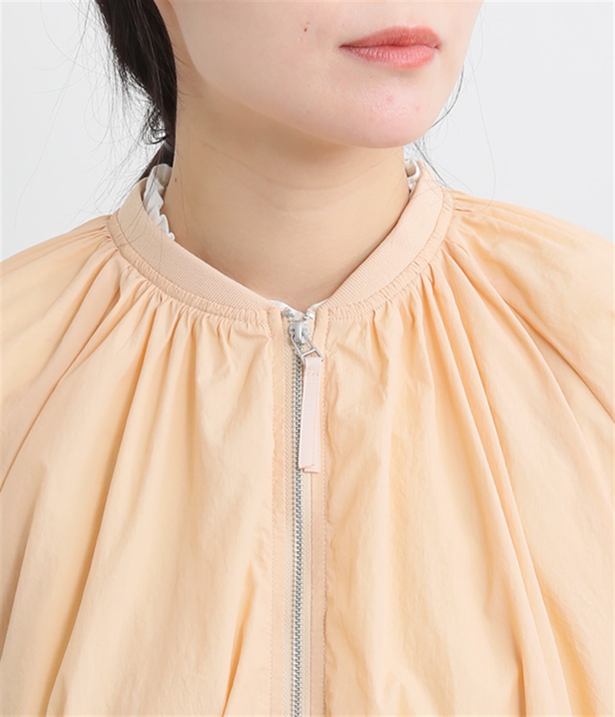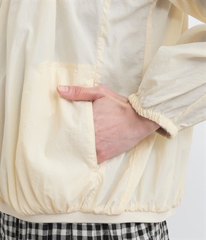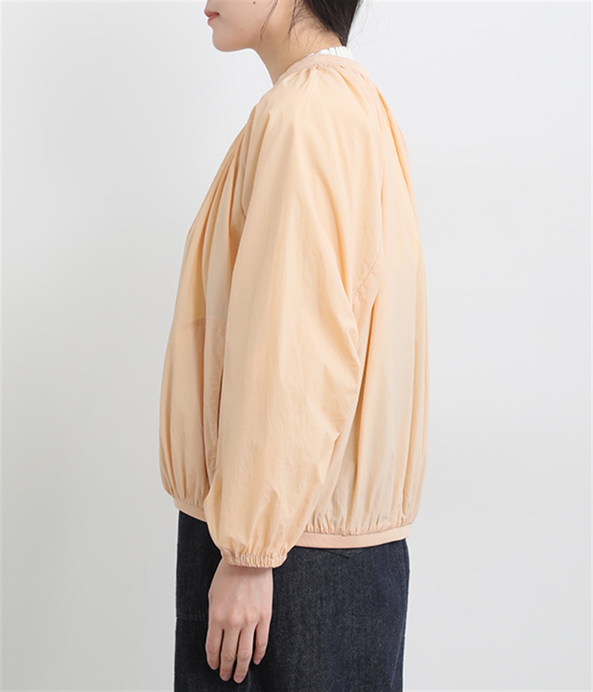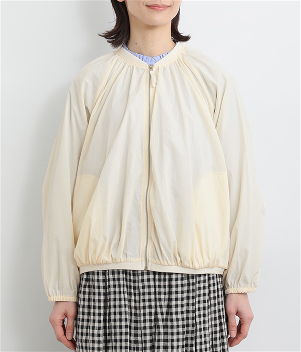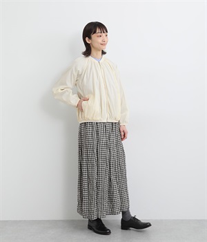 ネック、裾、袖にギャザーをたっぷりと入れた立体的なシルエットのライトブルゾンです。袖口はゴムシャーリングで、襟と裾のリブ使いがカジュアルな印象です。カーディガン感覚で気軽に羽織れて、シアー素材でお洒落着用にアップデート。