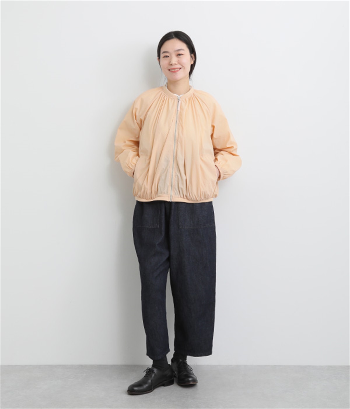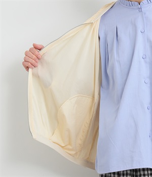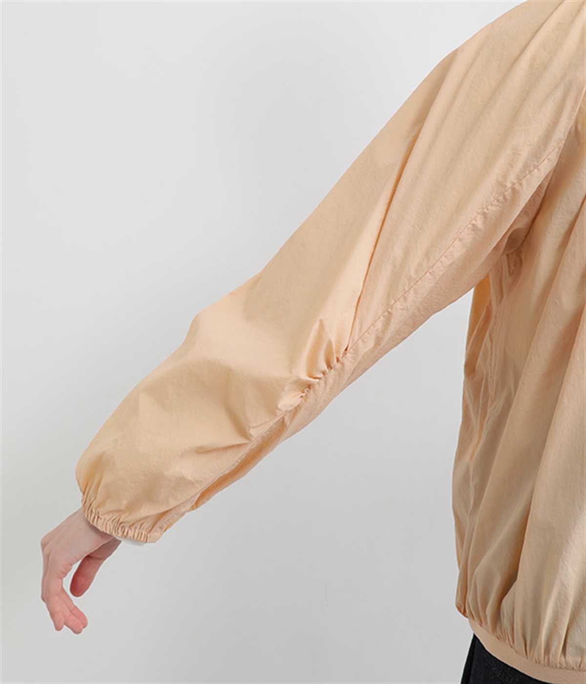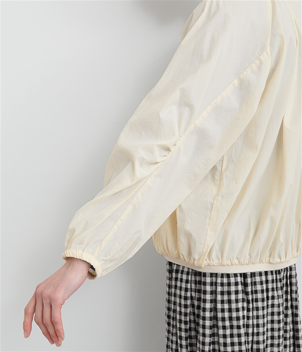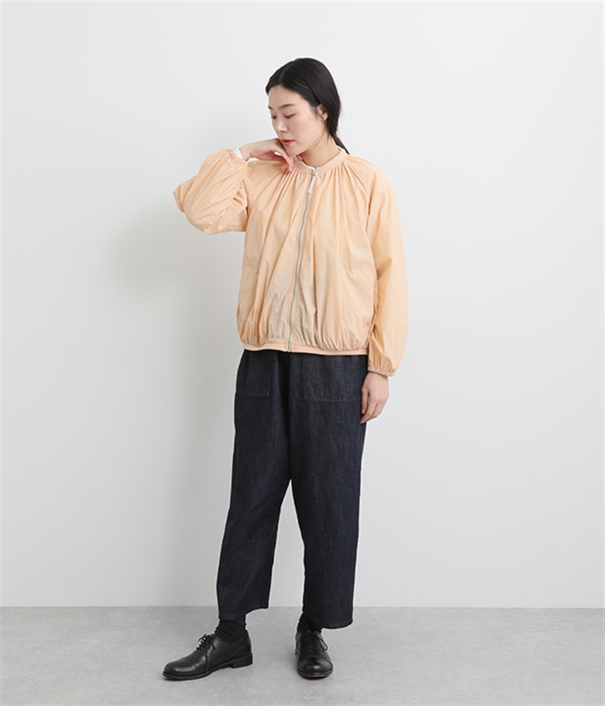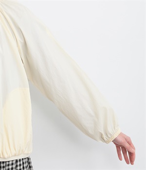 ネック、裾、袖にギャザーをたっぷりと入れた立体的なシルエットのライトブルゾンです。袖口はゴムシャーリングで、襟と裾のリブ使いがカジュアルな印象です。カーディガン感覚で気軽に羽織れて、シアー素材でお洒落着用にアップデート。