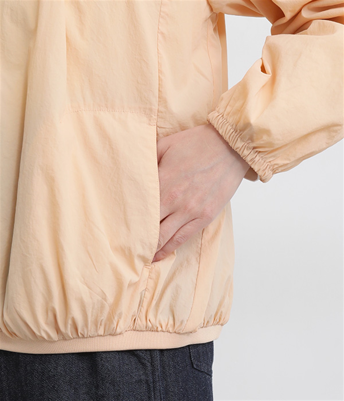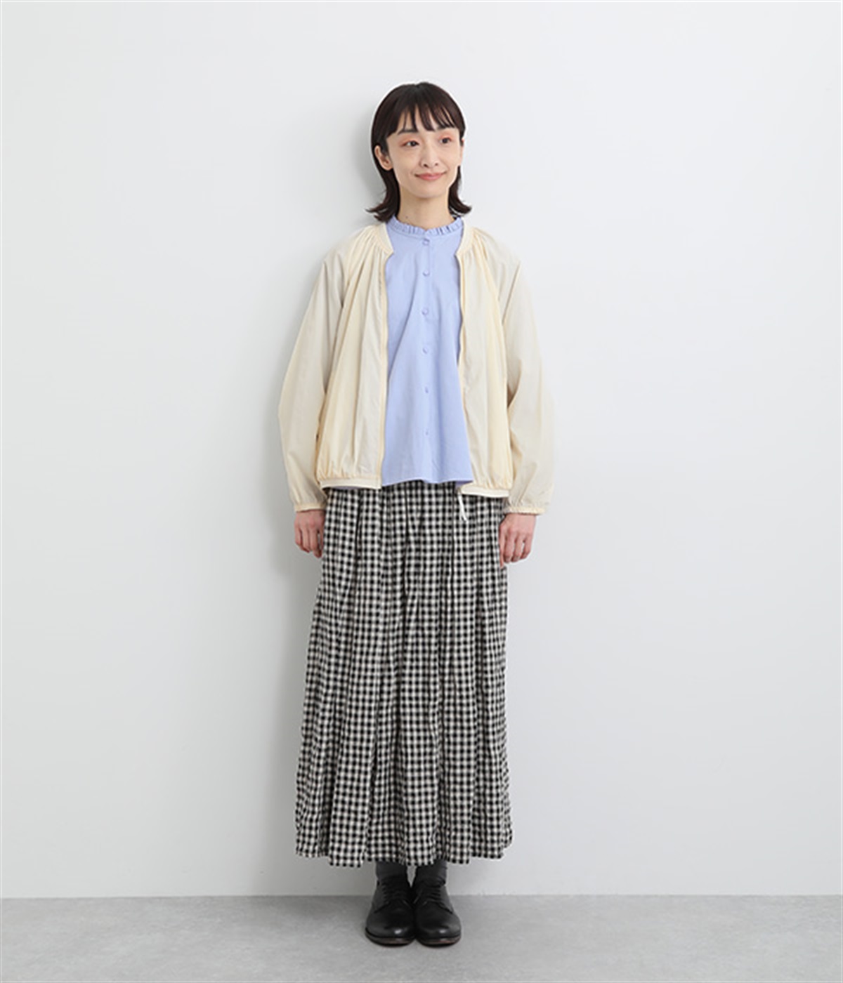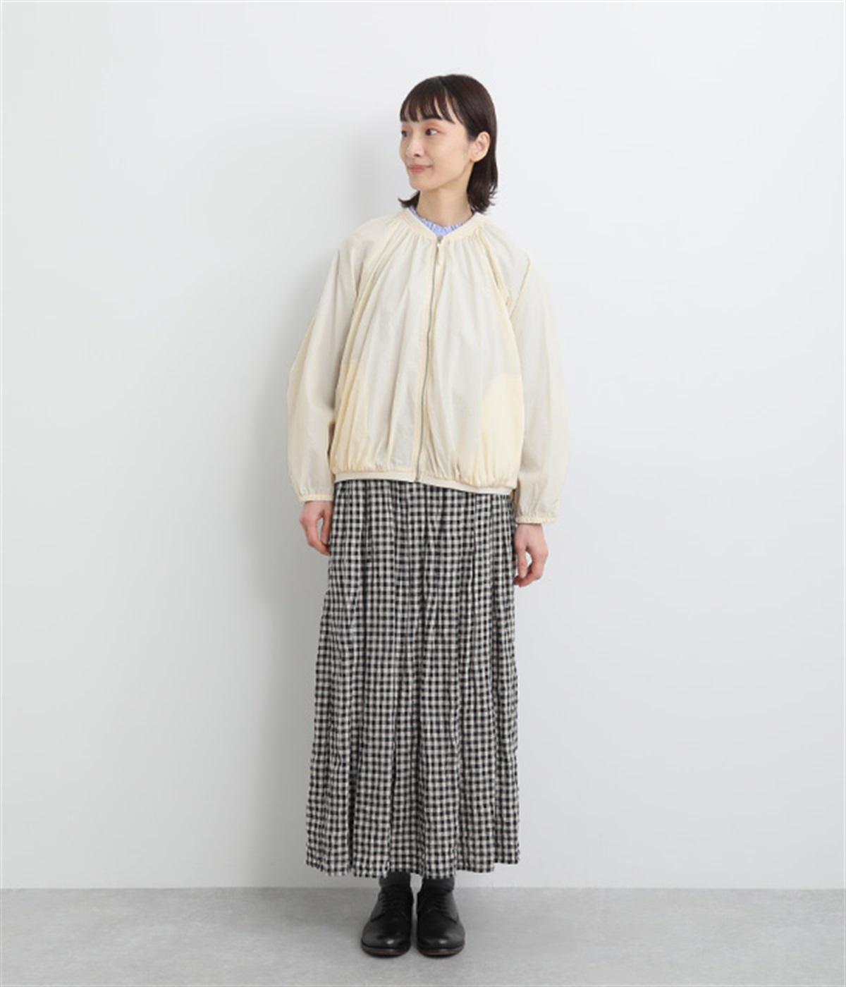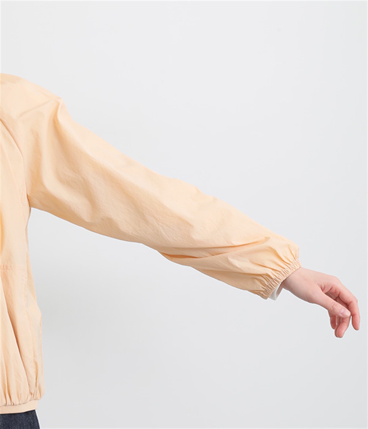 ネック、裾、袖にギャザーをたっぷりと入れた立体的なシルエットのライトブルゾンです。袖口はゴムシャーリングで、襟と裾のリブ使いがカジュアルな印象です。カーディガン感覚で気軽に羽織れて、シアー素材でお洒落着用にアップデート。