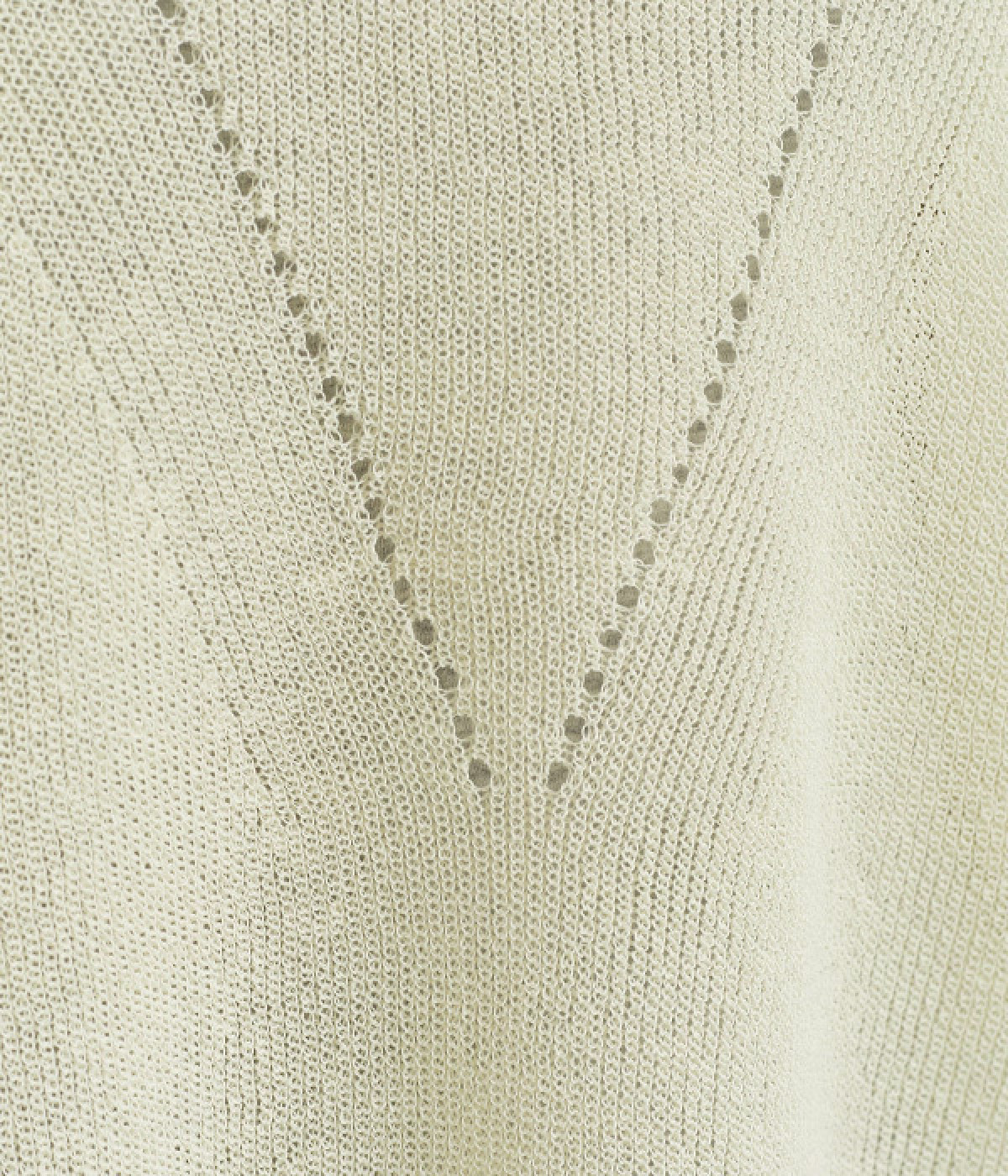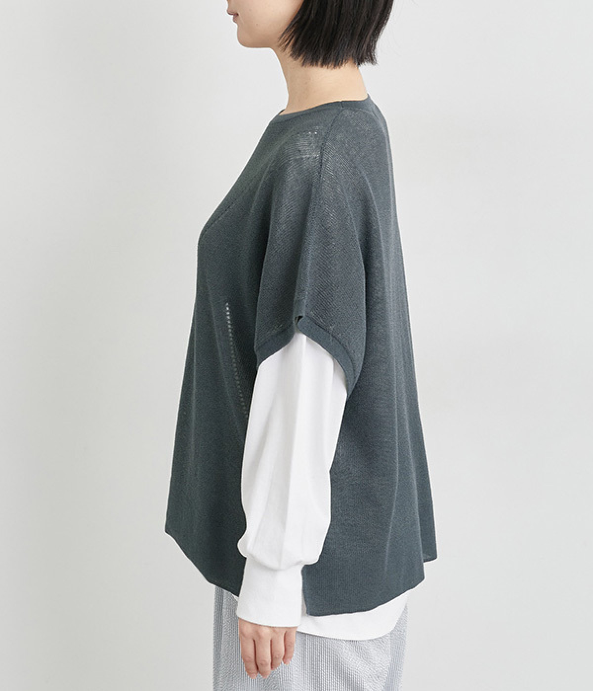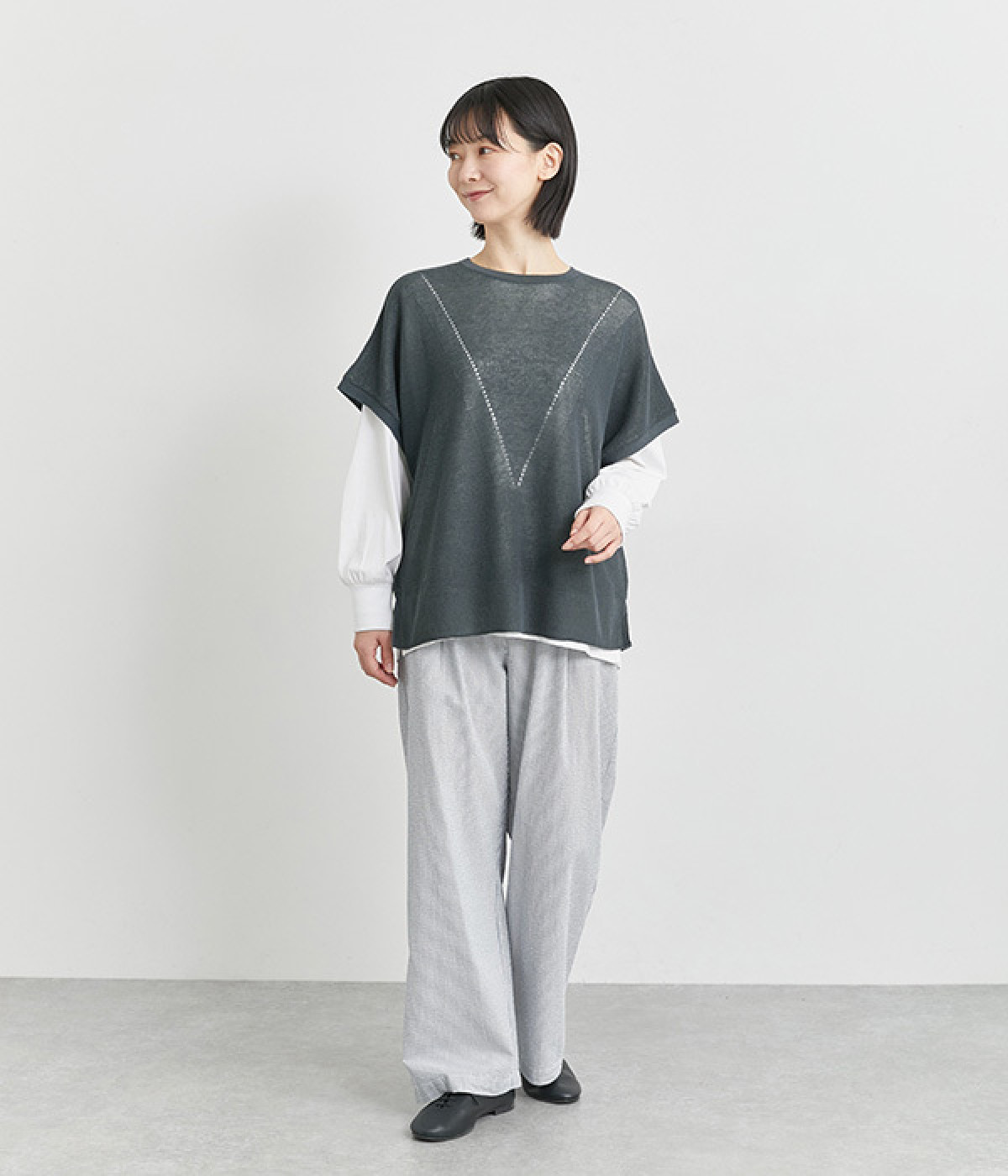 アイレットでさり気なく模様を入れたシンプルなニットベストです。ゆったりとしたオーバーサイズでさまざまなアイテムと合わせやすく、透け感があるので重たく見えずあたたかな季節もレイヤードしやすい仕上がりです。