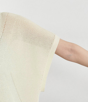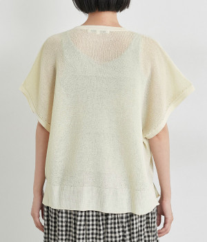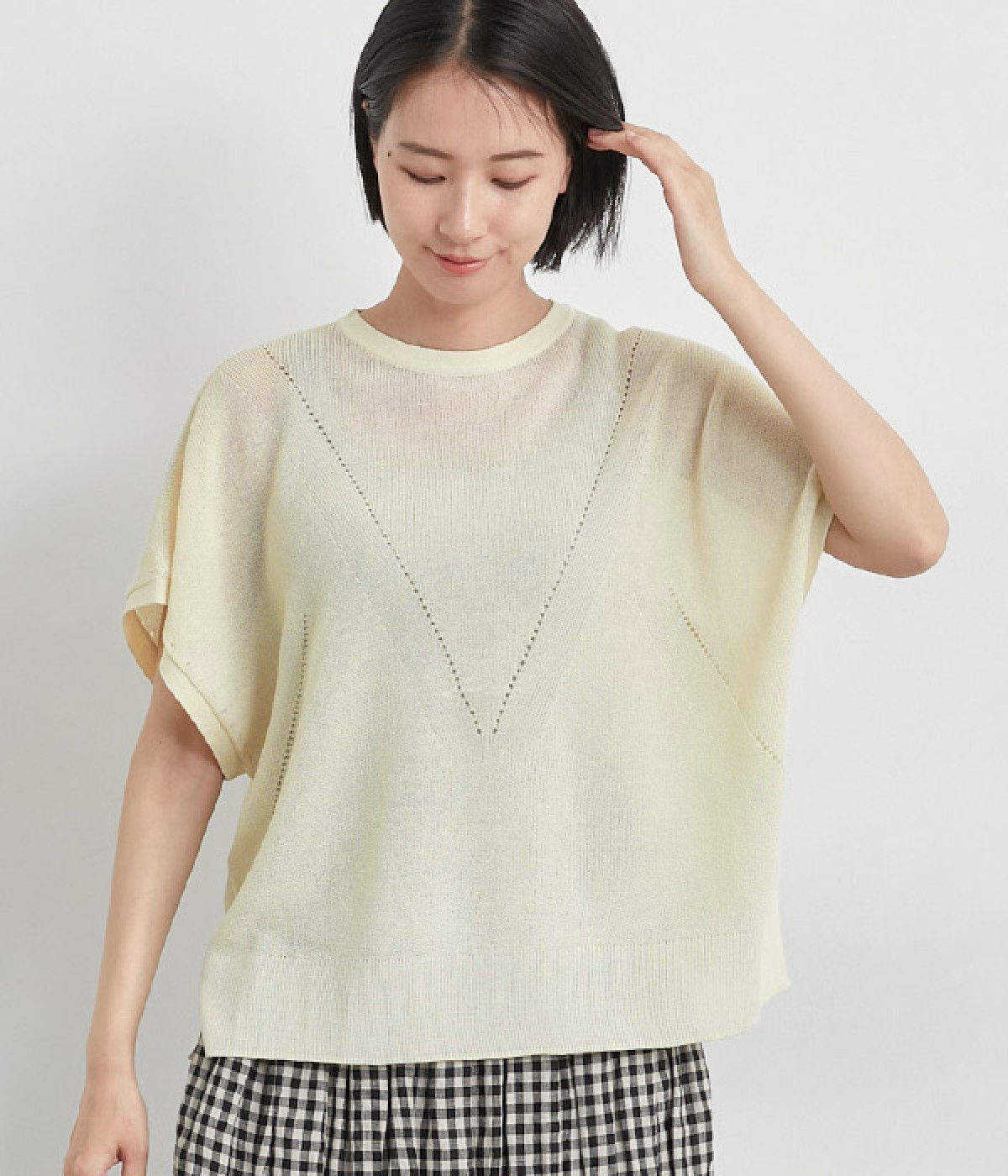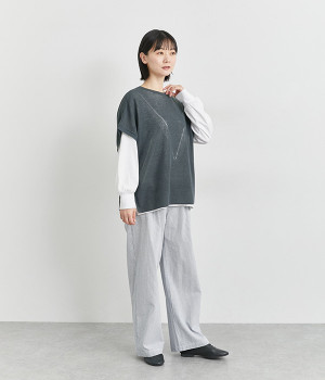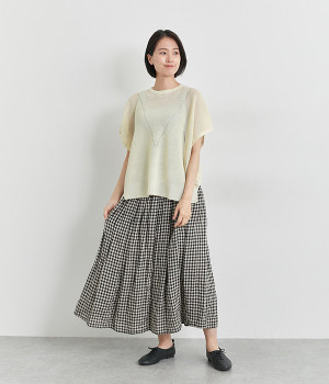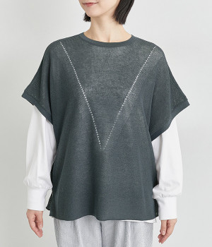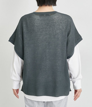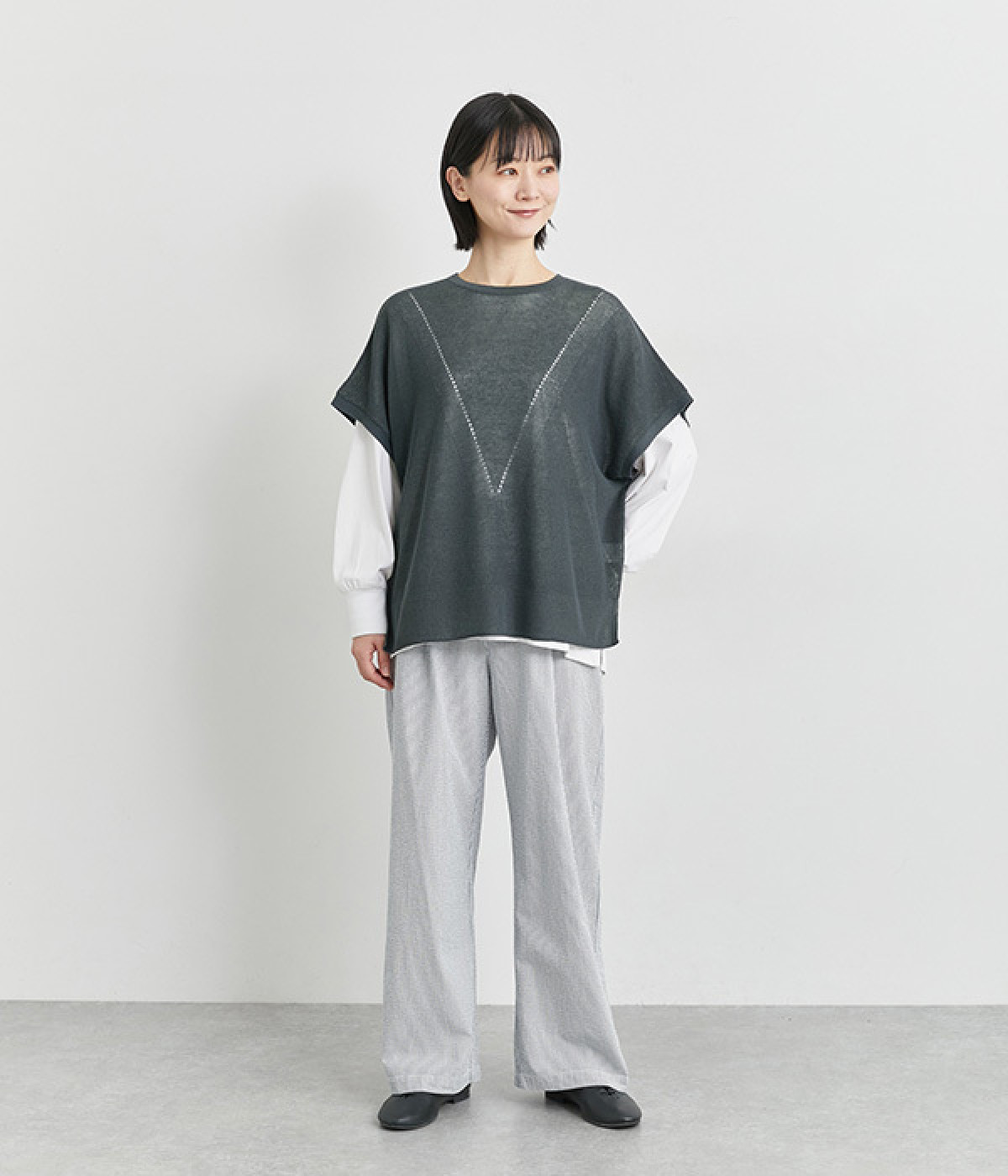 アイレットでさり気なく模様を入れたシンプルなニットベストです。ゆったりとしたオーバーサイズでさまざまなアイテムと合わせやすく、透け感があるので重たく見えずあたたかな季節もレイヤードしやすい仕上がりです。