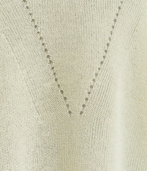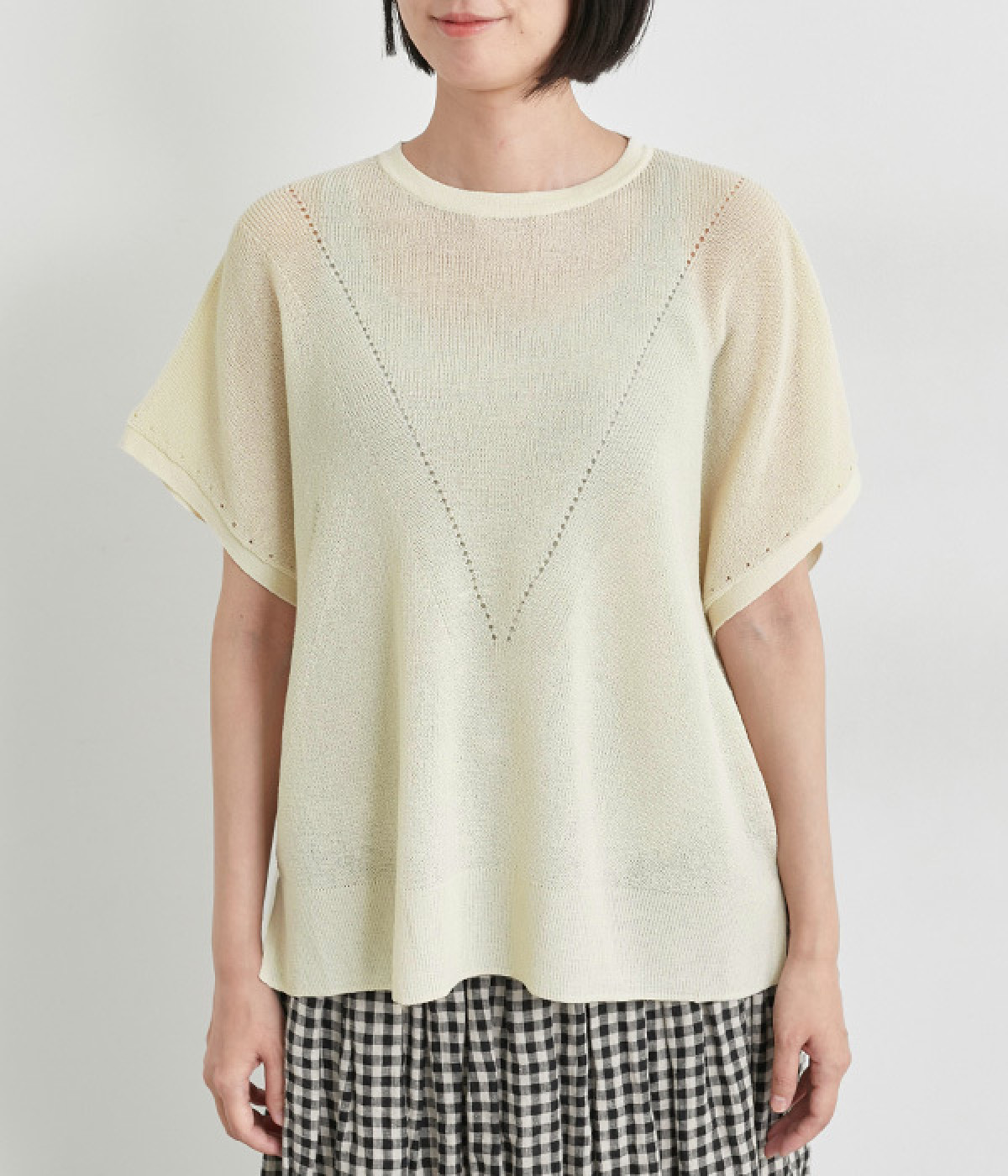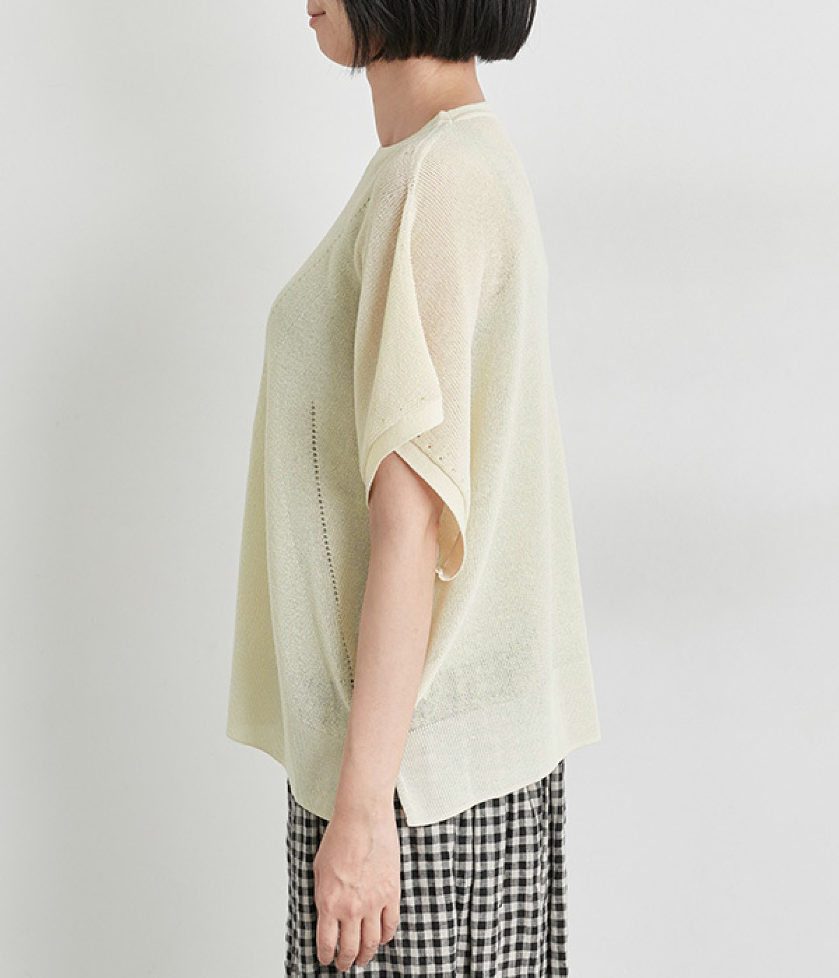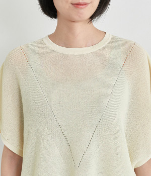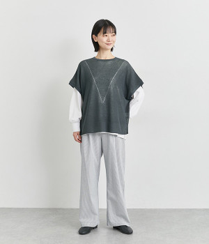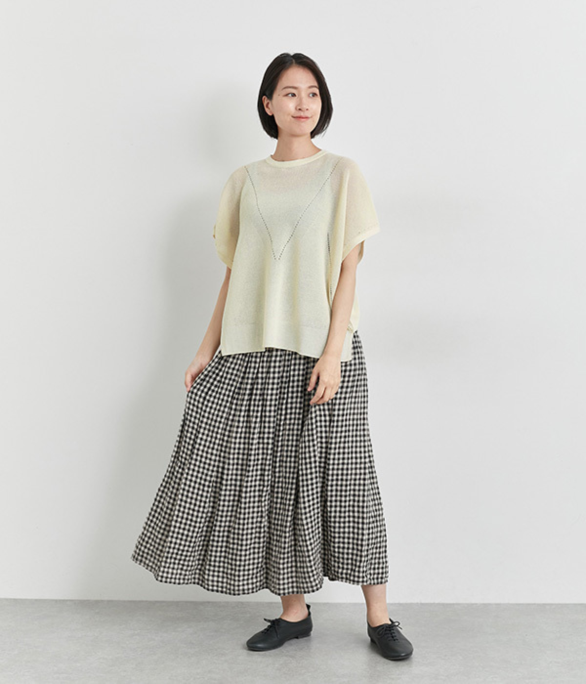 少量のリネンをブレンドさせてナチュラルさを盛り込みました。凹凸のある肌触りや伸縮性が着心地の良さを高めます。ニット製品ながらご家庭での洗濯が可能なのもうれしいポイントです。