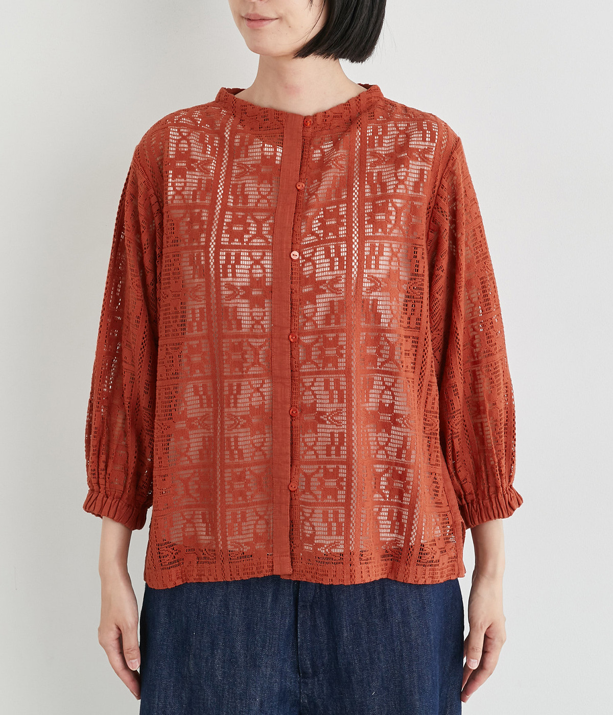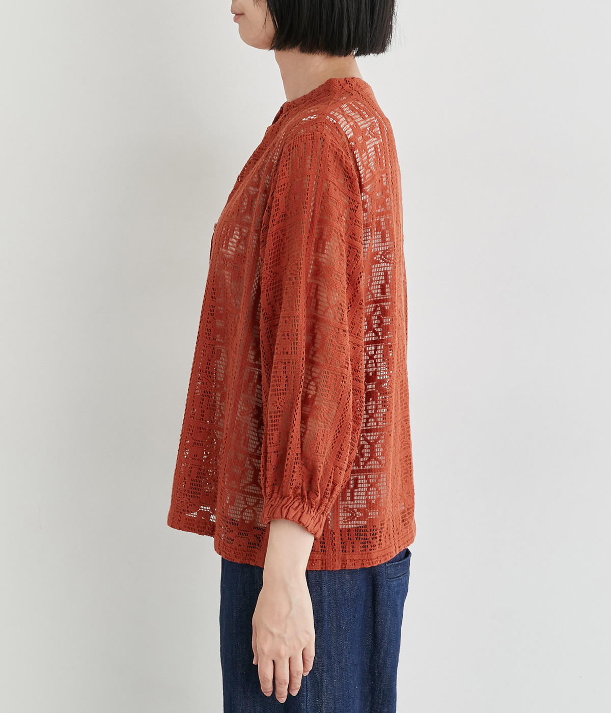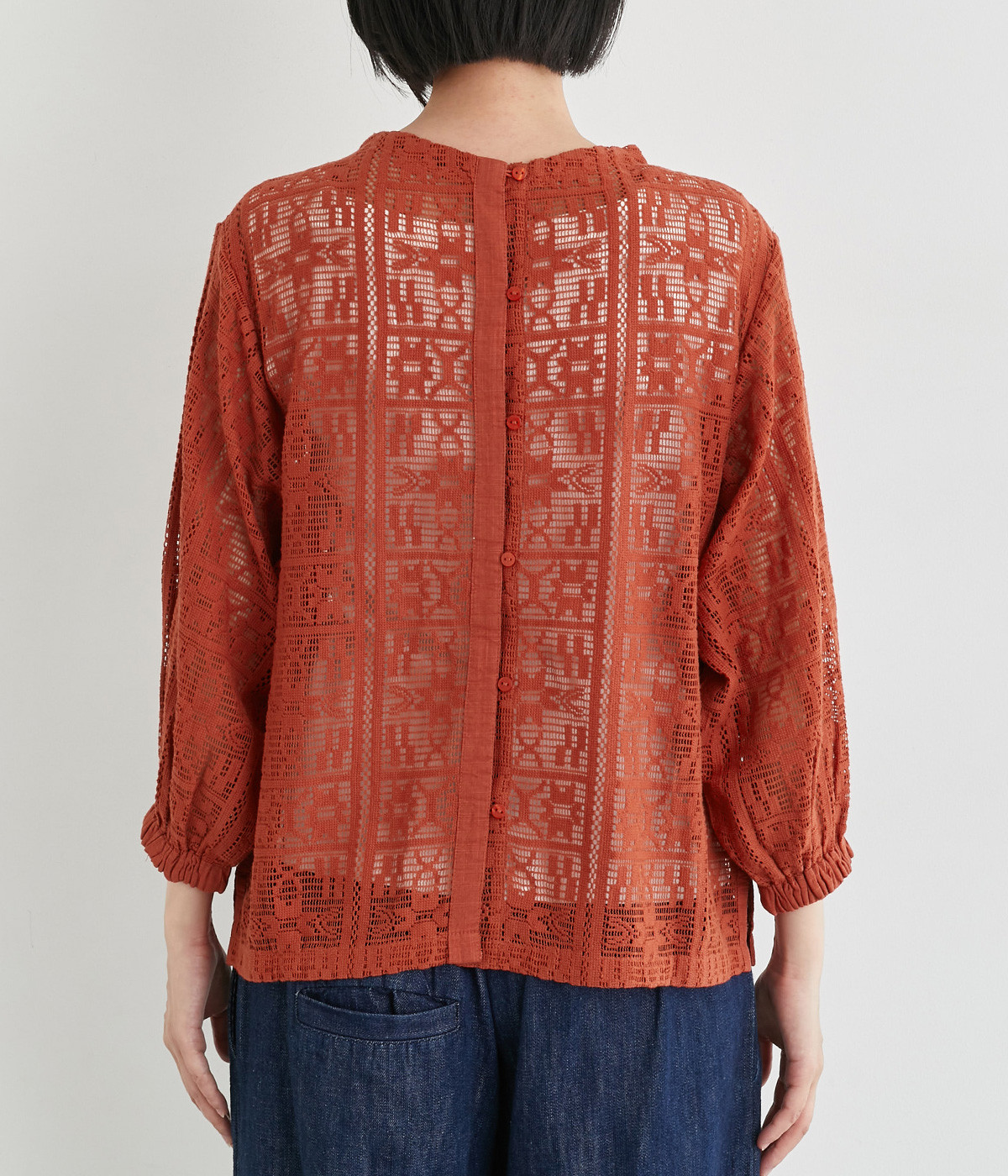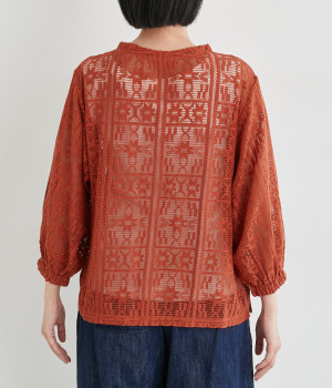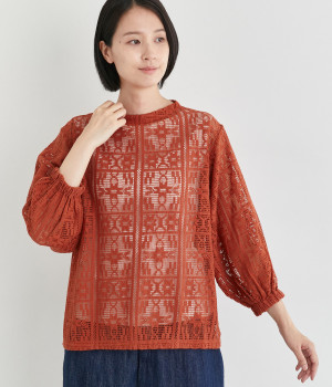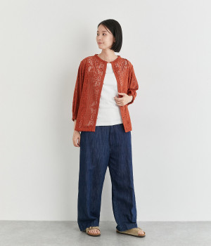 さらりとしてナチュラルな風合いが際立つコットンレースを使用しています。インナー合わせがたのしめる透け模様で通気性も良く、あたたかな季節も快適に着用できます。