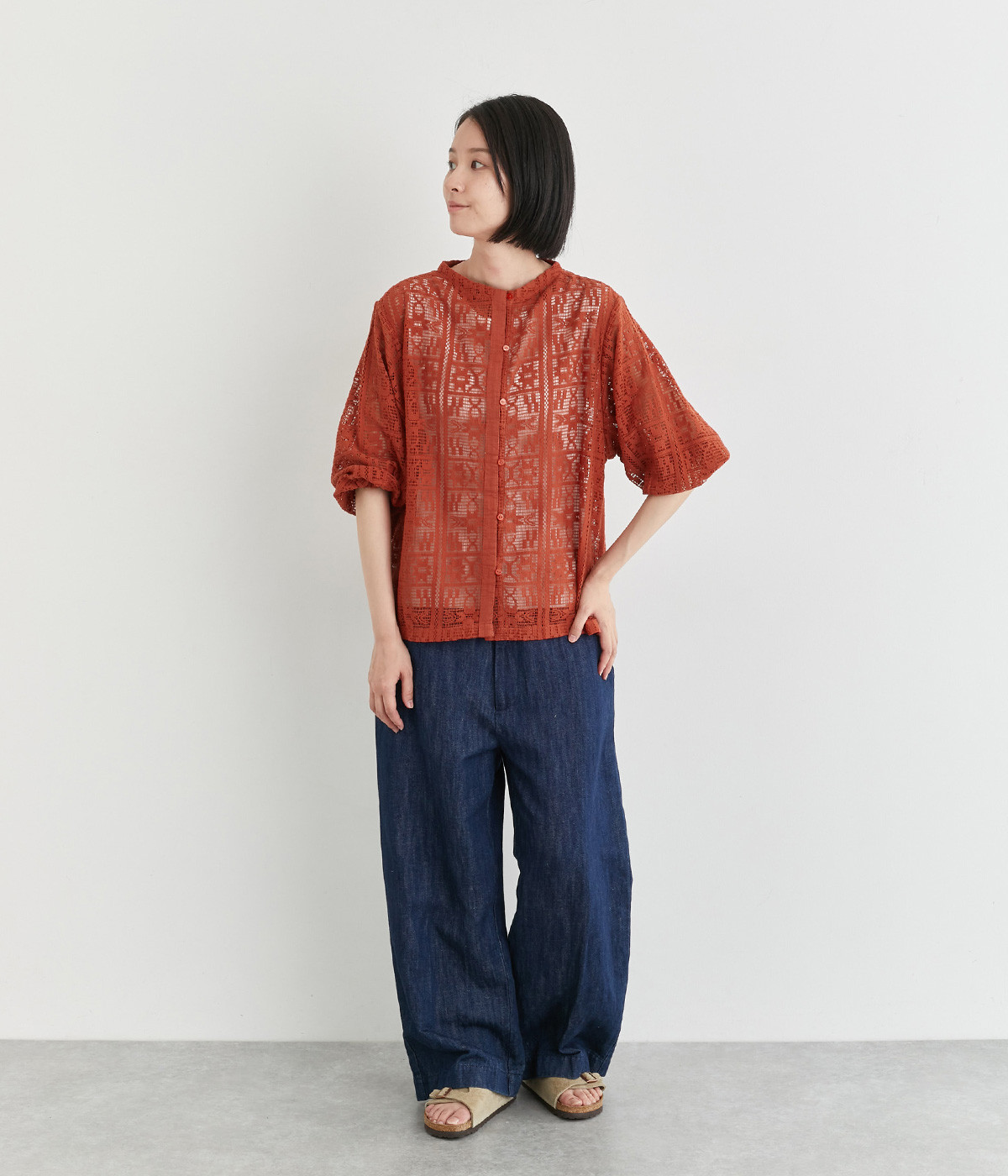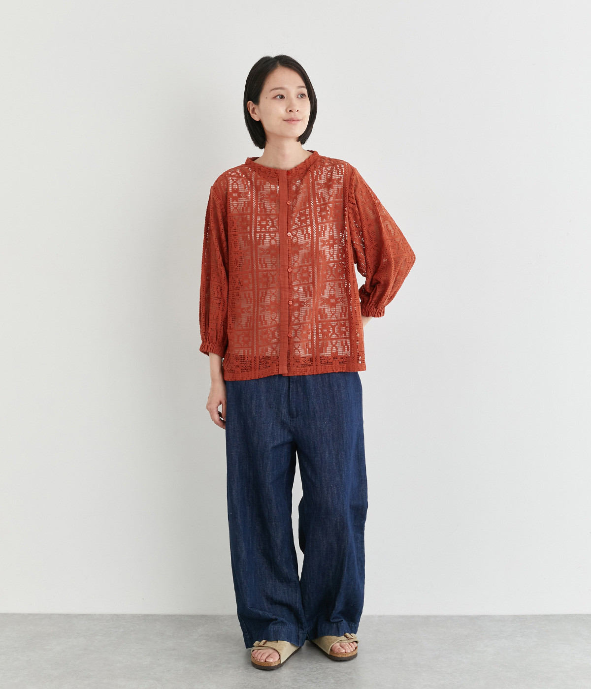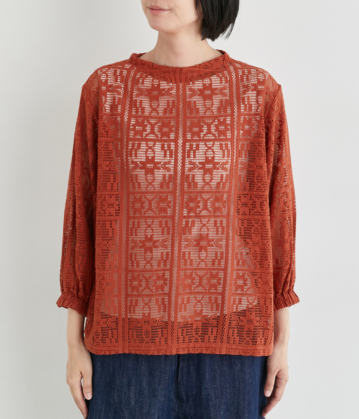 さらりとしてナチュラルな風合いが際立つコットンレースを使用しています。インナー合わせがたのしめる透け模様で通気性も良く、あたたかな季節も快適に着用できます。