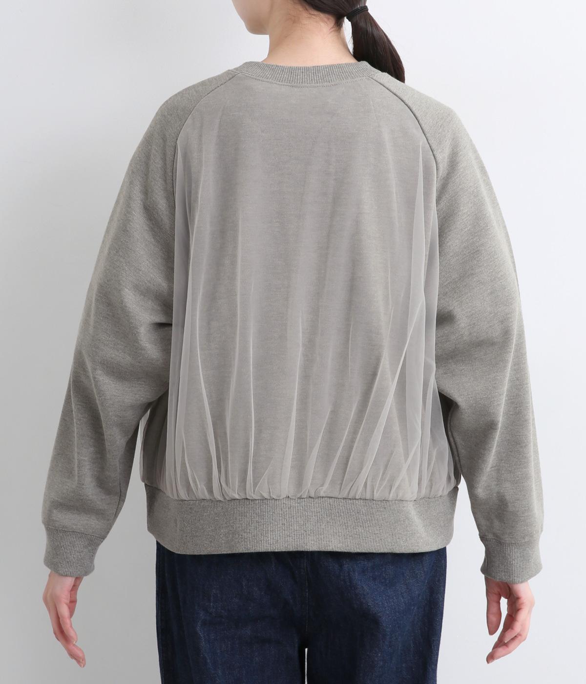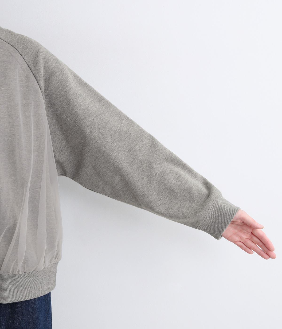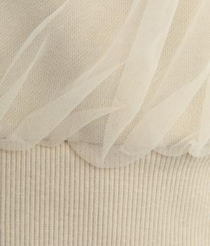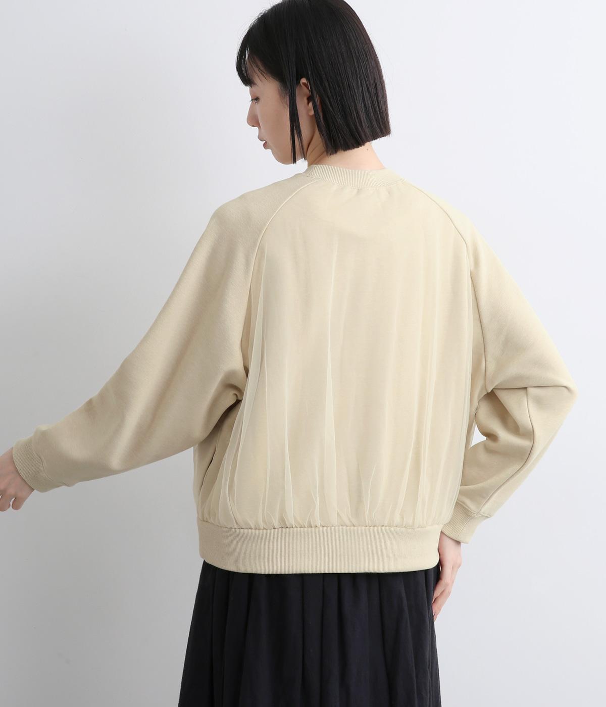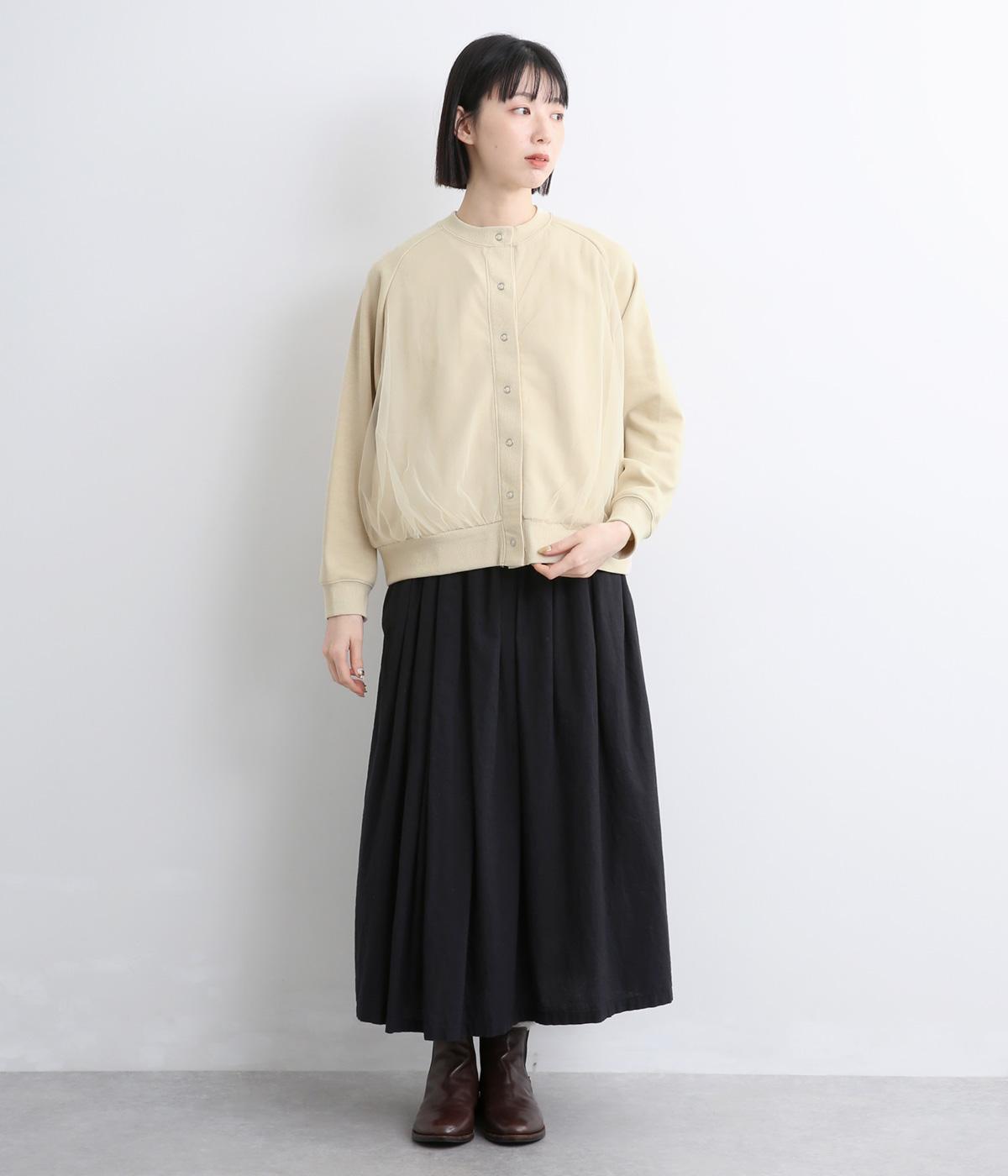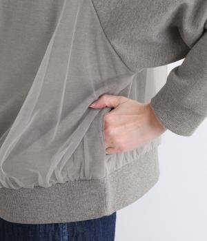 ふっくらとほどよい厚みの混紡生地に前後の身頃に上品なチュールを重ねました。裏起毛でしっかりあたたかく、生地感で軽やかさを出しました。