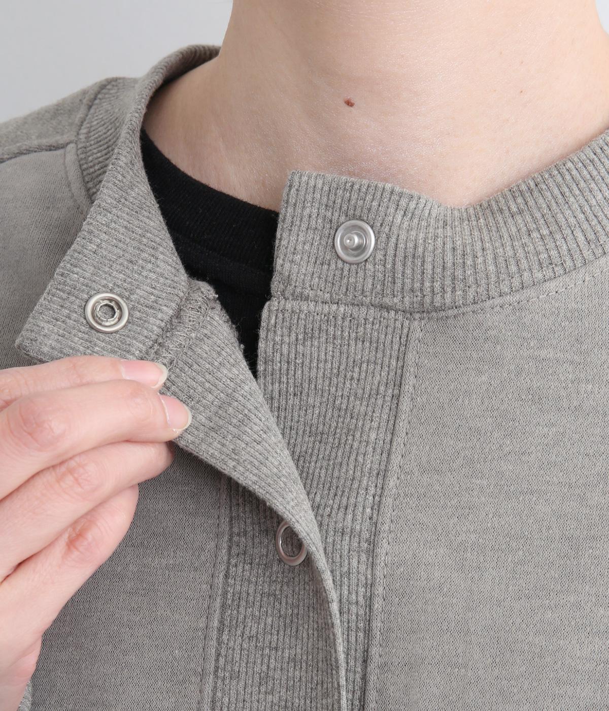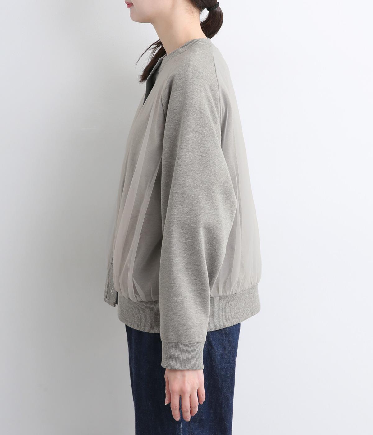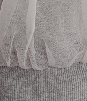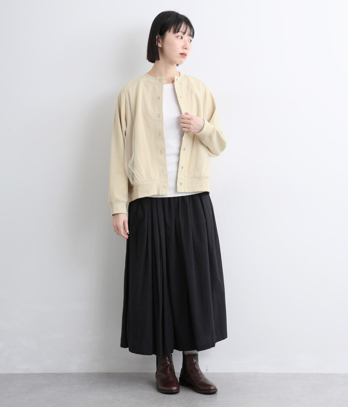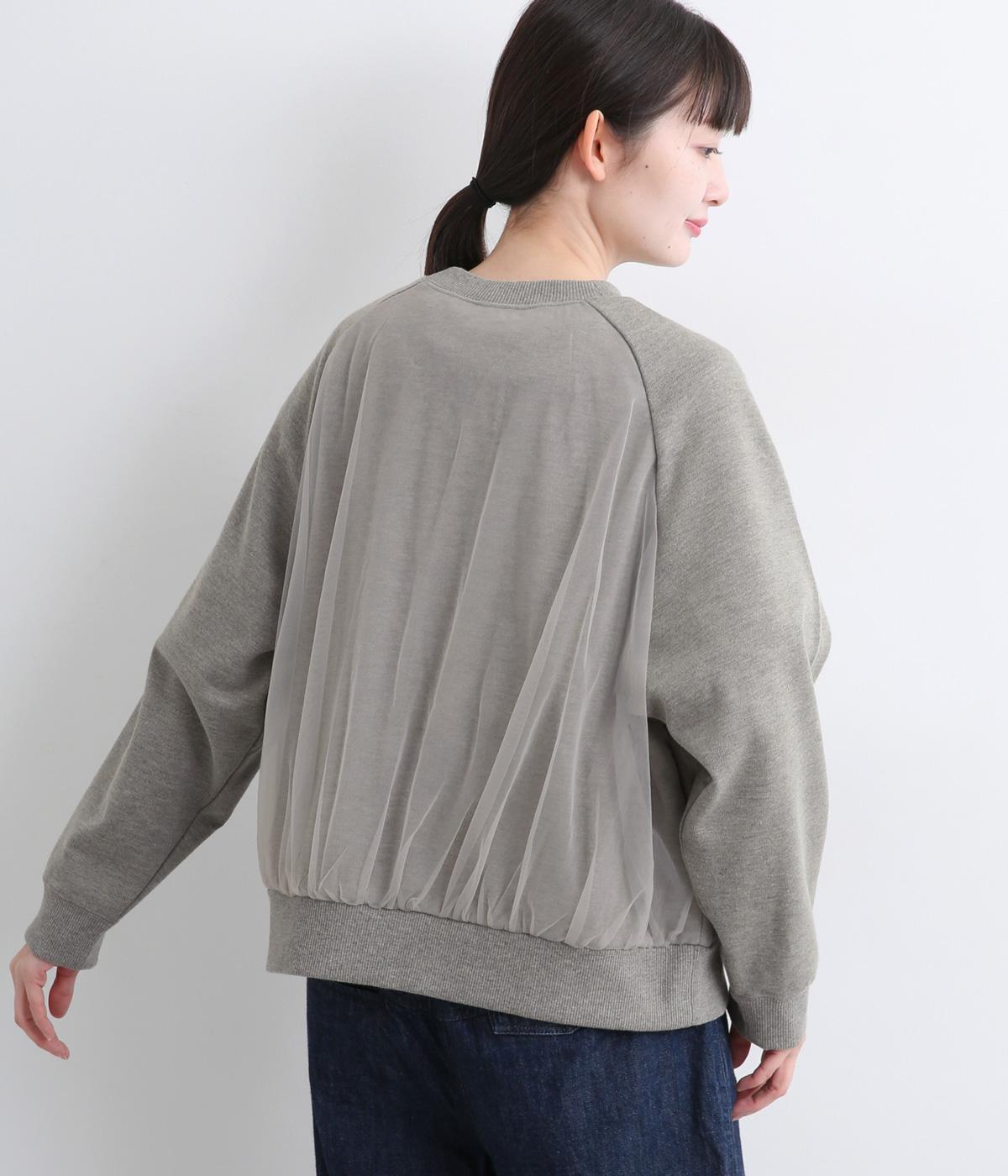 ふっくらとほどよい厚みの混紡生地に前後の身頃に上品なチュールを重ねました。裏起毛でしっかりあたたかく、生地感で軽やかさを出しました。