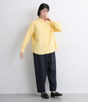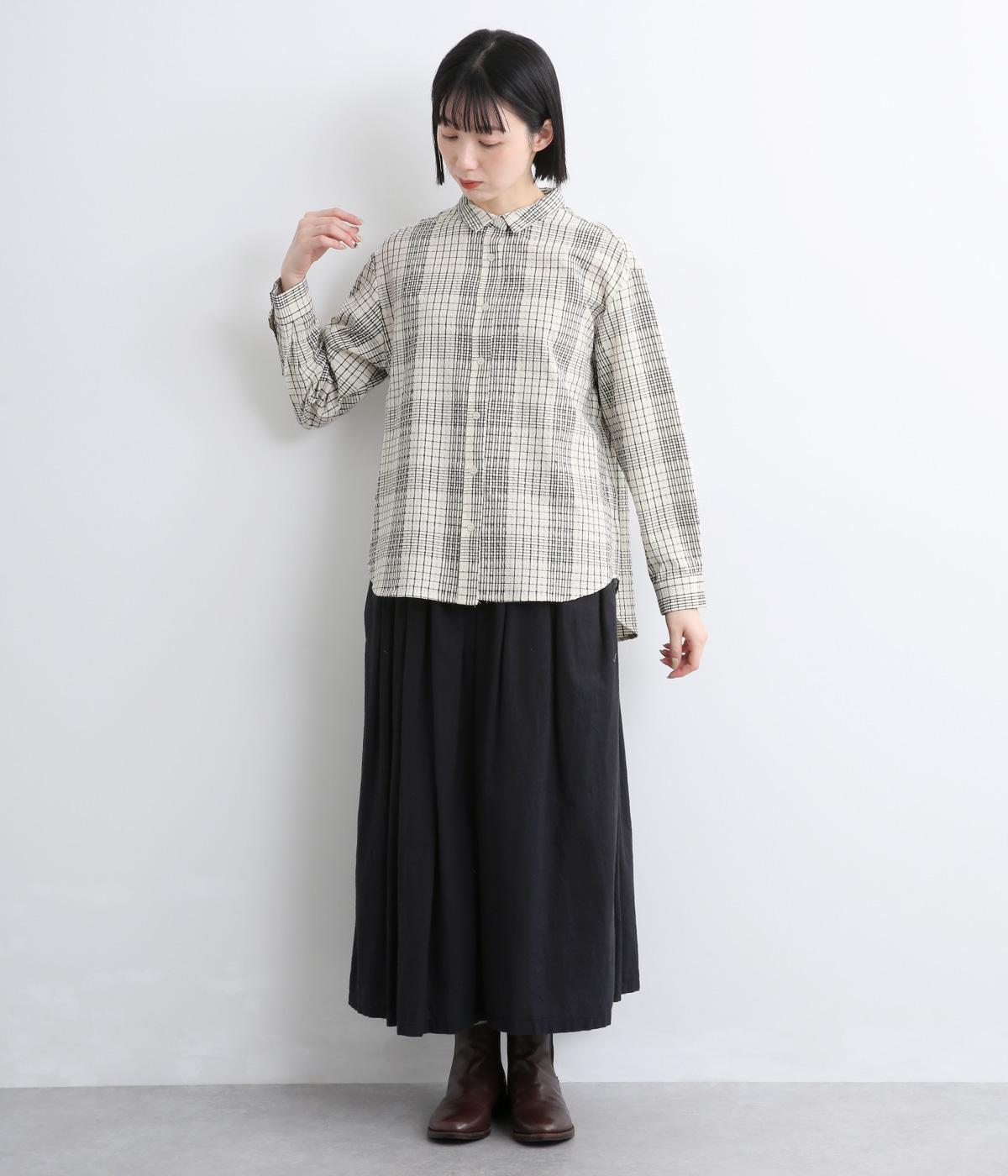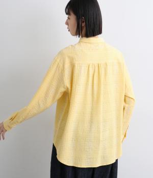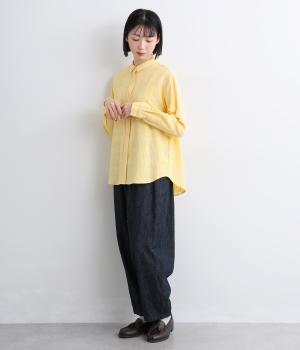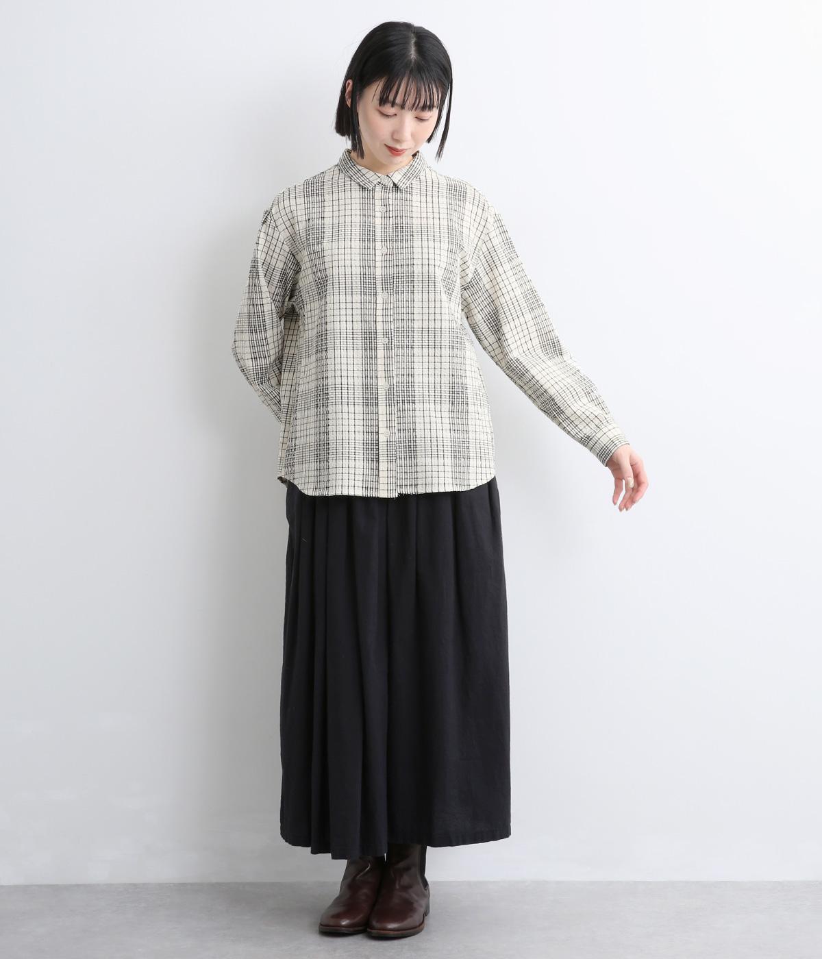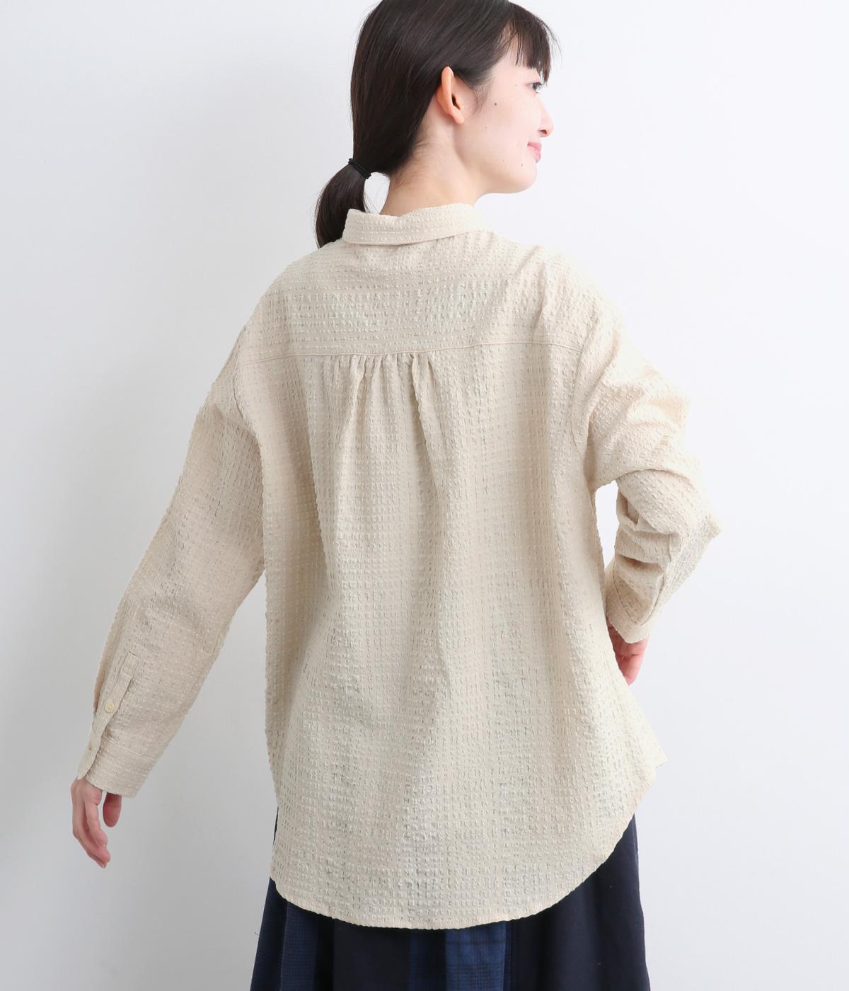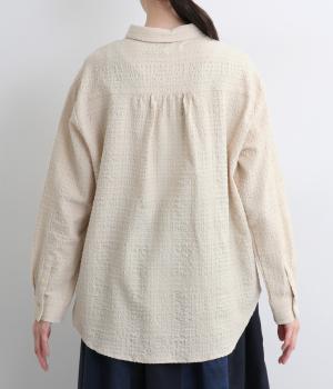 表情のある生地感が、あたたかみのあるやさしい雰囲気を醸すブラウスです。すっきりしたシルエットや小さめの襟でシンプルに仕立てつつ、背中のギャザーや丸みのある裾のラインでリラックス感をプラスしました。