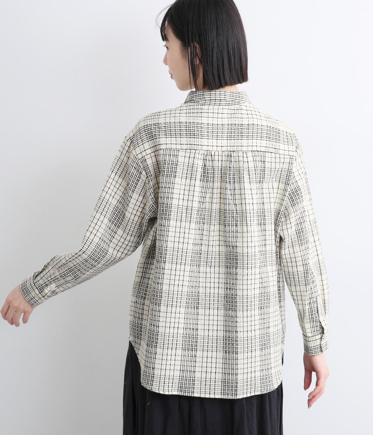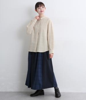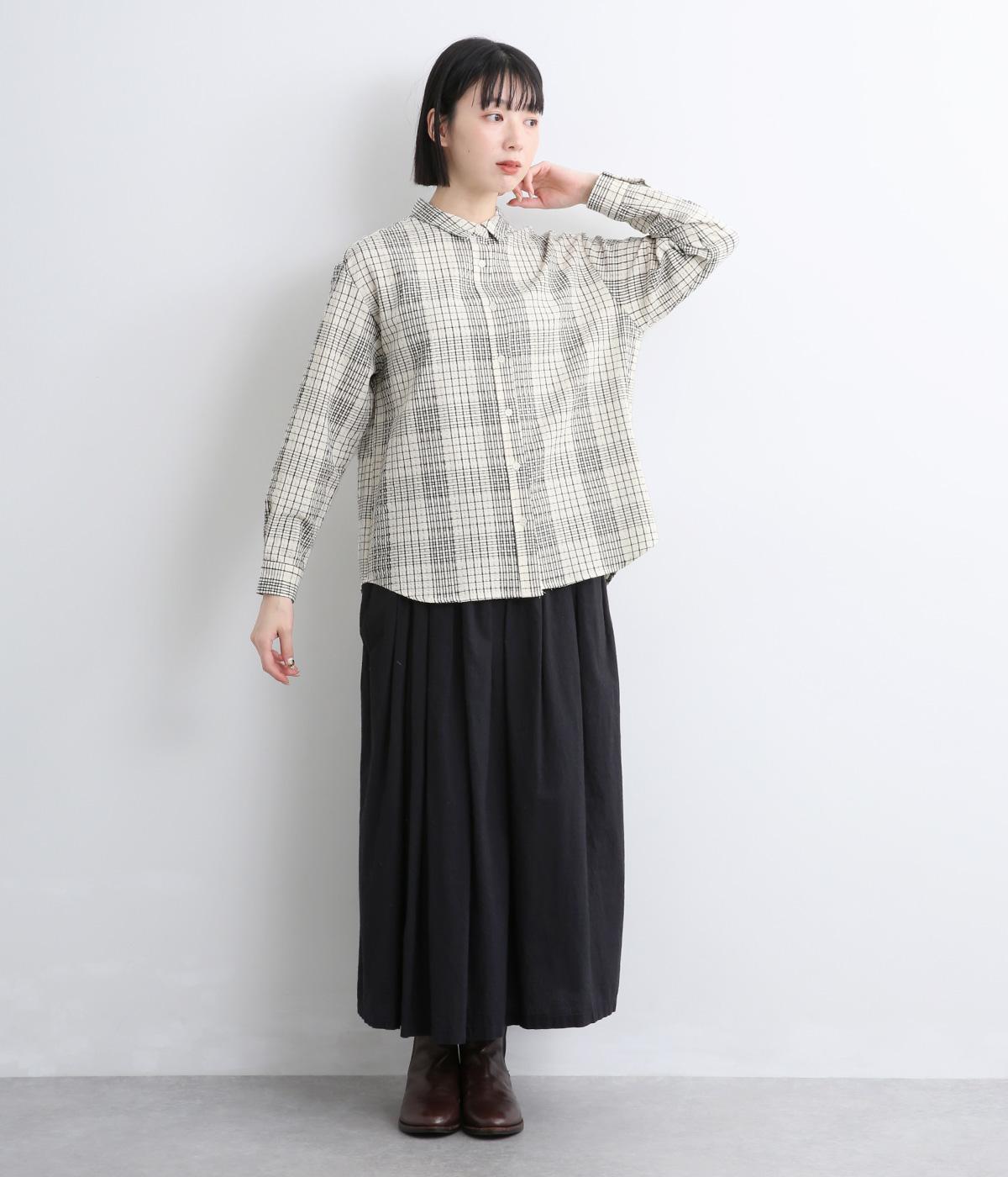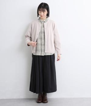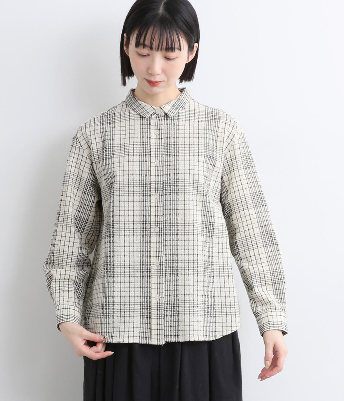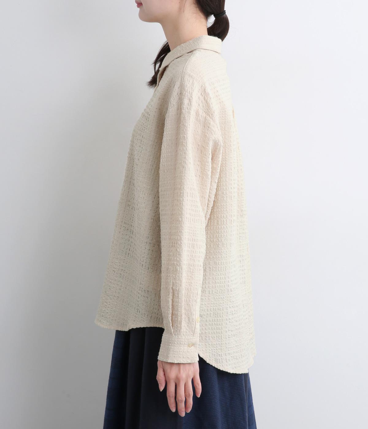 表情のある生地感が、あたたかみのあるやさしい雰囲気を醸すブラウスです。すっきりしたシルエットや小さめの襟でシンプルに仕立てつつ、背中のギャザーや丸みのある裾のラインでリラックス感をプラスしました。