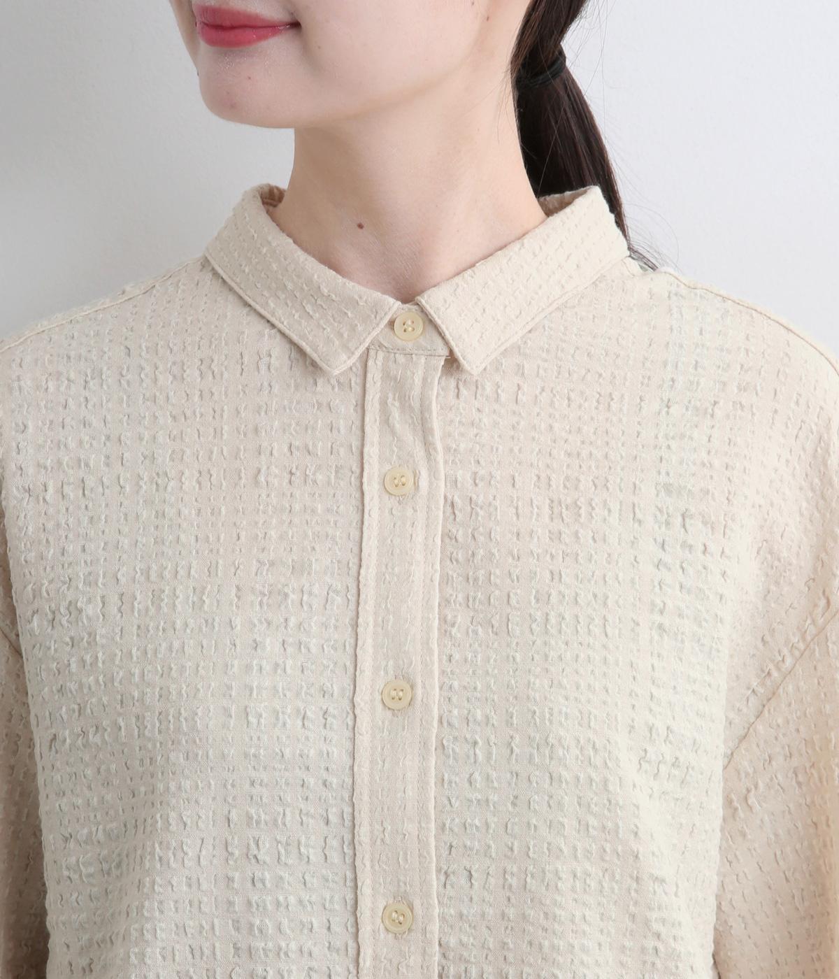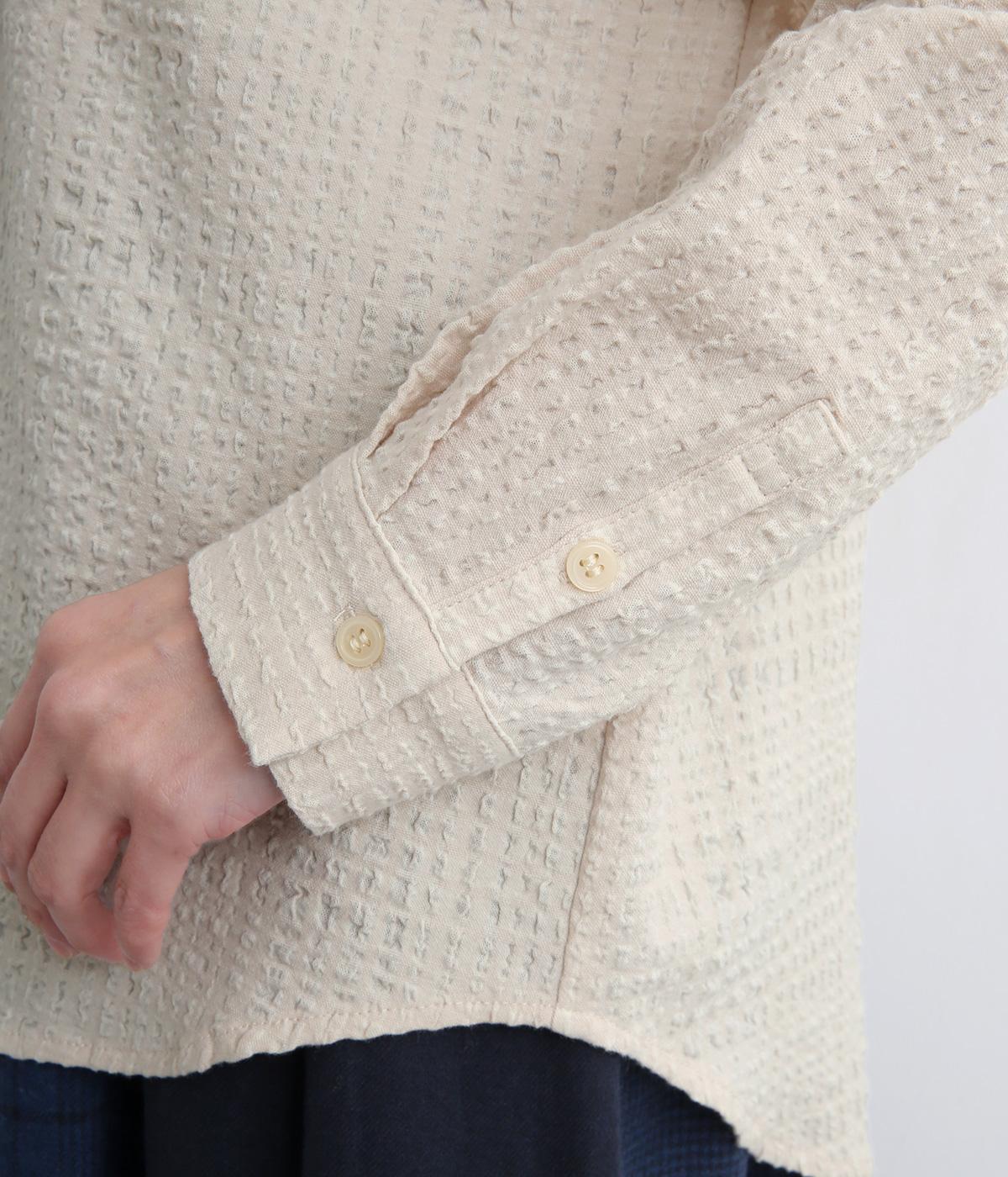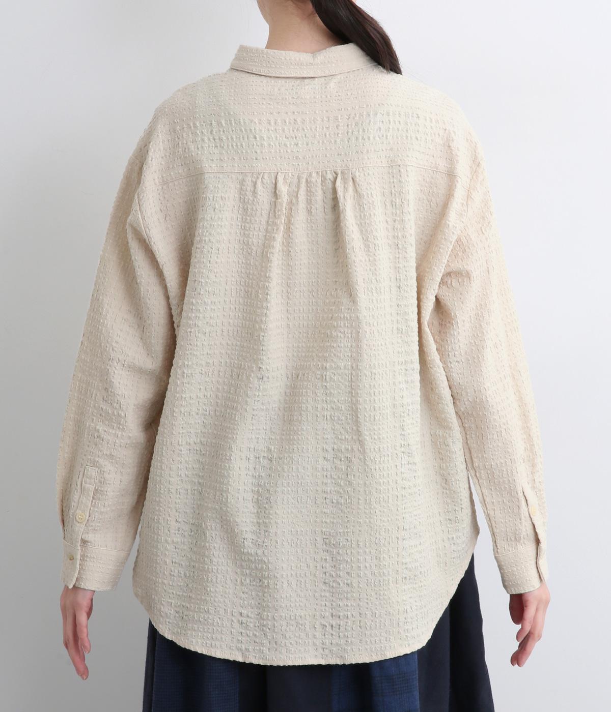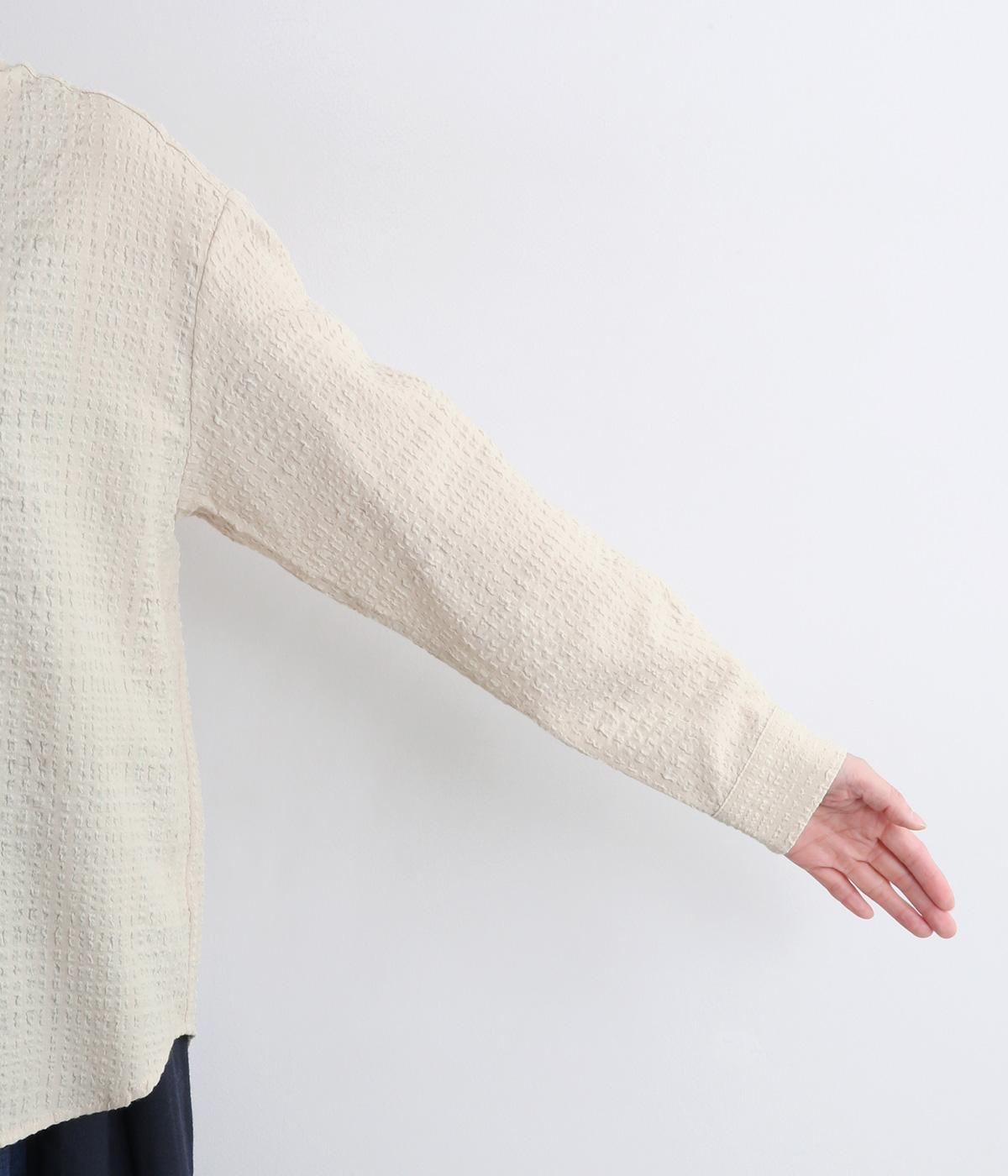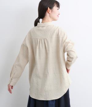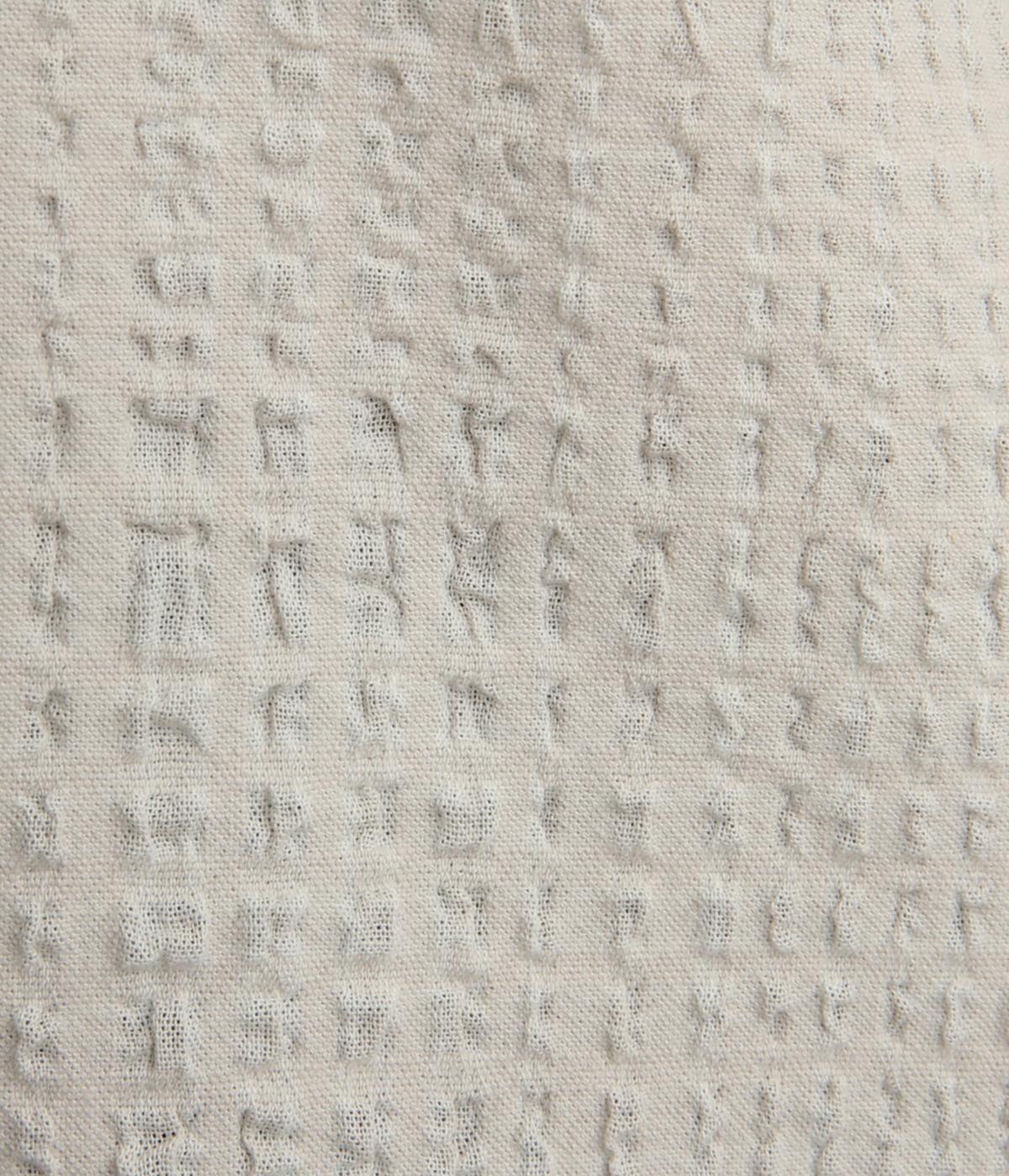 ぽこぽこと凹凸のある表面や、洗いをかけた自然な風合いが味わい深いポリウレタン混のコットン生地を使用しました。通気性がよく、さらりと心地よい肌ざわりが魅力です。
