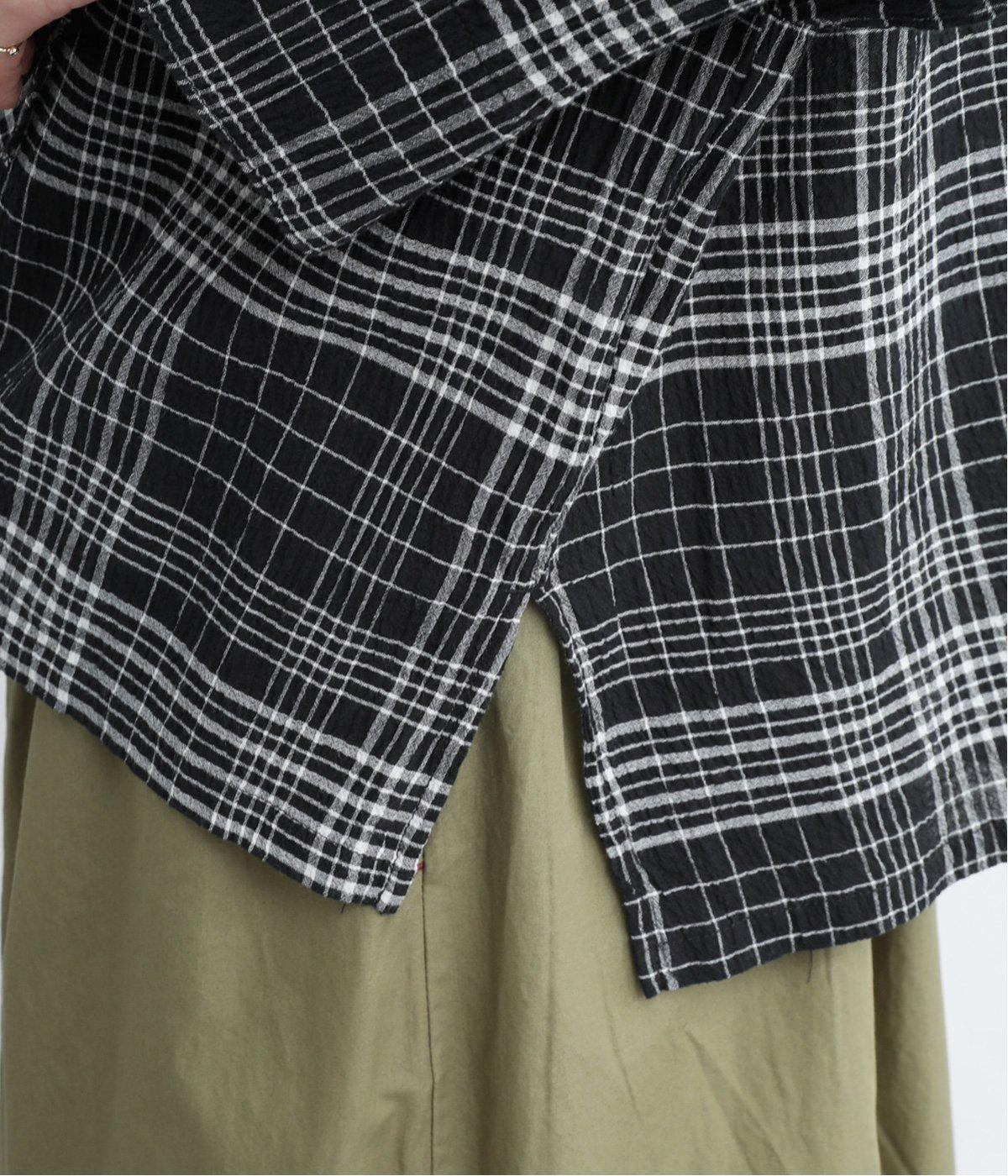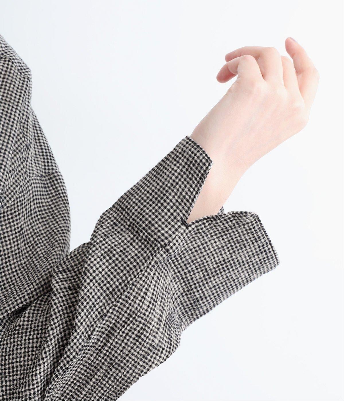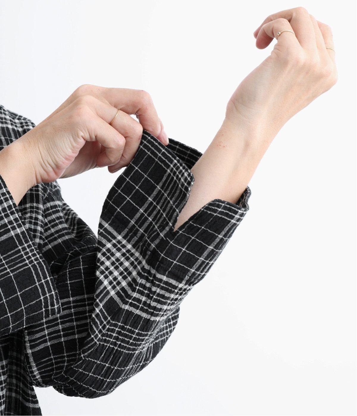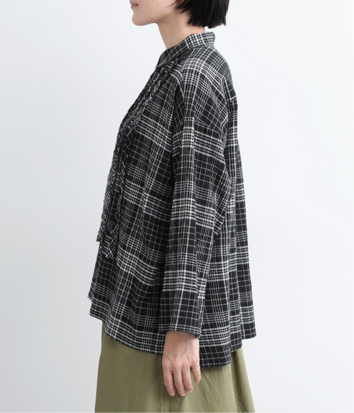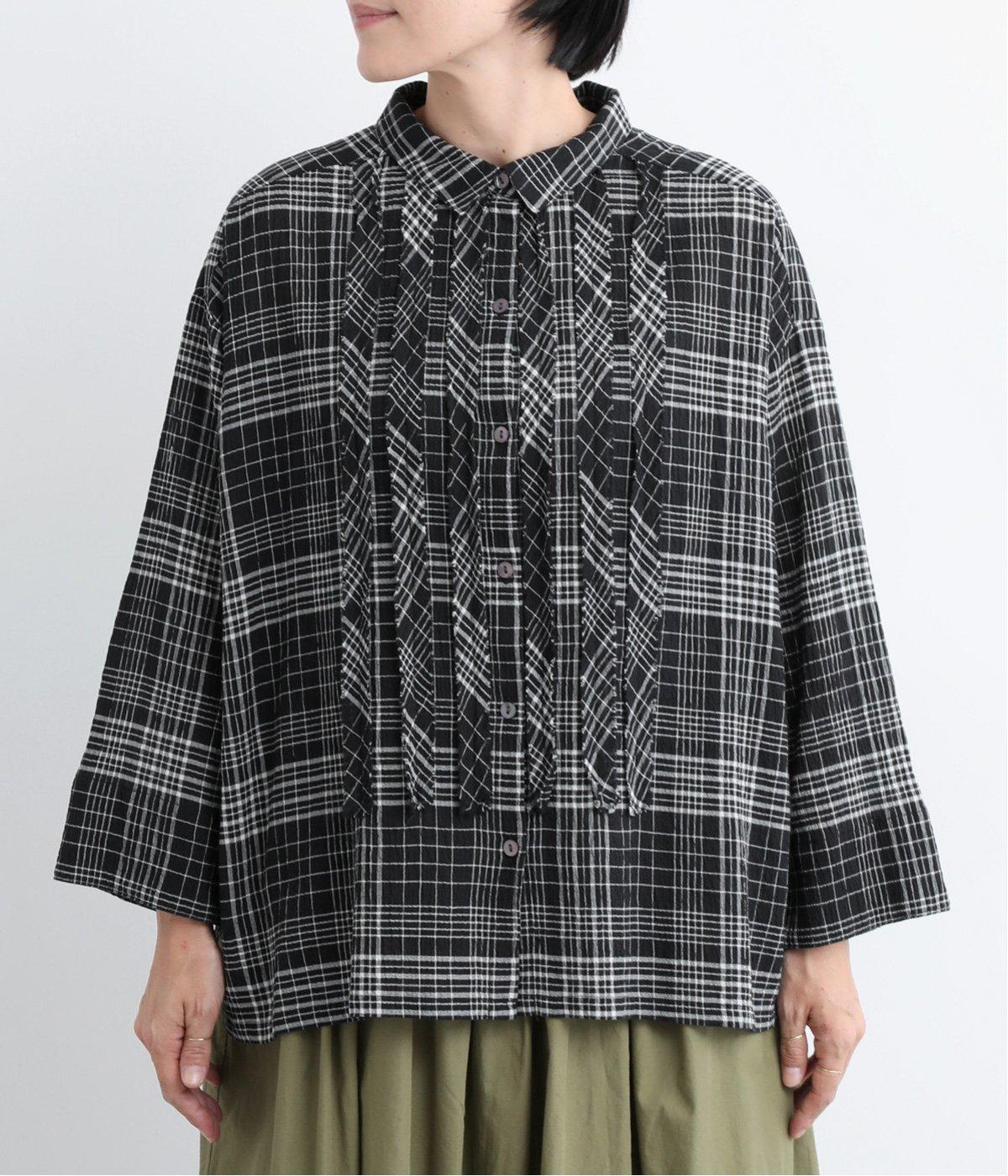 先染めのチェック柄素材をシュリンクさせた、表情のあるブラウスです。フロントのフリルが柄に動きを与えて華やかなポイントに。とても軽く羽織りにも便利な一枚で、手首が見える九分袖丈ですっきり着こなせます。
