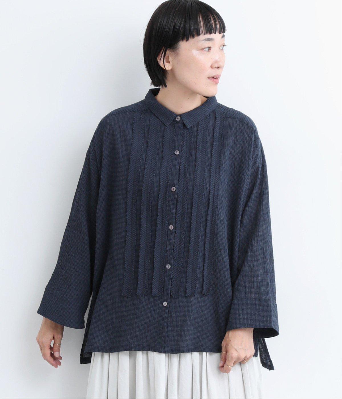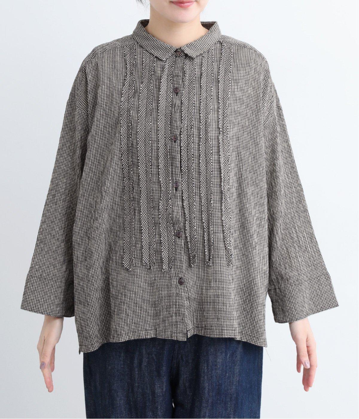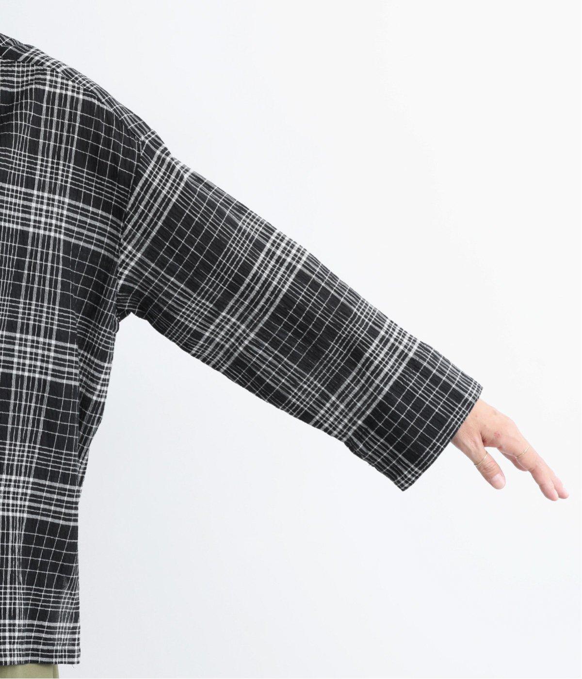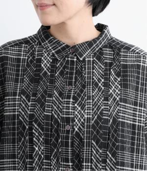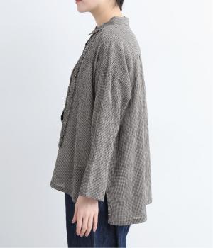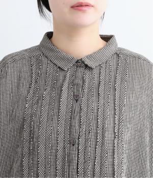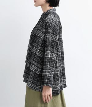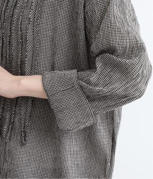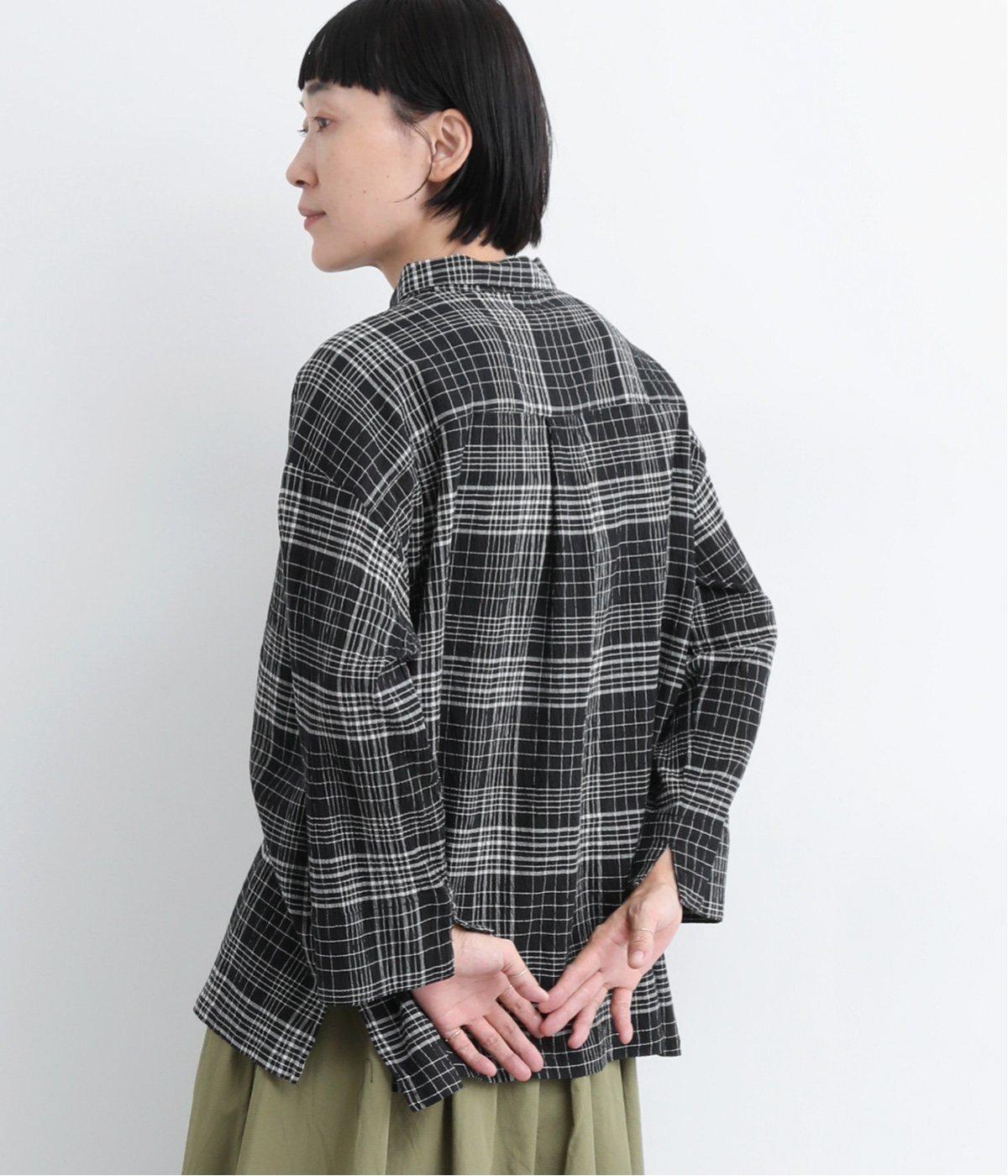 先染めのチェック柄素材をシュリンクさせた、表情のあるブラウスです。フロントのフリルが柄に動きを与えて華やかなポイントに。とても軽く羽織りにも便利な一枚で、手首が見える九分袖丈ですっきり着こなせます。