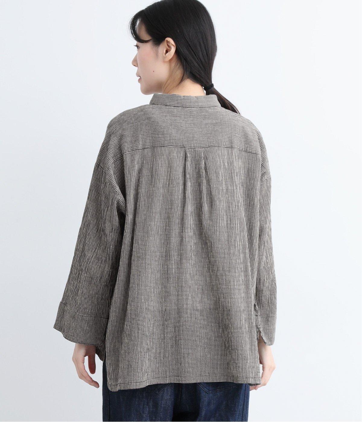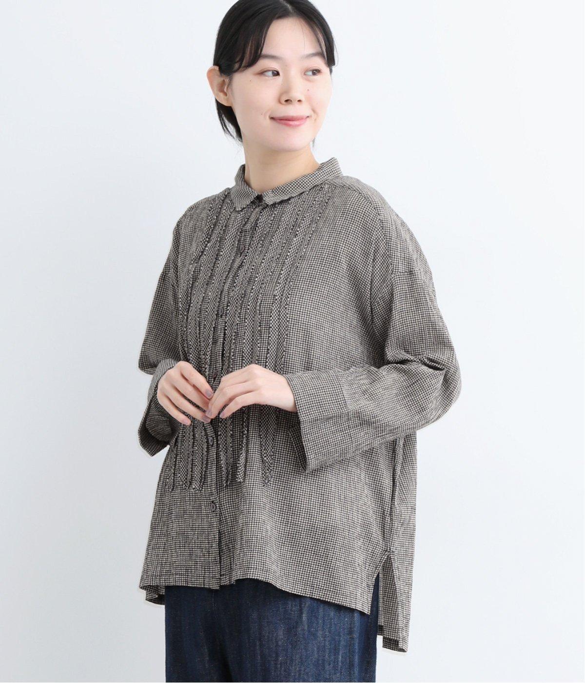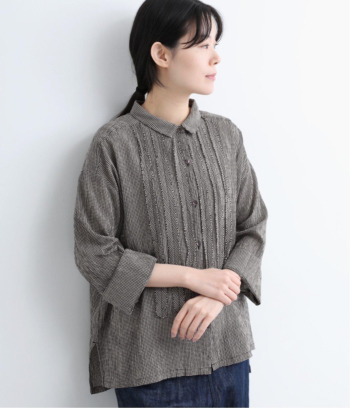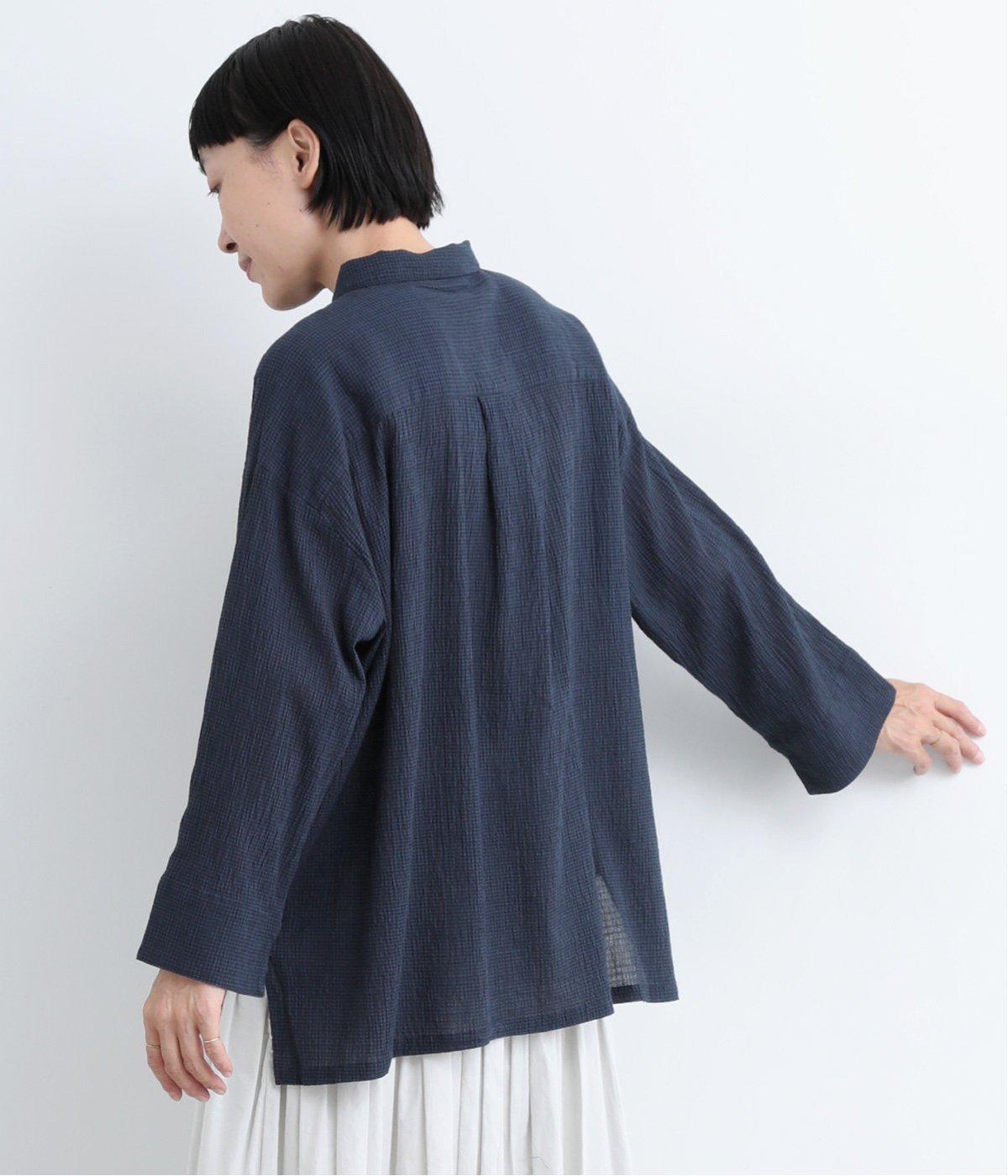 先染めのチェック柄素材をシュリンクさせた、表情のあるブラウスです。フロントのフリルが柄に動きを与えて華やかなポイントに。とても軽く羽織りにも便利な一枚で、手首が見える九分袖丈ですっきり着こなせます。