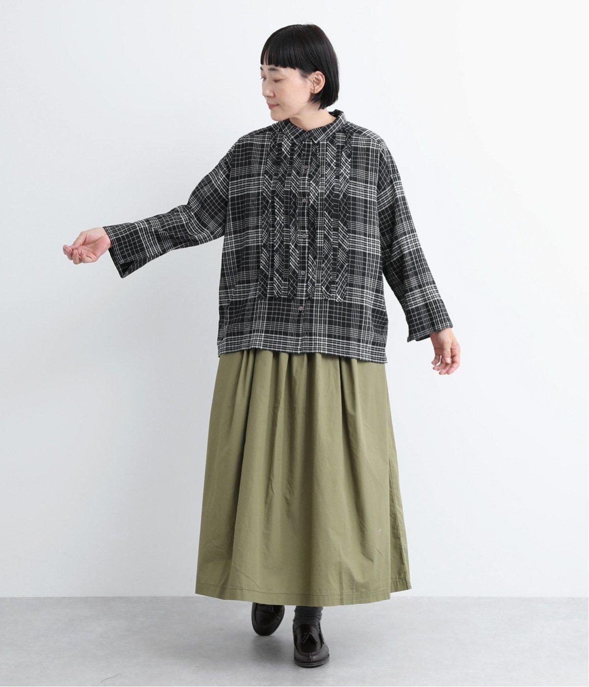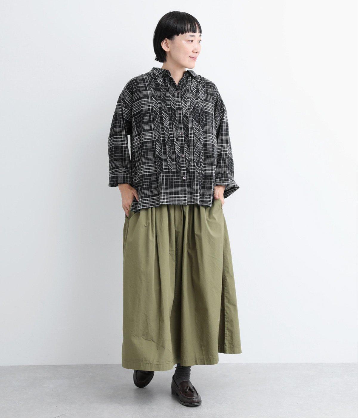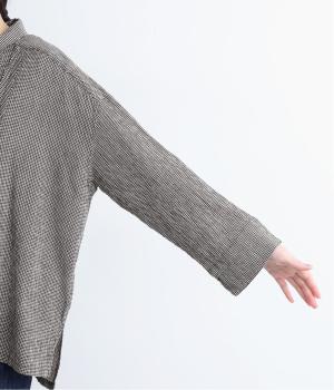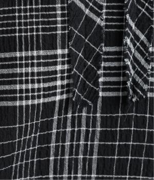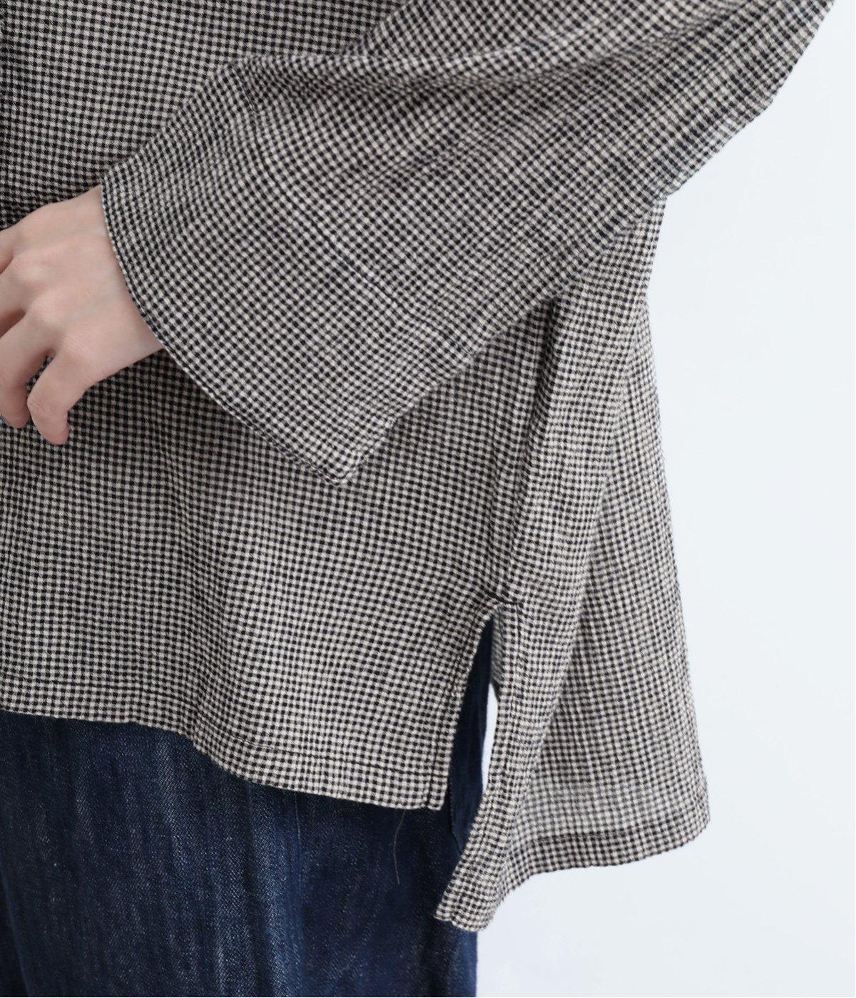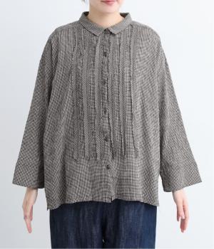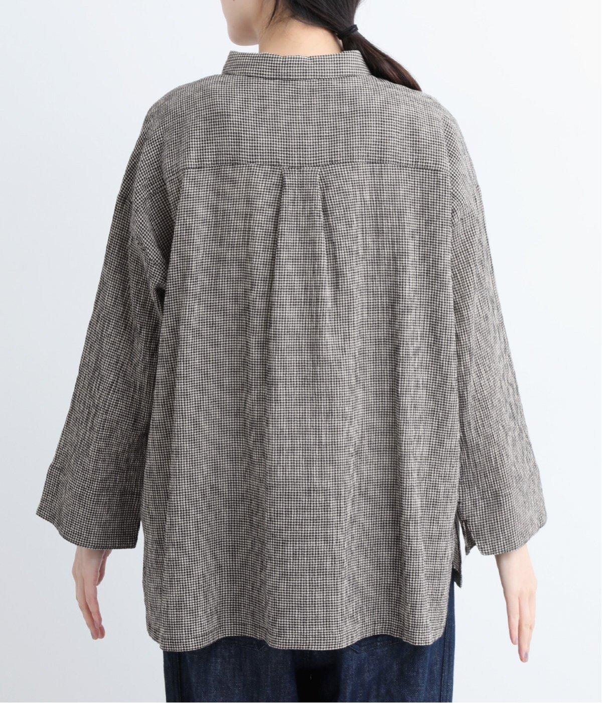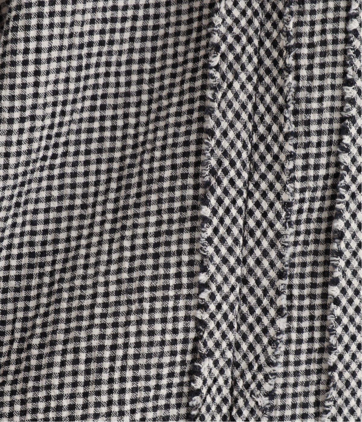 先染めのチェック柄素材をシュリンクさせた、表情のあるブラウスです。フロントのフリルが柄に動きを与えて華やかなポイントに。とても軽く羽織りにも便利な一枚で、手首が見える九分袖丈ですっきり着こなせます。