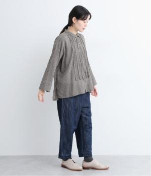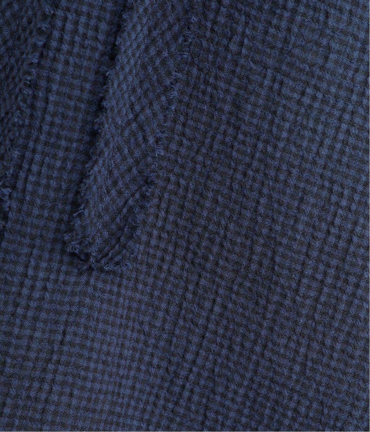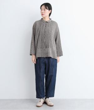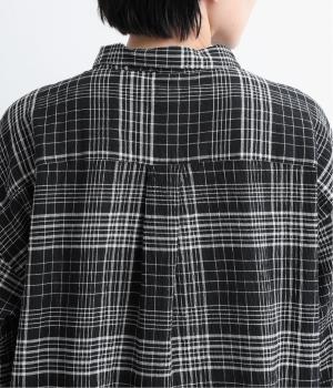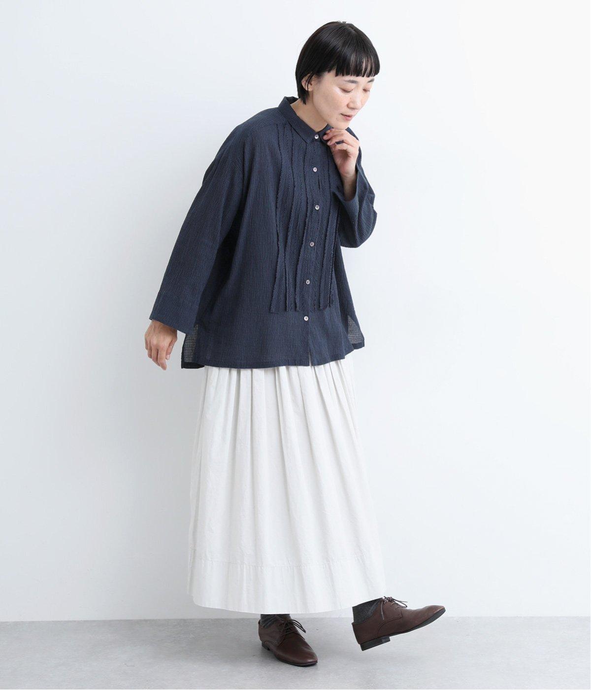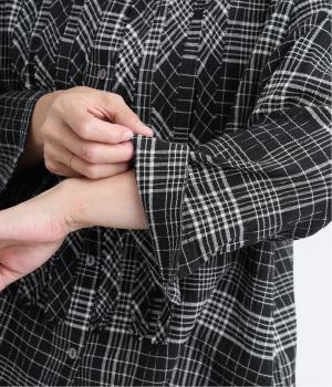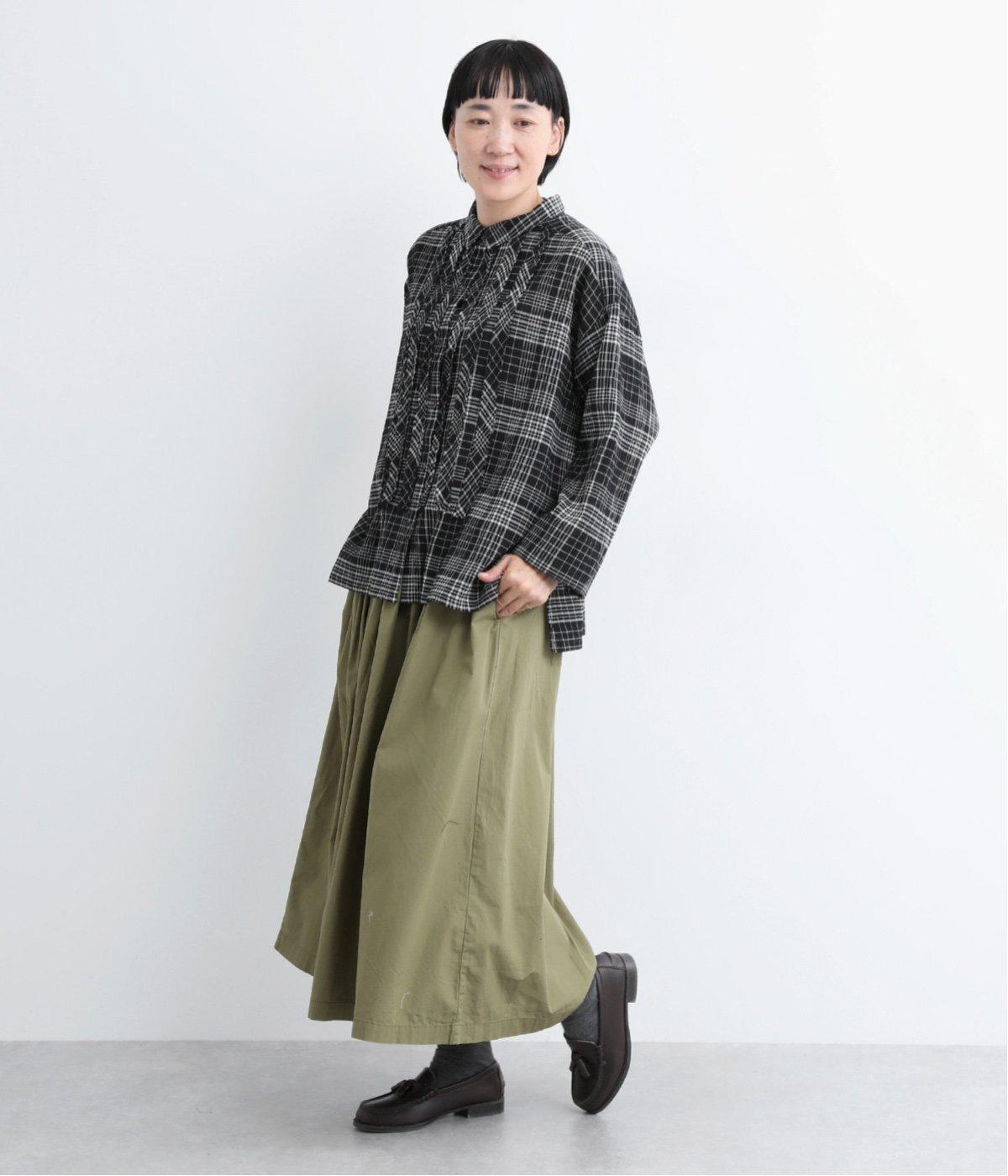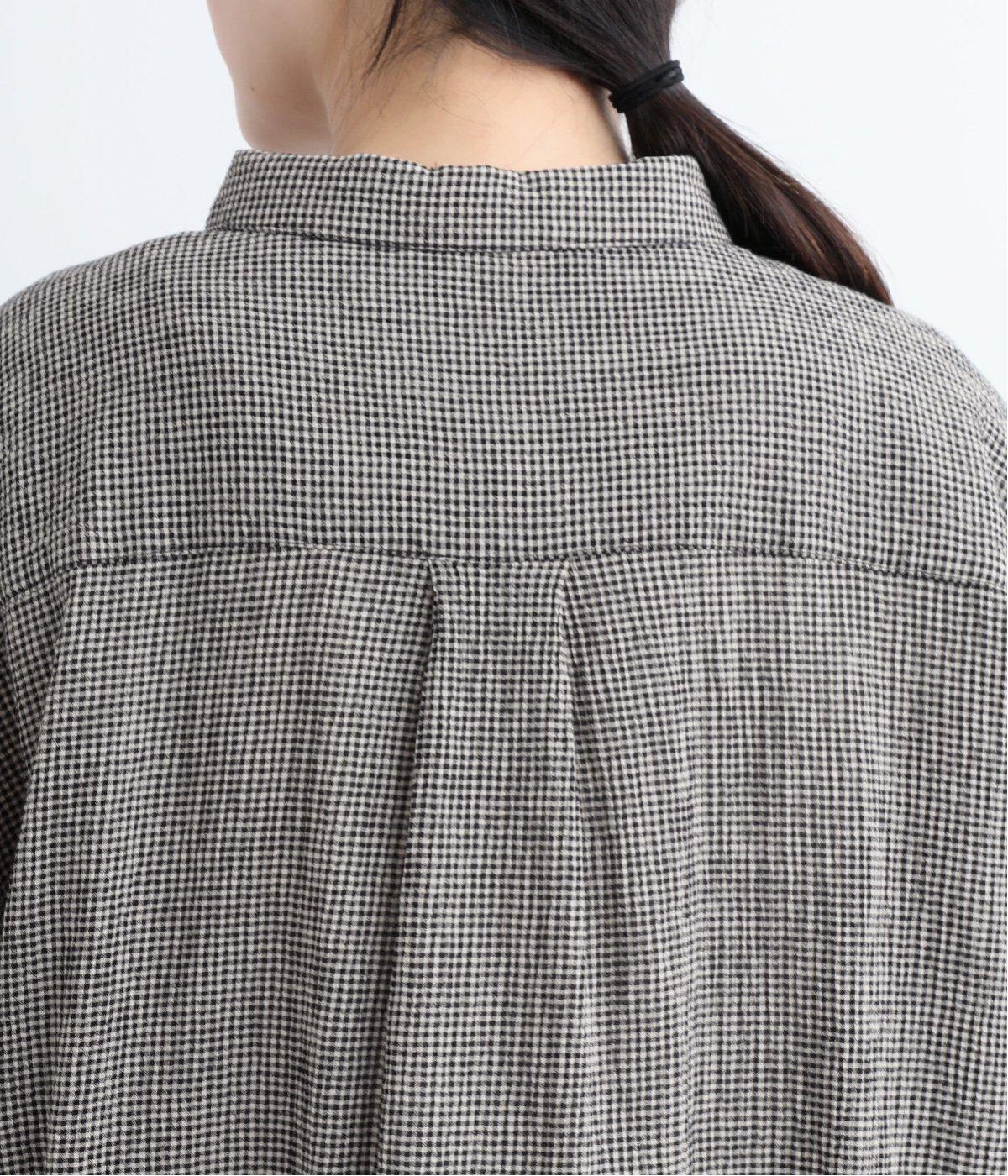 先染めのチェック柄素材をシュリンクさせた、表情のあるブラウスです。フロントのフリルが柄に動きを与えて華やかなポイントに。とても軽く羽織りにも便利な一枚で、手首が見える九分袖丈ですっきり着こなせます。