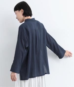 強撚糸のコットン素材をベースにシワのある風合いに仕上げました。シャリ感があるドライな肌触りで、シワの凹凸により肌との接地面が少なく着心地も快適。アイロンいらずの扱いやすい素材です。