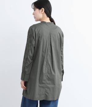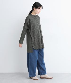 表情のあるジャカード素材を活かしてシンプルなデザインに仕立てました。ゆったりめのサイズ感と軽い着心地で、タンクトップやTシャツの上からラフに羽織るのもおすすめ。前後でヘムラインに差をつけて動きを持たせました。