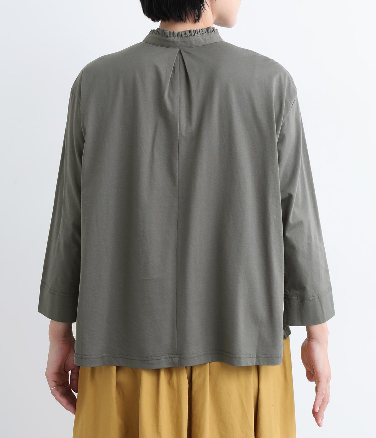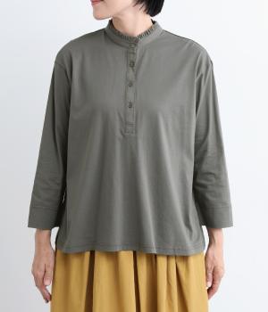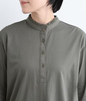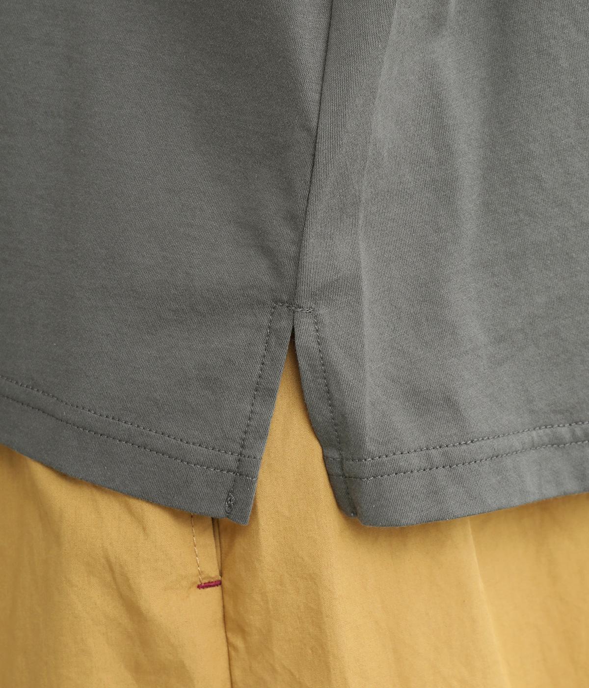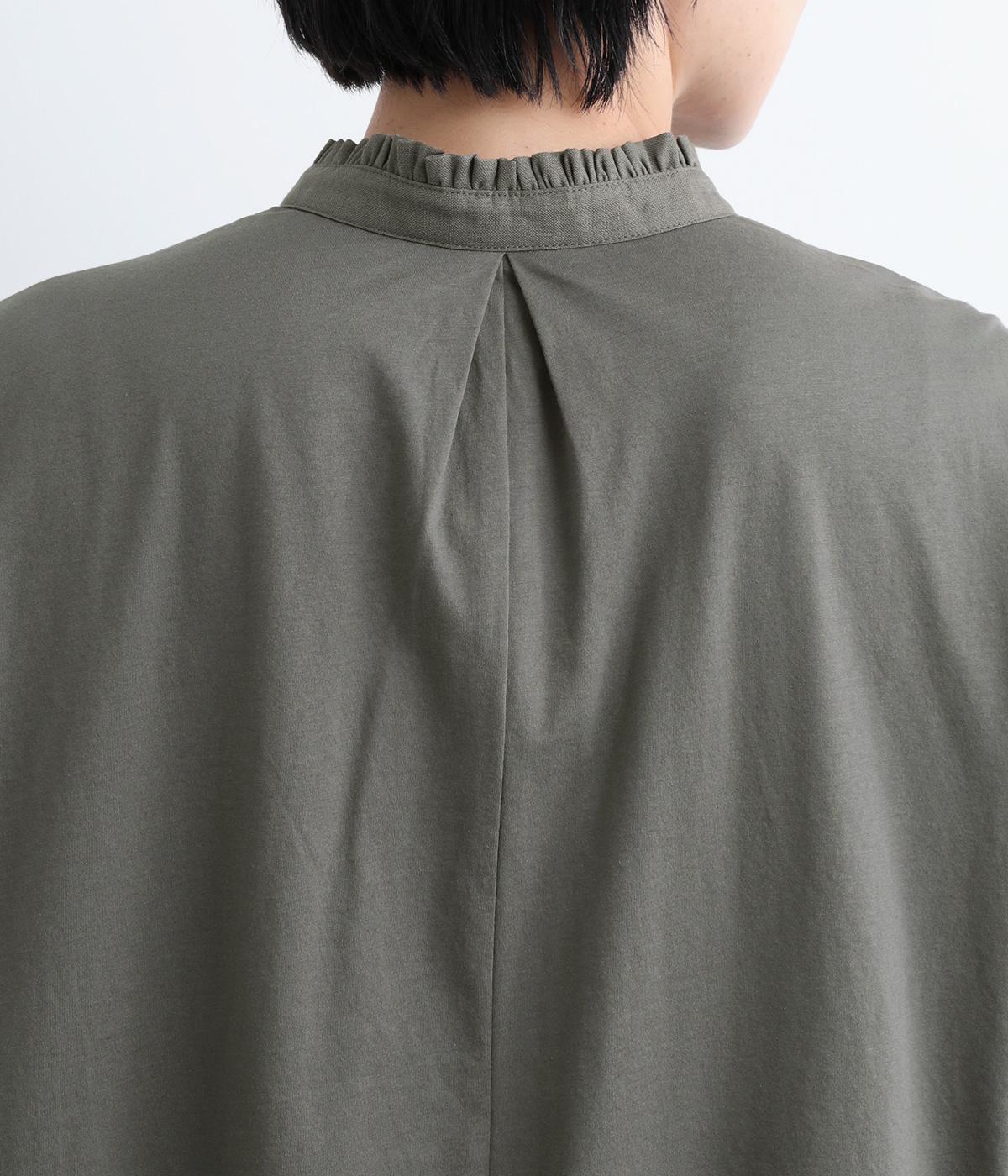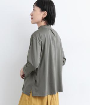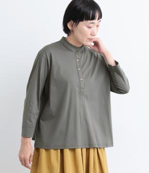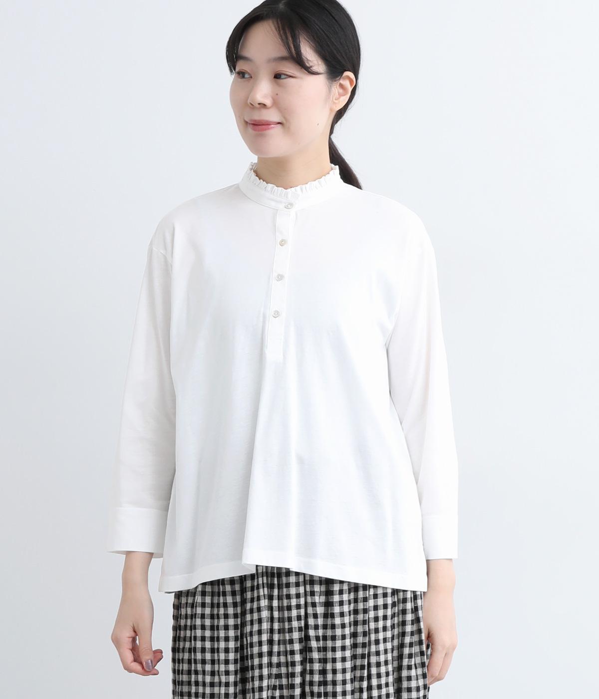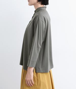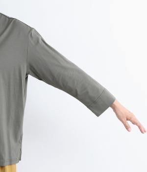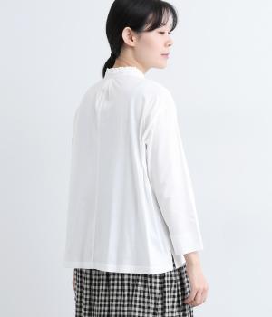 コットンの細番手を編み立てた薄手でありながらコシとハリのある天竺素材を、シルケット加工で毛羽の少ないさらりとした風合いに仕上げました。襟と前立て部分はリネンと綿の混紡布帛を使用しています。