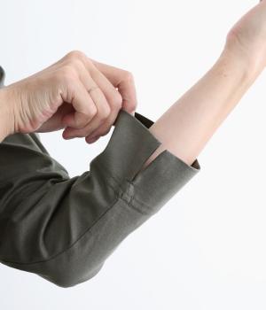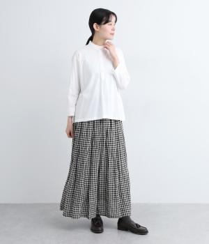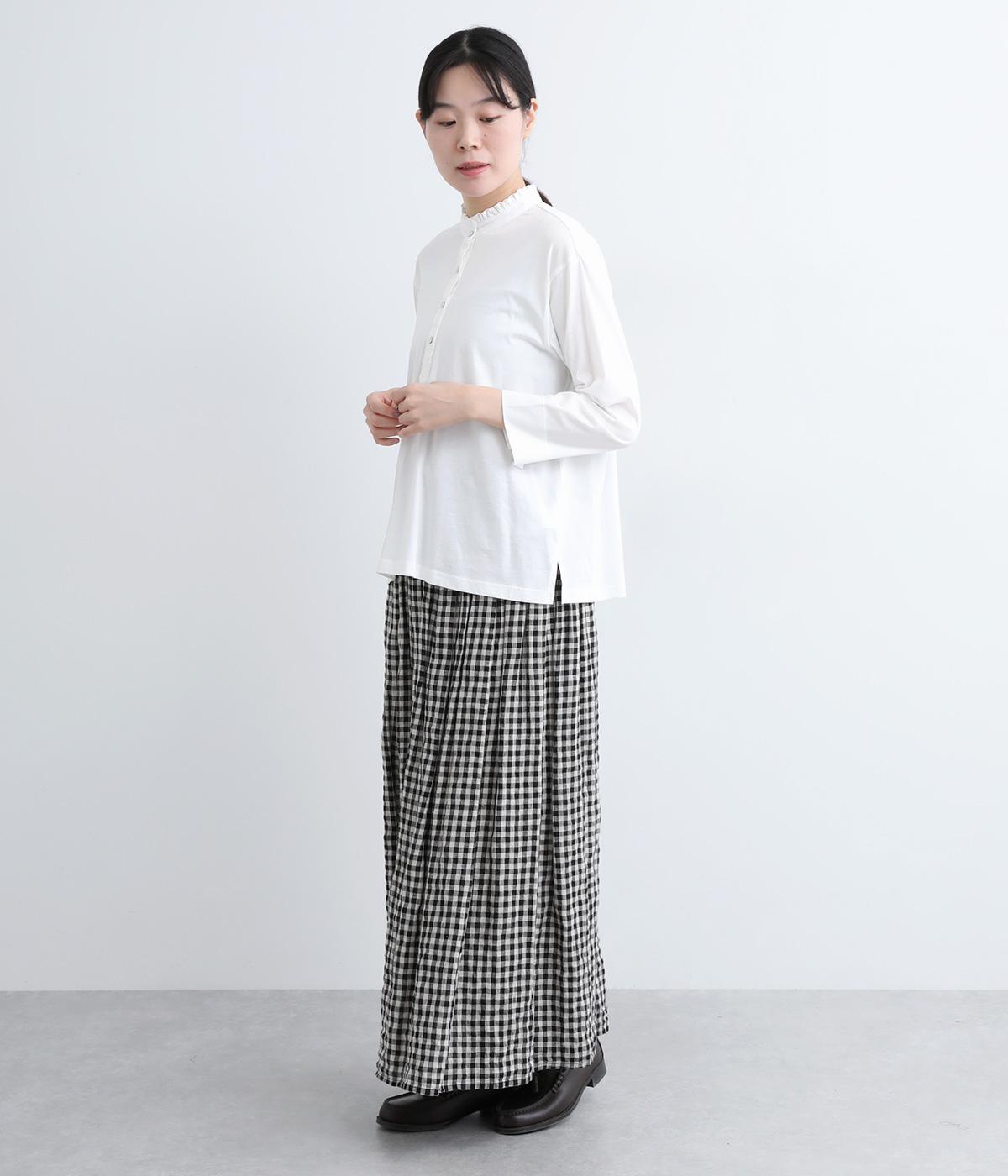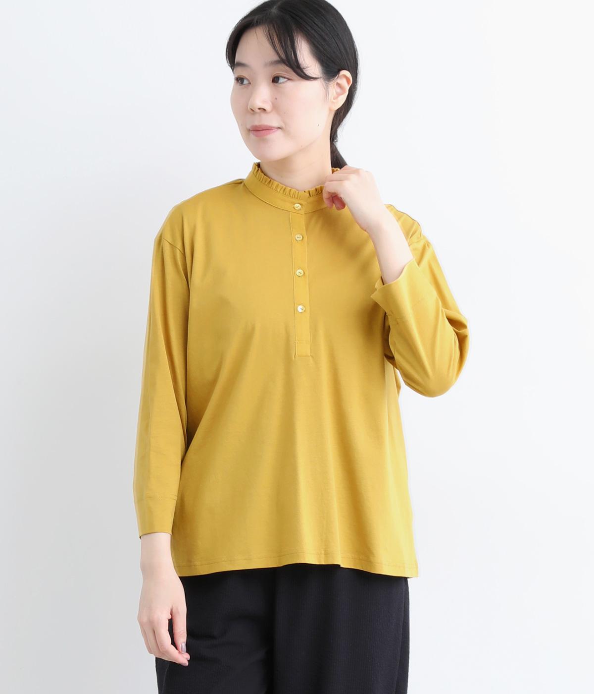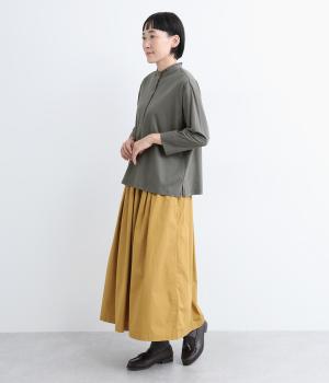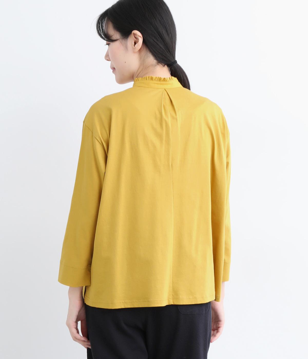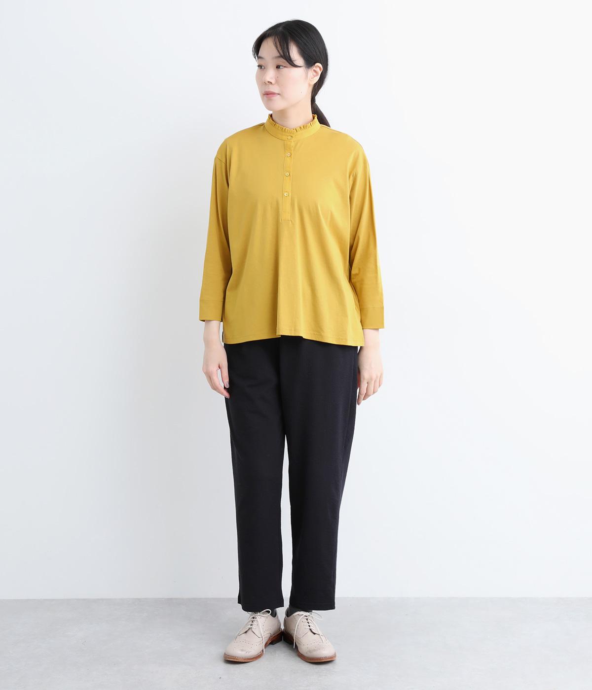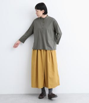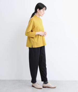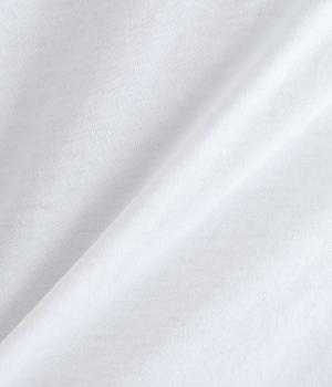 コットンの細番手を編み立てた薄手でありながらコシとハリのある天竺素材を、シルケット加工で毛羽の少ないさらりとした風合いに仕上げました。襟と前立て部分はリネンと綿の混紡布帛を使用しています。