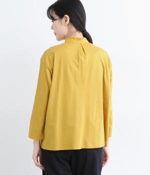 襟と前立ての異素材使いでさり気なく変化をつけたプルオーバーです。きちんと感がありながらもリラックスして着用できる優秀な一枚。フリルカラーが品のあるフェミンンさを感じさせ、袖口スリットですっきりと着こなせます。