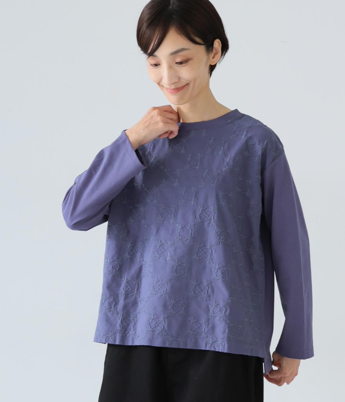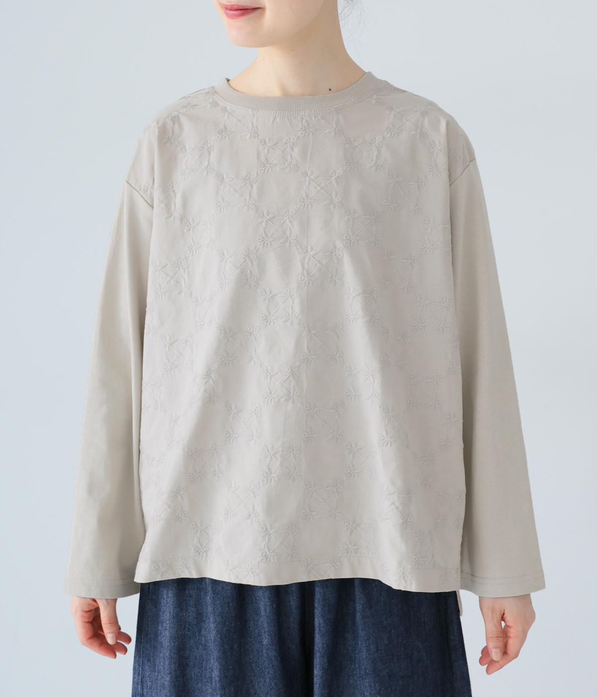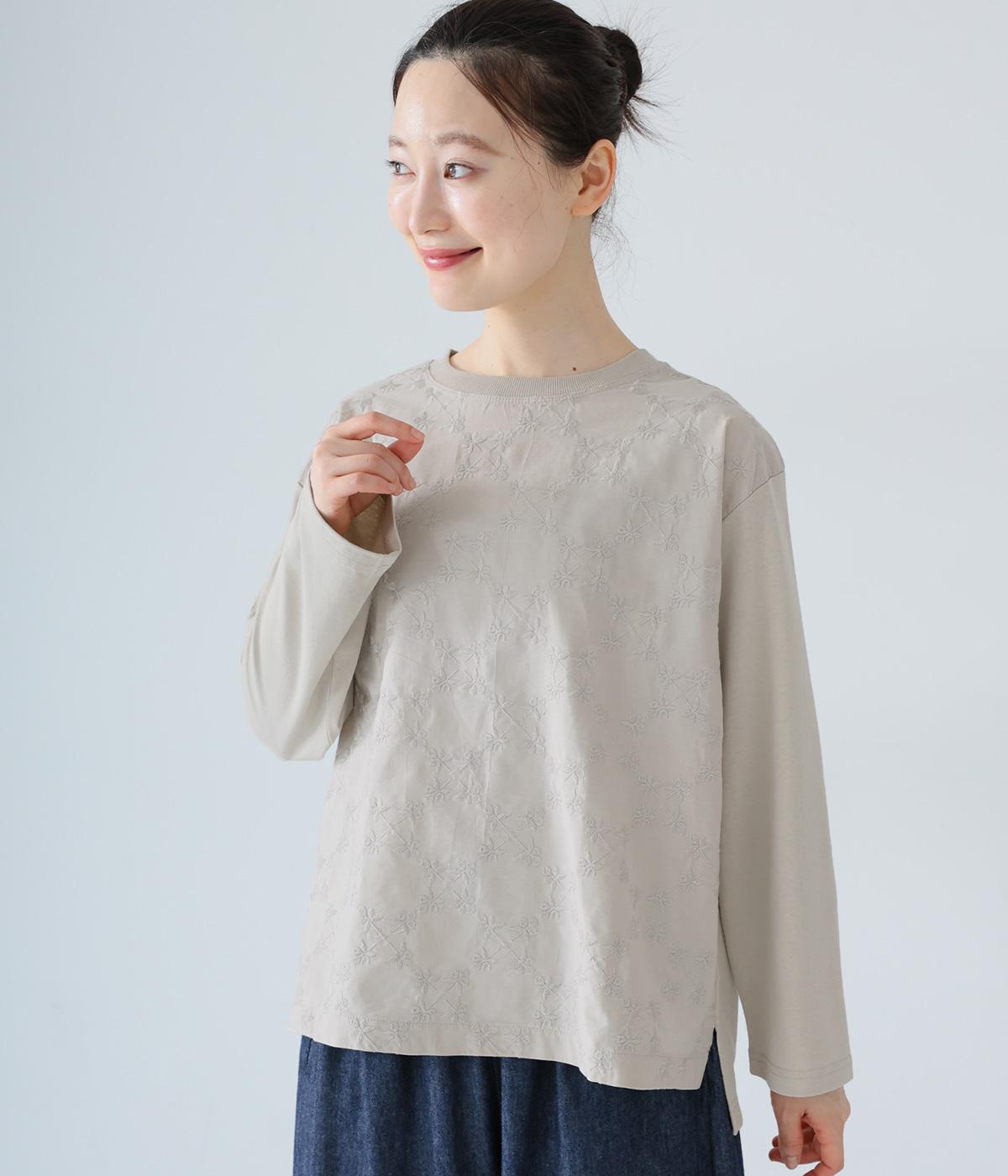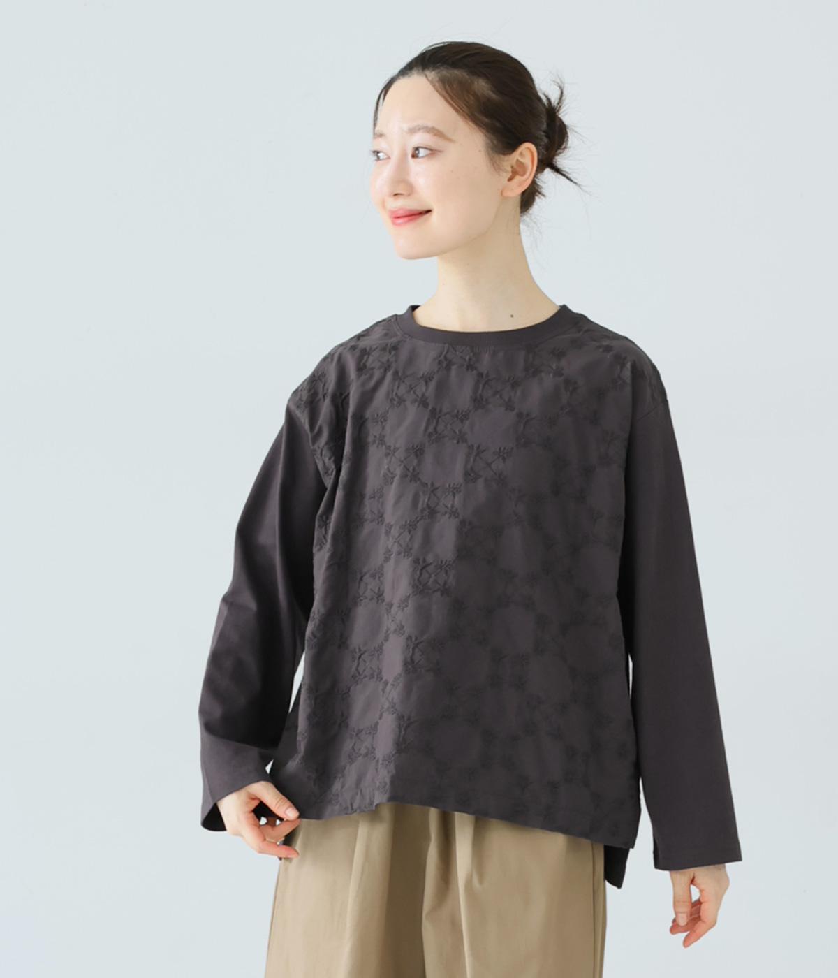 後ろ身頃と袖はカットソー素材で着心地よく仕上げ、前身頃は布帛にリーフ柄を格子状につなげた刺しゅうで繊細な華やかさをプラスしました。襟ぐりにはリブを配しているので頭入れしやすく、ほどよいゆとりで着心地も◎。