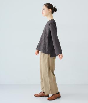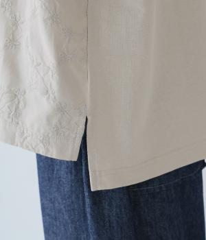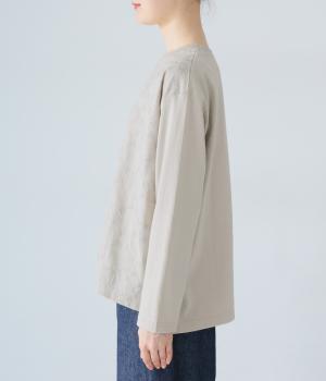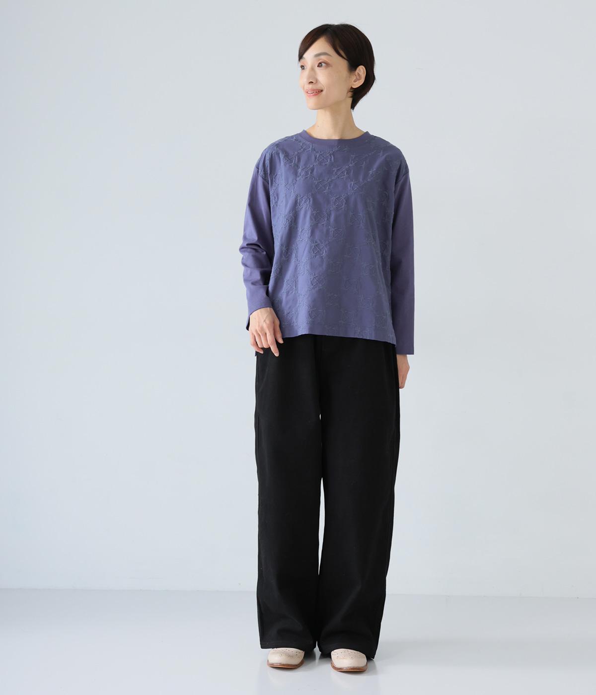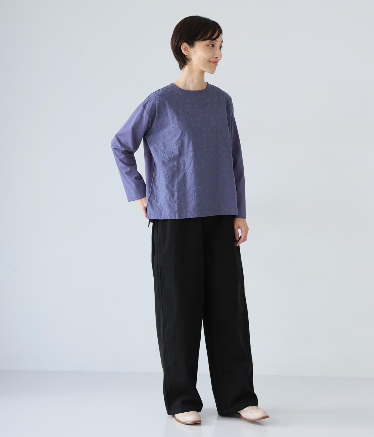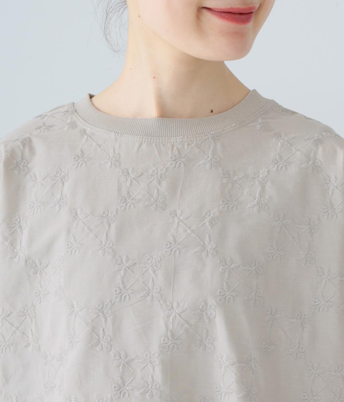 後ろ身頃と袖はカットソー素材で着心地よく仕上げ、前身頃は布帛にリーフ柄を格子状につなげた刺しゅうで繊細な華やかさをプラスしました。襟ぐりにはリブを配しているので頭入れしやすく、ほどよいゆとりで着心地も◎。