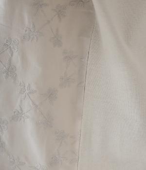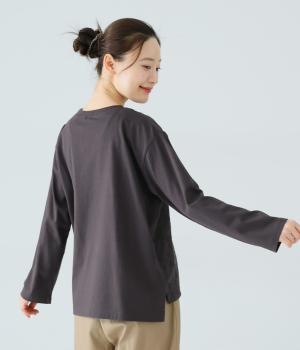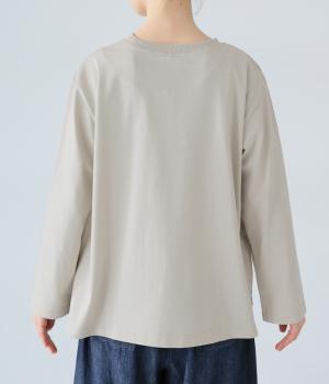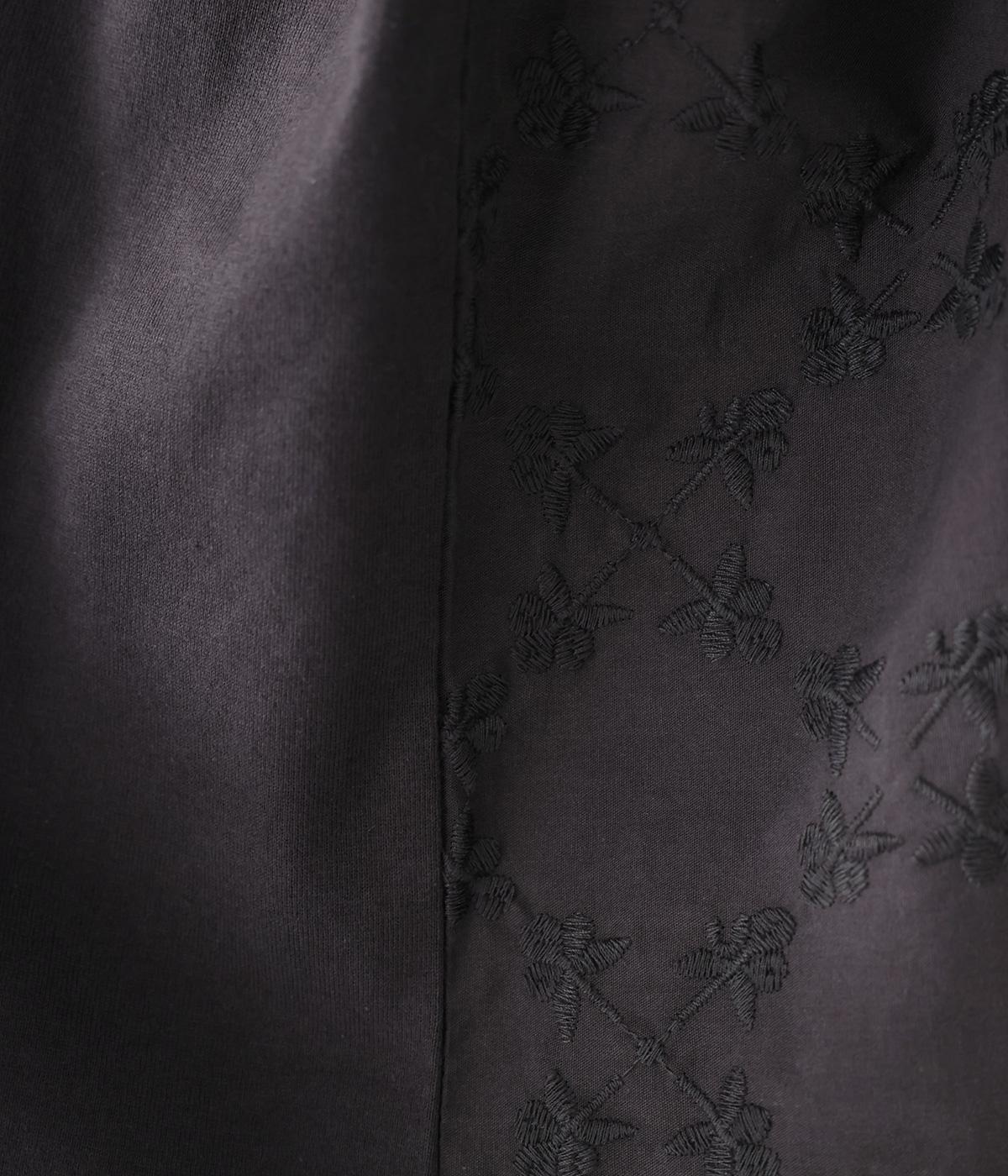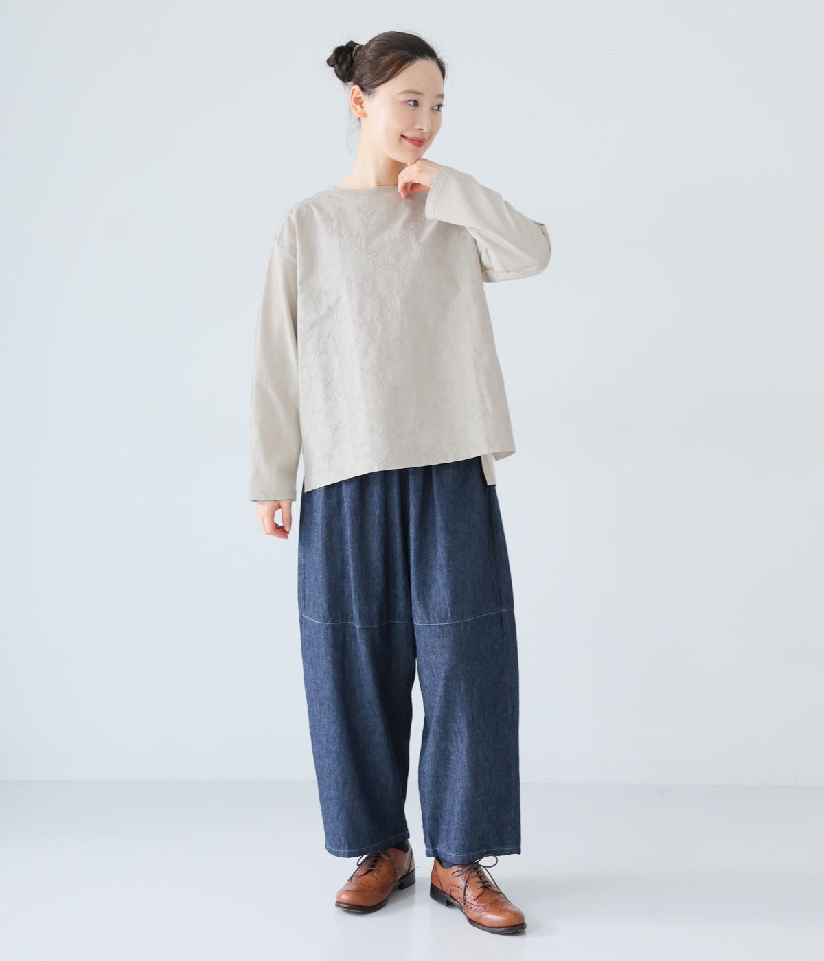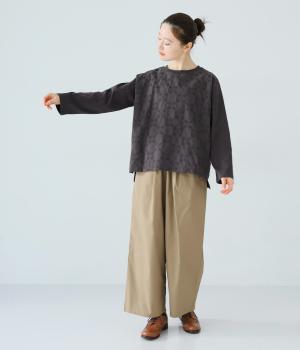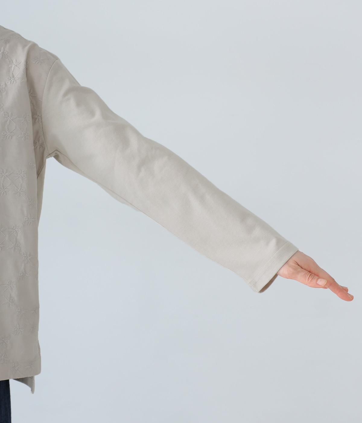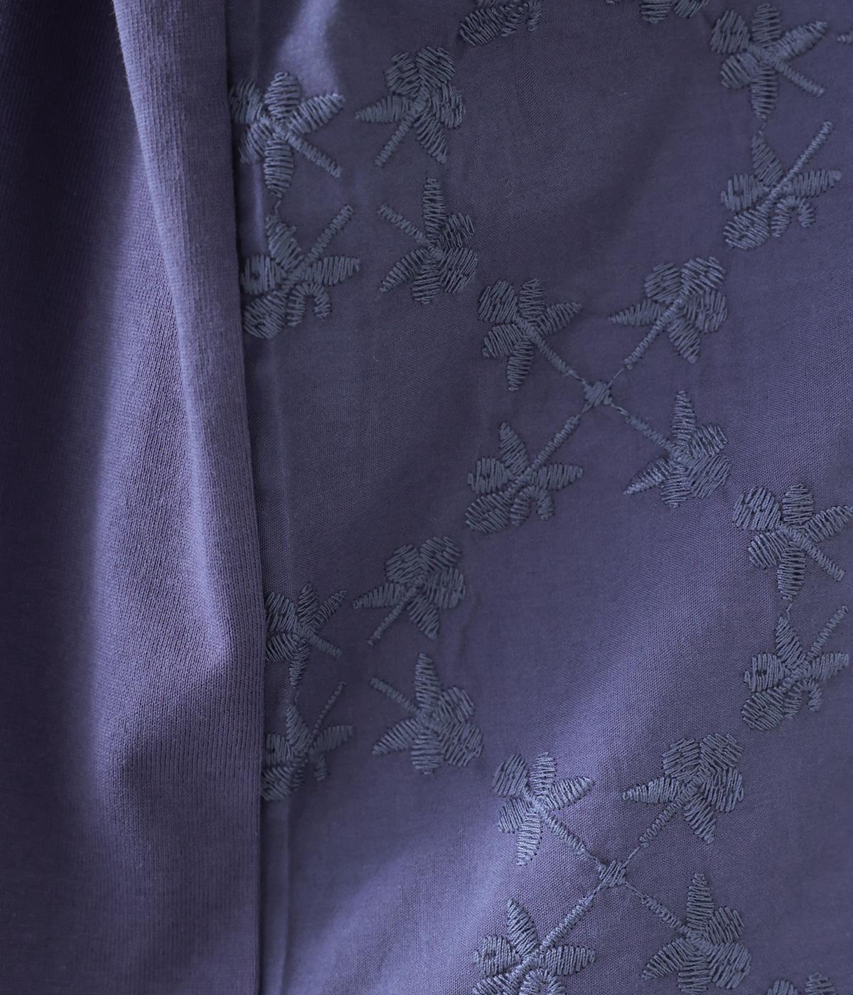 後ろ身頃と袖はカットソー素材で着心地よく仕上げ、前身頃は布帛にリーフ柄を格子状につなげた刺しゅうで繊細な華やかさをプラスしました。襟ぐりにはリブを配しているので頭入れしやすく、ほどよいゆとりで着心地も◎。