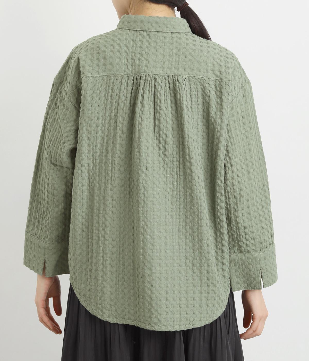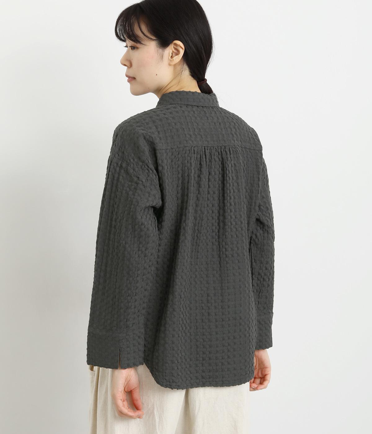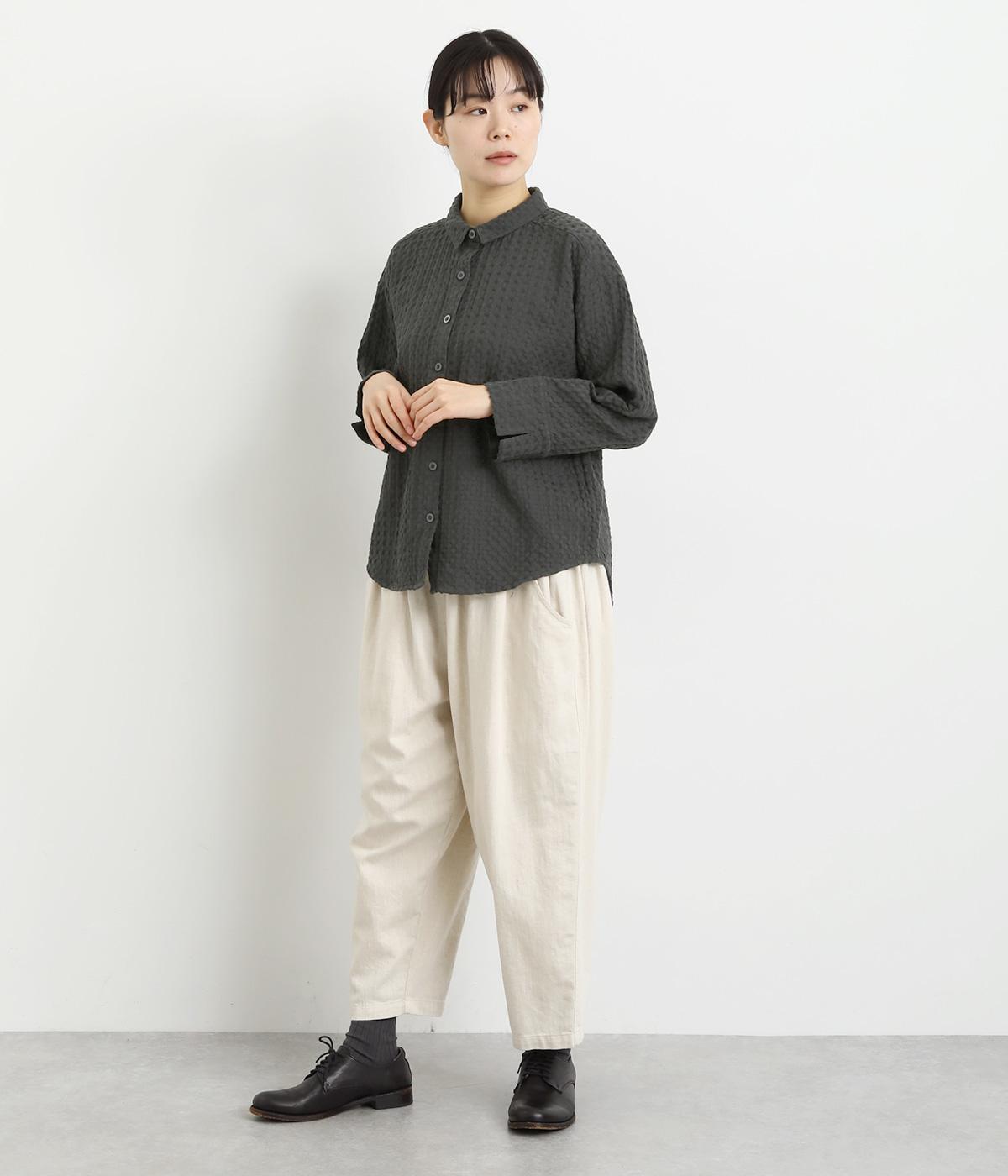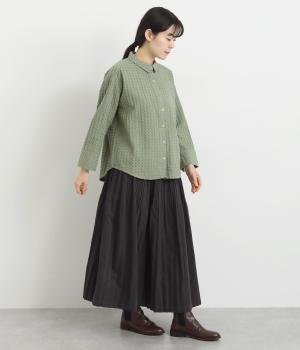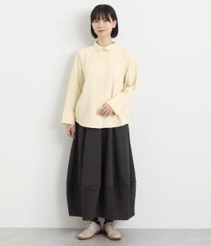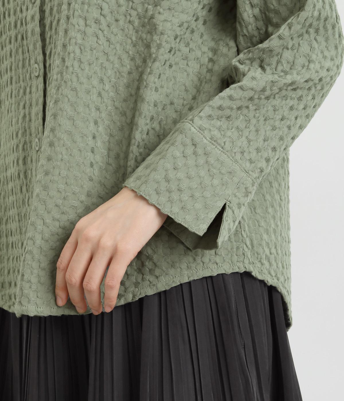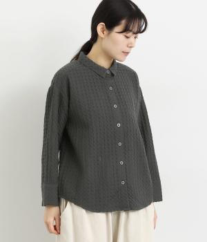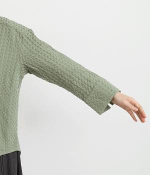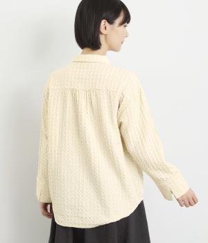 表面の凹凸感が特徴的なジャカード織りのコットン素材を使用。適度なふくらみがありながらも軽くてやわらかな風合いが心地よく、ロングシーズン着まわせます。