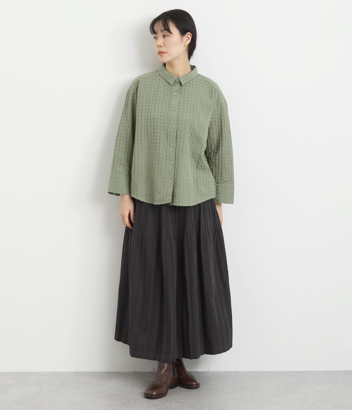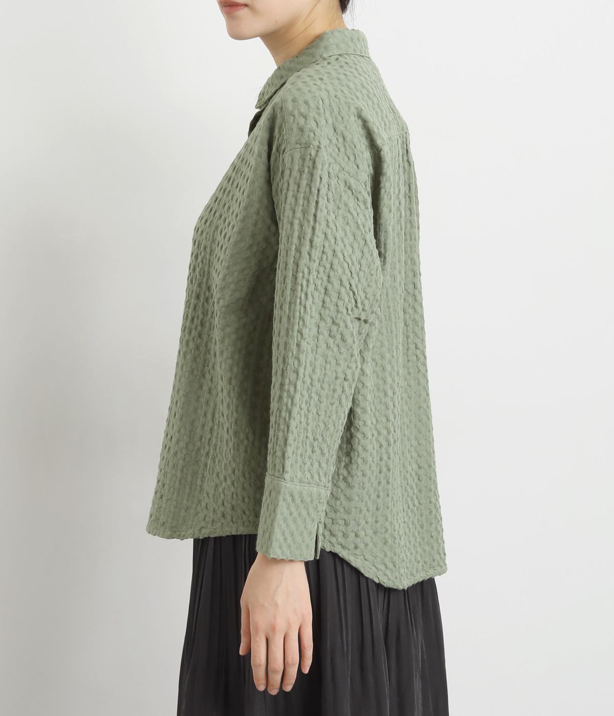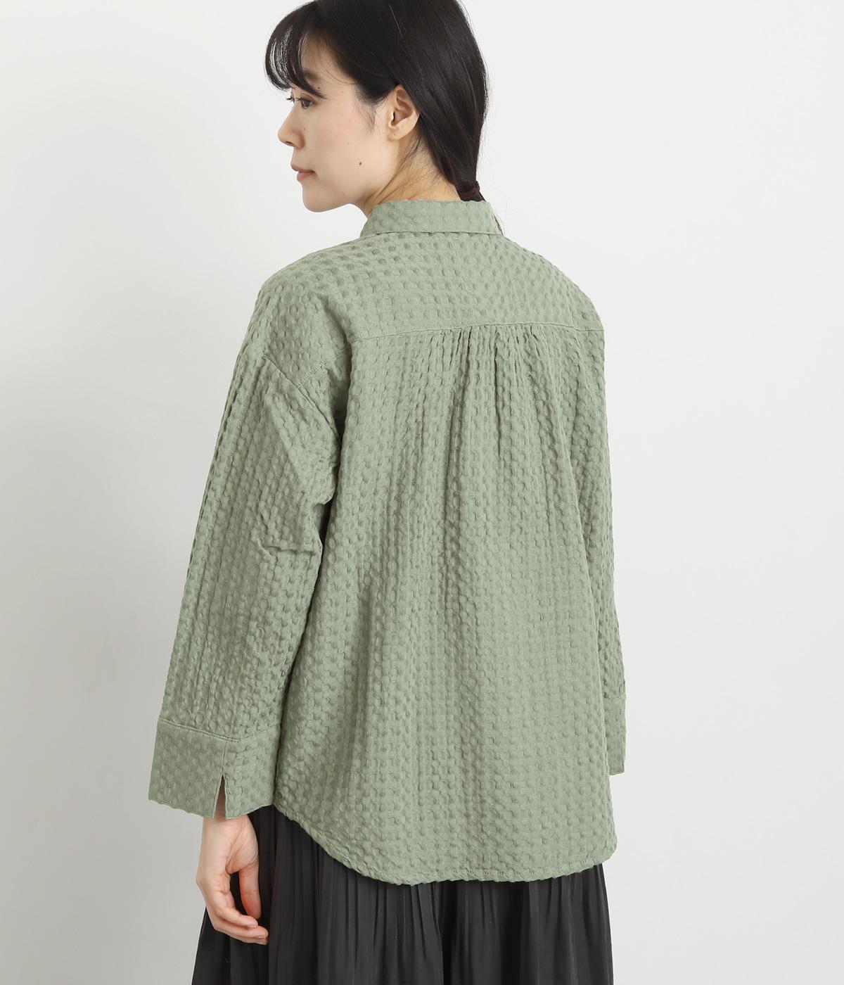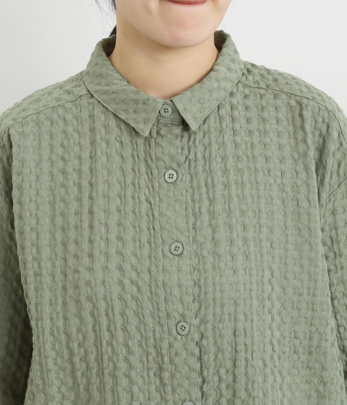 表面の凹凸感が特徴的なジャカード織りのコットン素材を使用。適度なふくらみがありながらも軽くてやわらかな風合いが心地よく、ロングシーズン着まわせます。