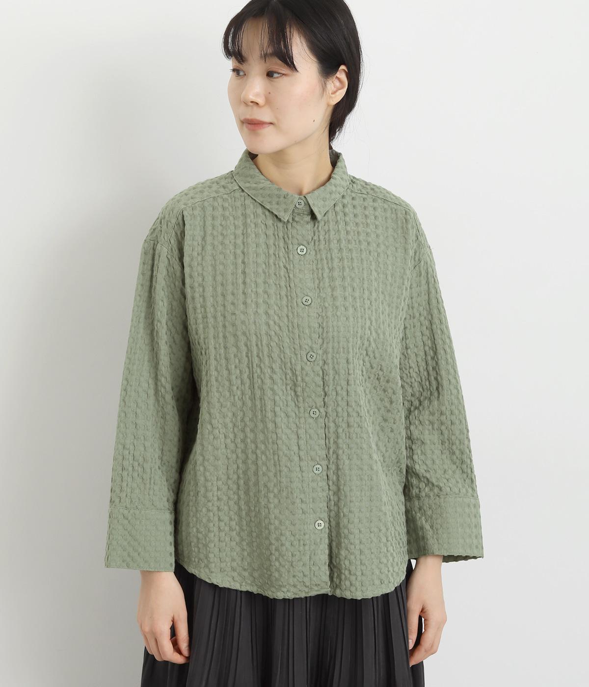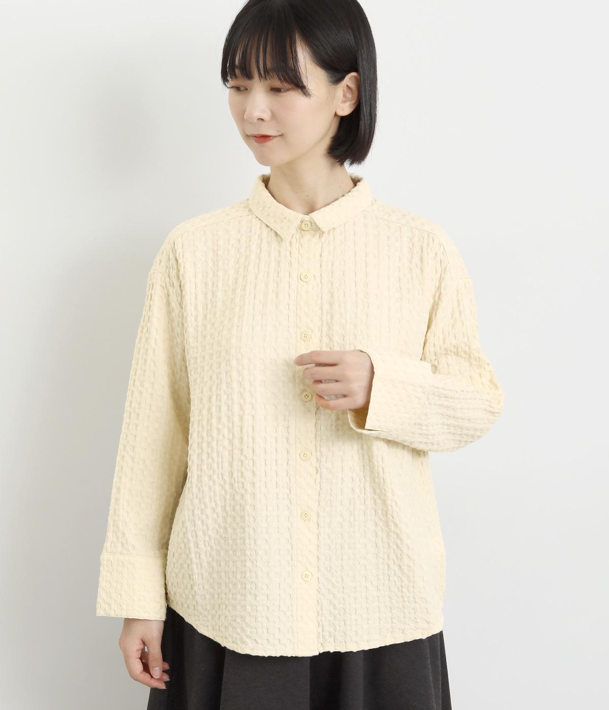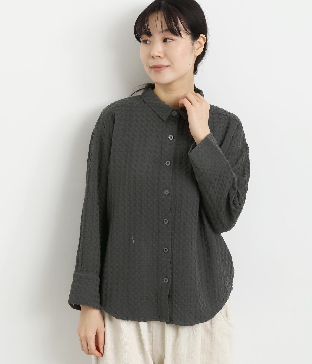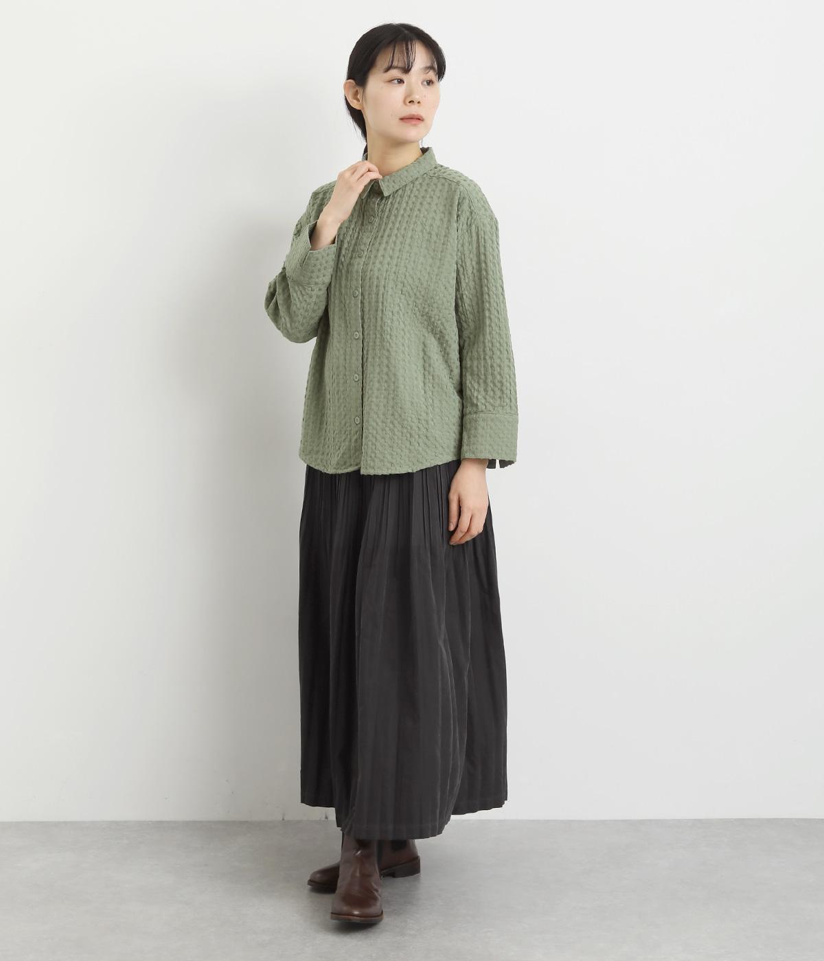 表面の凹凸感が特徴的なジャカード織りのコットン素材を使用。適度なふくらみがありながらも軽くてやわらかな風合いが心地よく、ロングシーズン着まわせます。