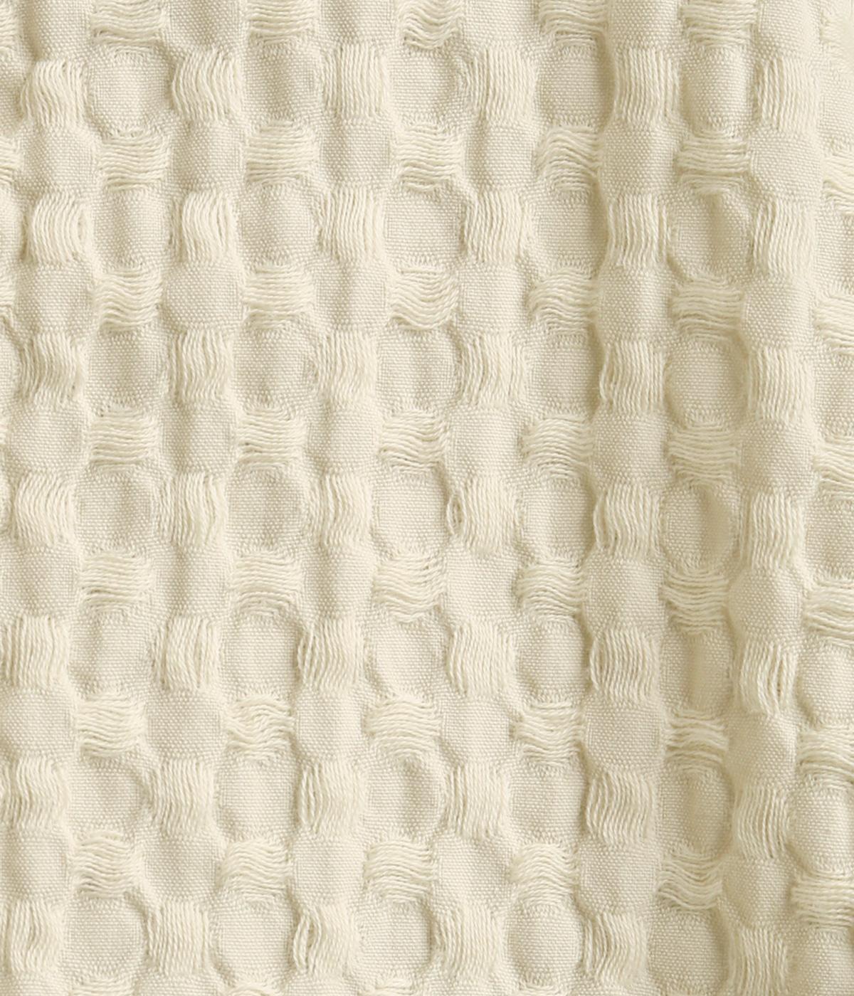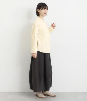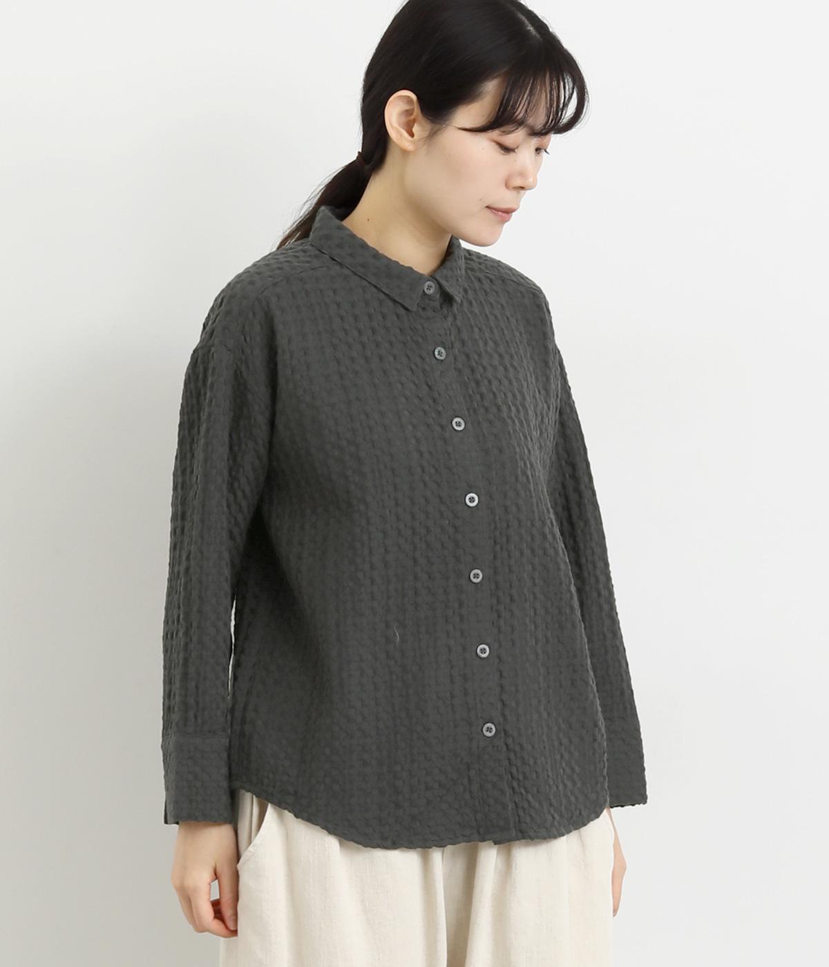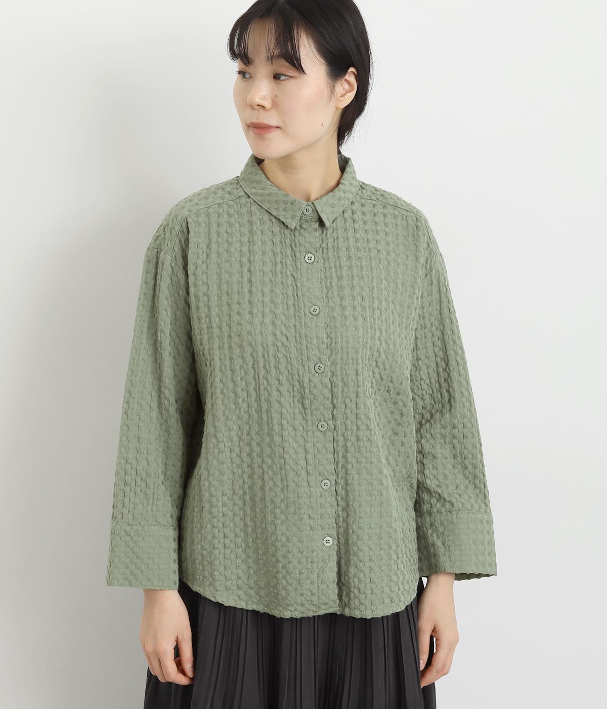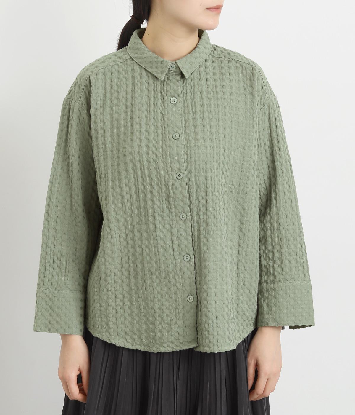 表面の凹凸感が特徴的なジャカード織りのコットン素材を使用。適度なふくらみがありながらも軽くてやわらかな風合いが心地よく、ロングシーズン着まわせます。