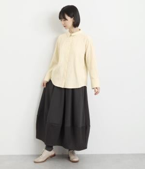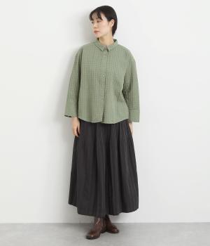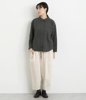 適度にゆとりを持たせたベーシックなボックス型に小さな襟をつけたシャツブラウス。袖口はやや広めのスリット入りで、折り返したラフな着こなしもこなれ感が出ます。あたたかな季節は羽織り使いもおすすめです。