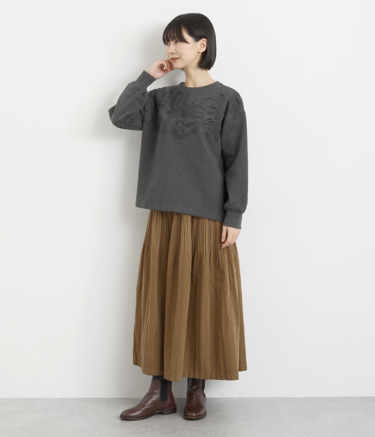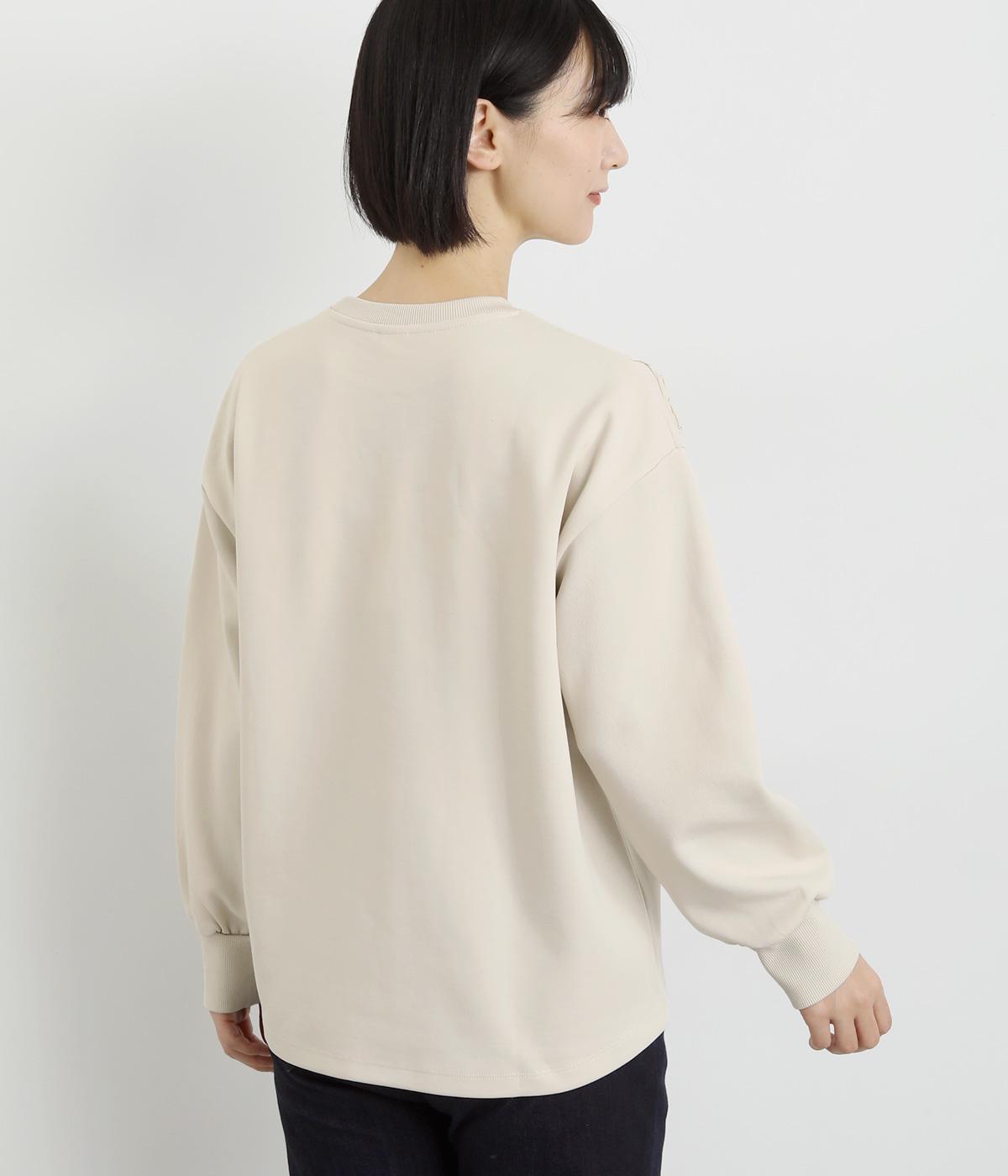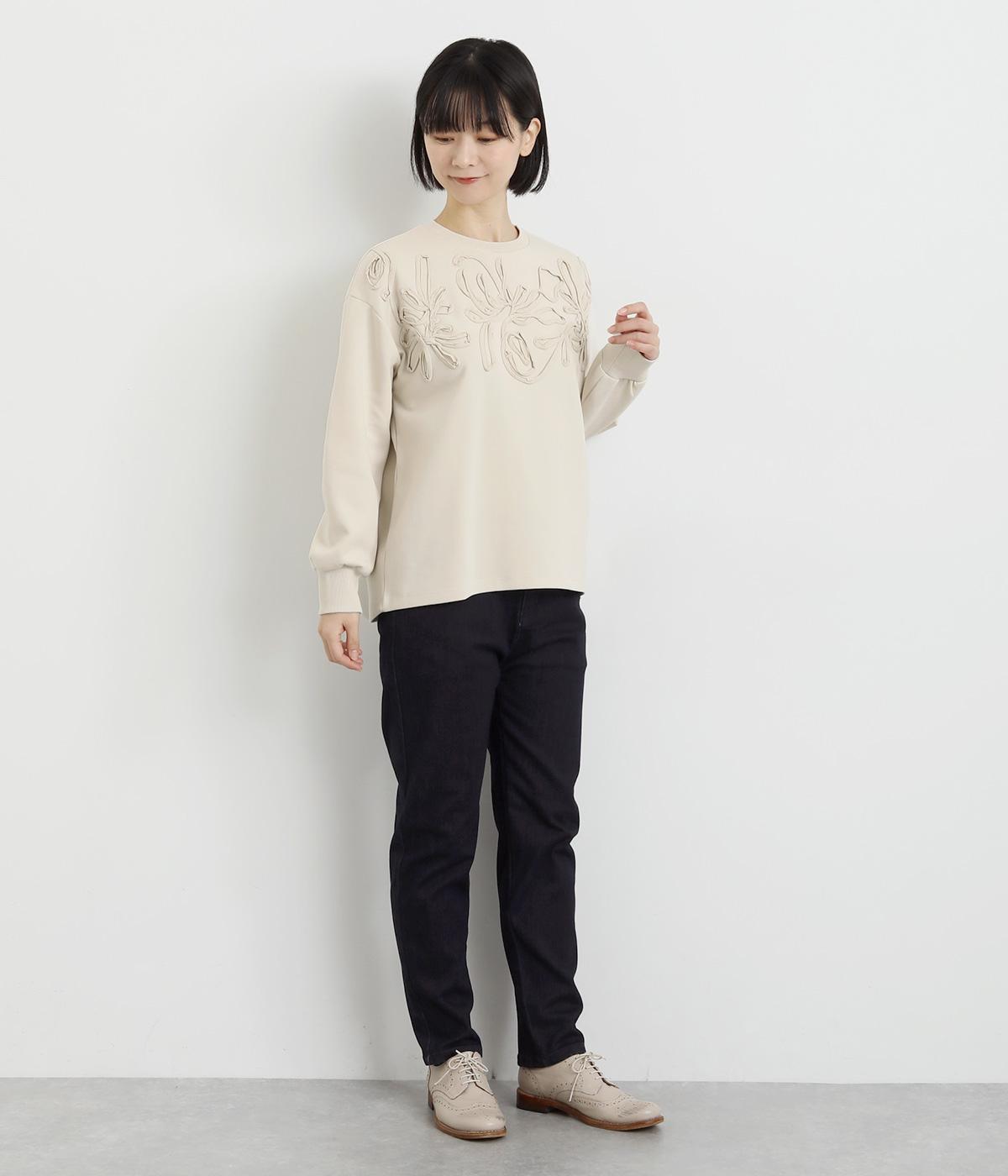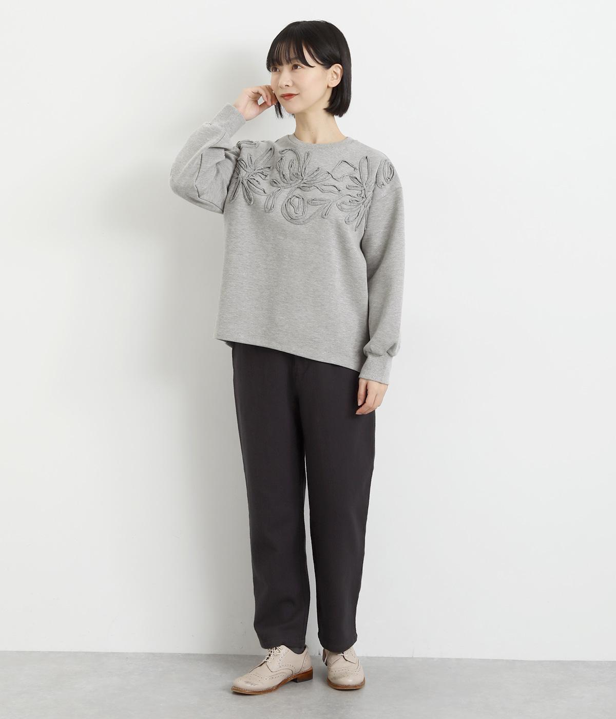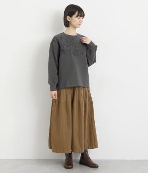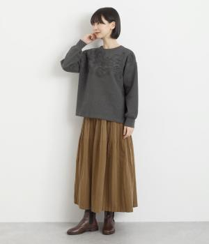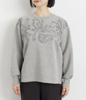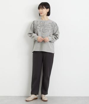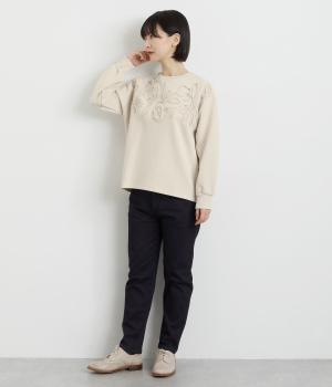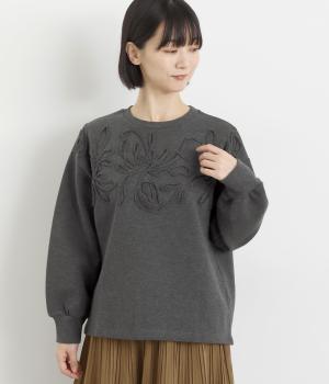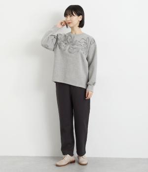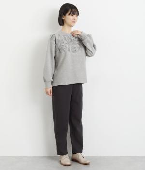 胸元にほどこされたブレード刺しゅうがさり気なく華やかさを添えるプルオーバー。長めのリブで袖口に適度なふくらみを持たせてやわらかなシルエットに。品のいいまとまりのある印象で、柄ボトムとも好相性です。