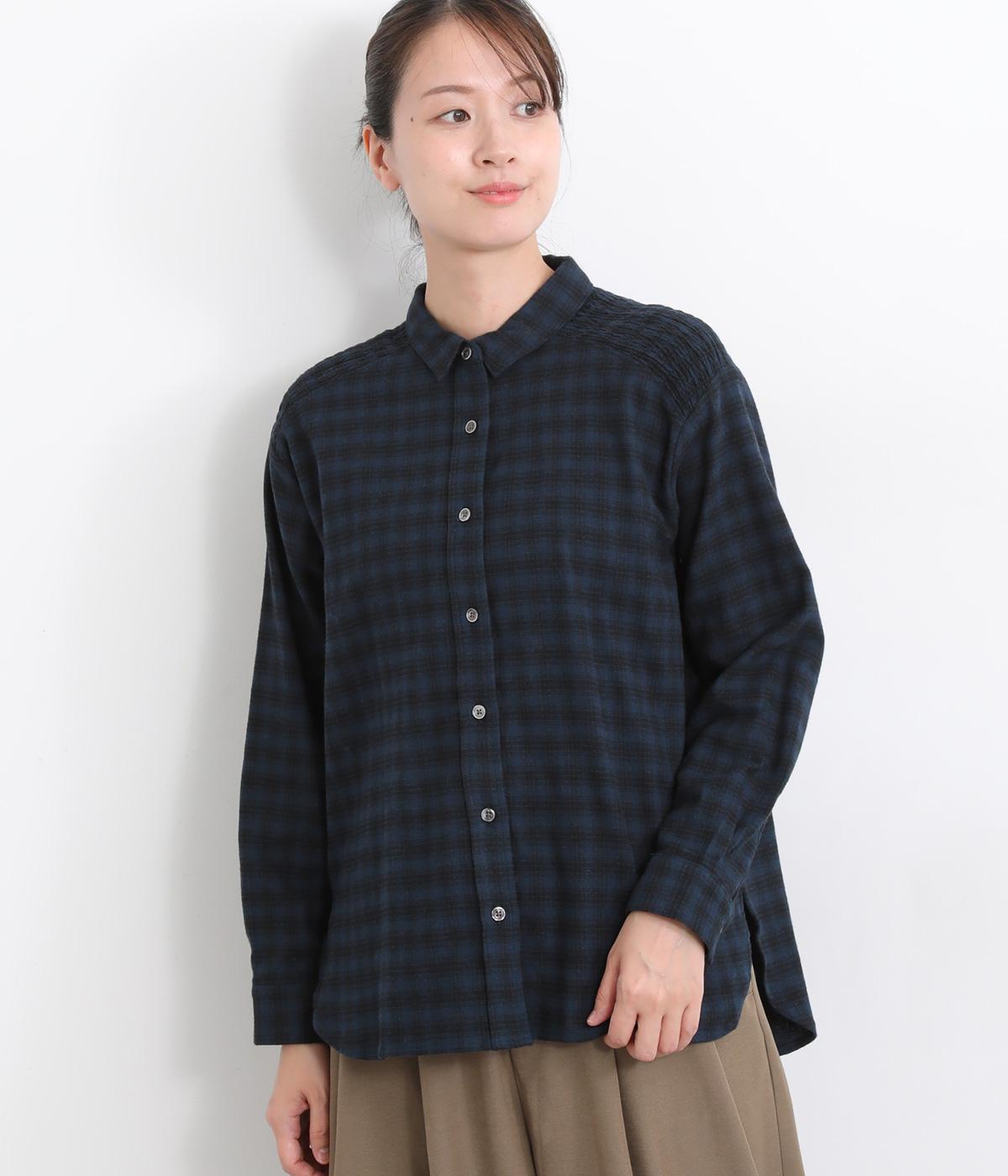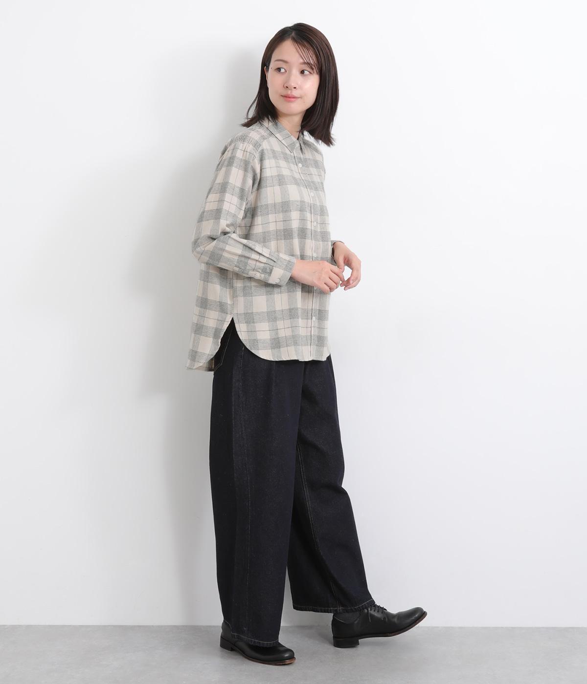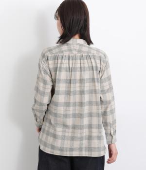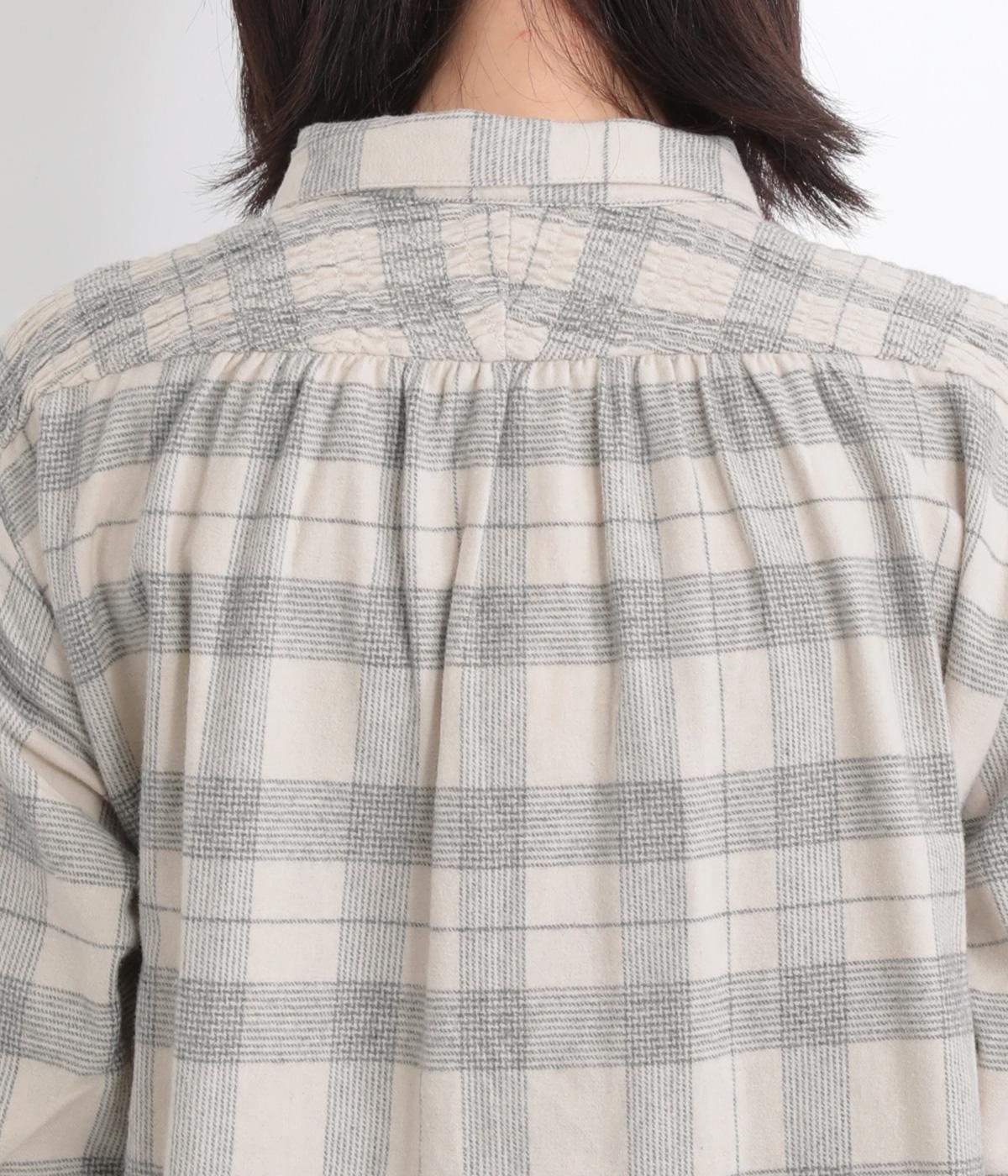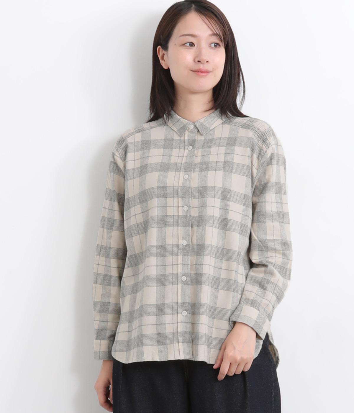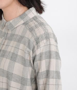 肩から後ろにかけたヨーク部分のシャーリングが特徴的な一枚。カジュアルスタイルの定番チェック柄も、いつもより表情豊かに見えます。ややゆとりのあるシルエットでリラックス感があり、季節の変わり目には羽織り使いもおすすめ。