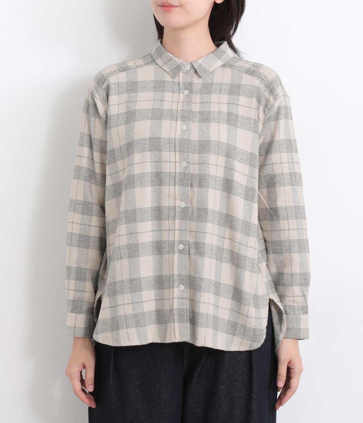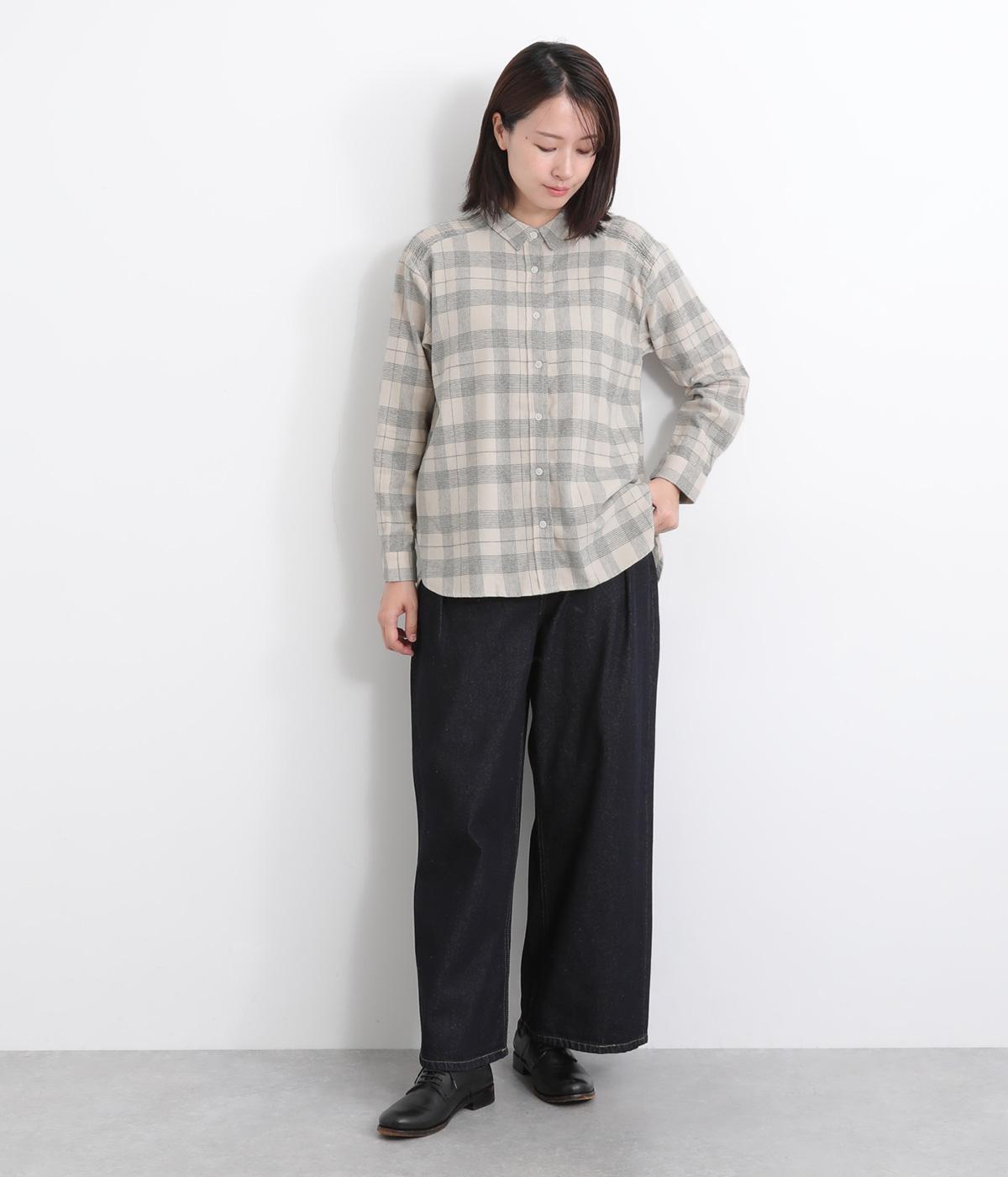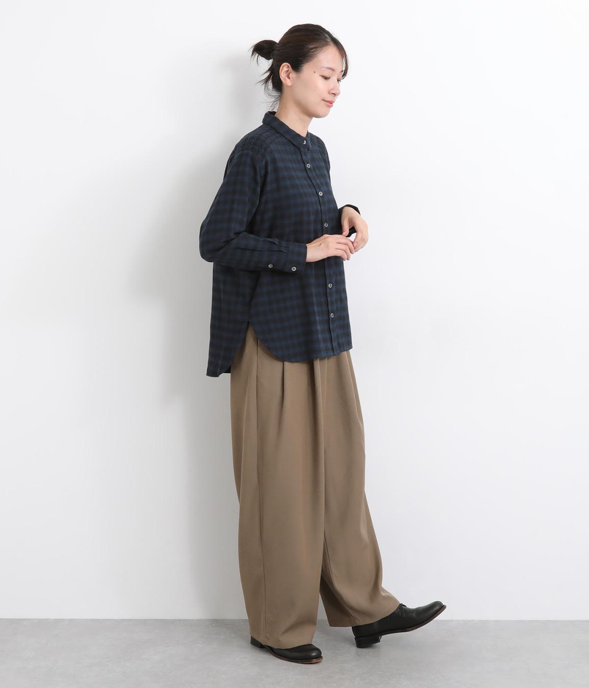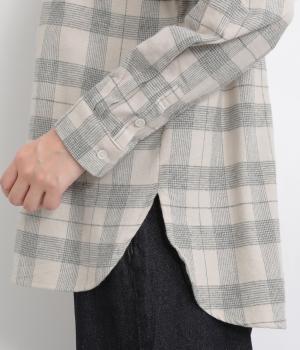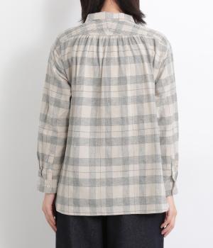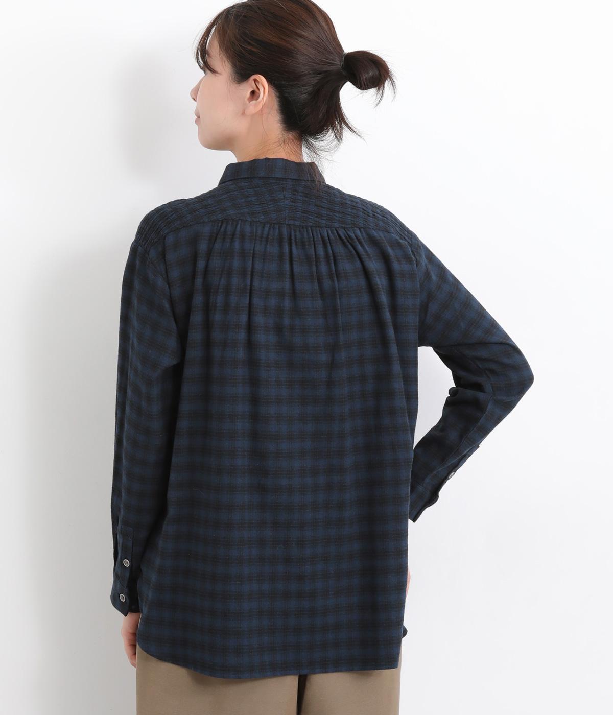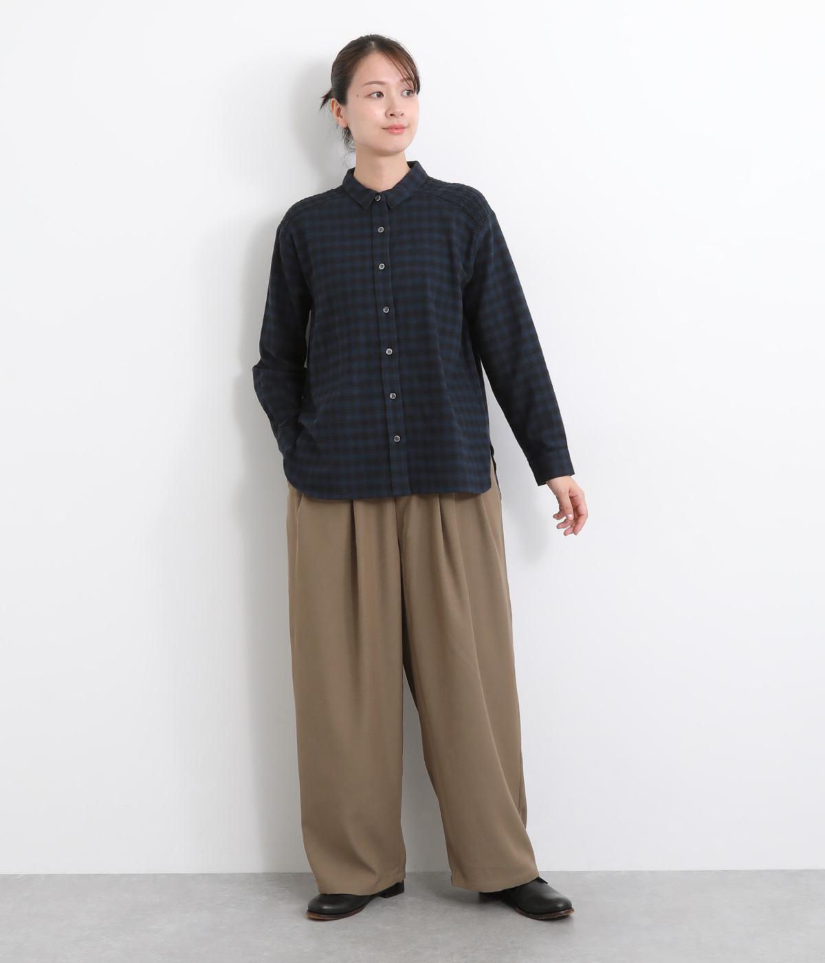 肩から後ろにかけたヨーク部分のシャーリングが特徴的な一枚。カジュアルスタイルの定番チェック柄も、いつもより表情豊かに見えます。ややゆとりのあるシルエットでリラックス感があり、季節の変わり目には羽織り使いもおすすめ。