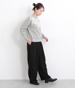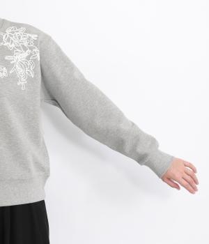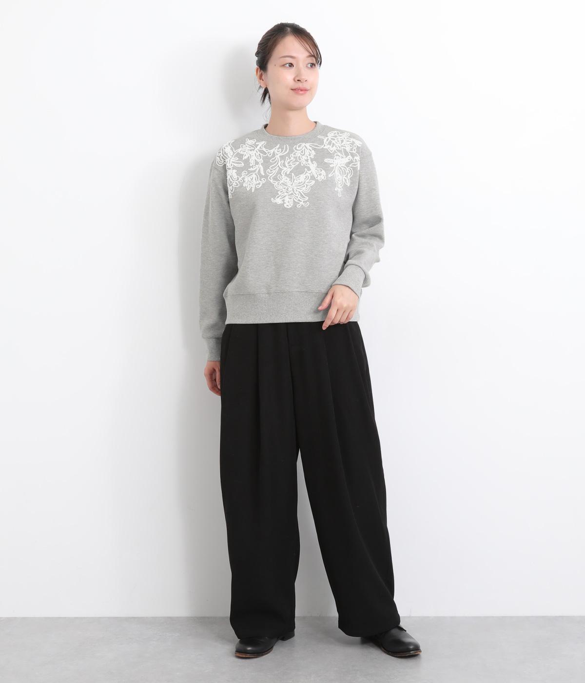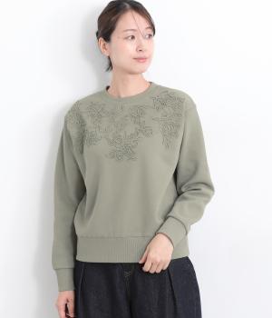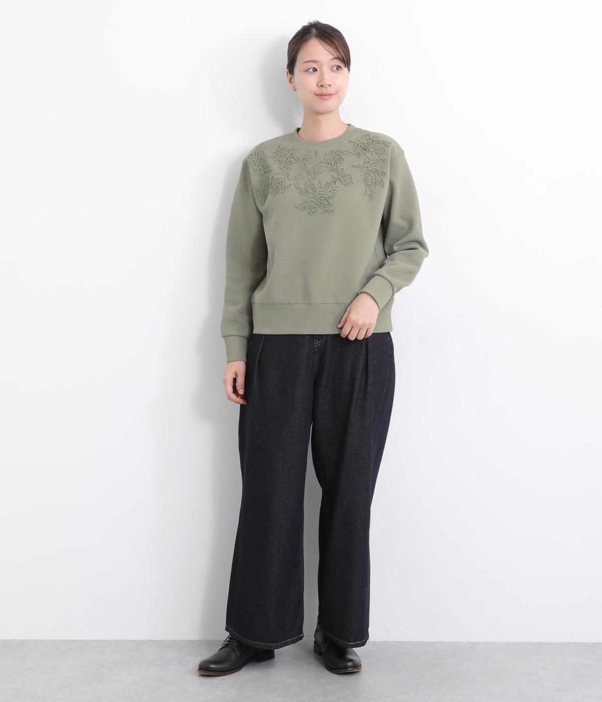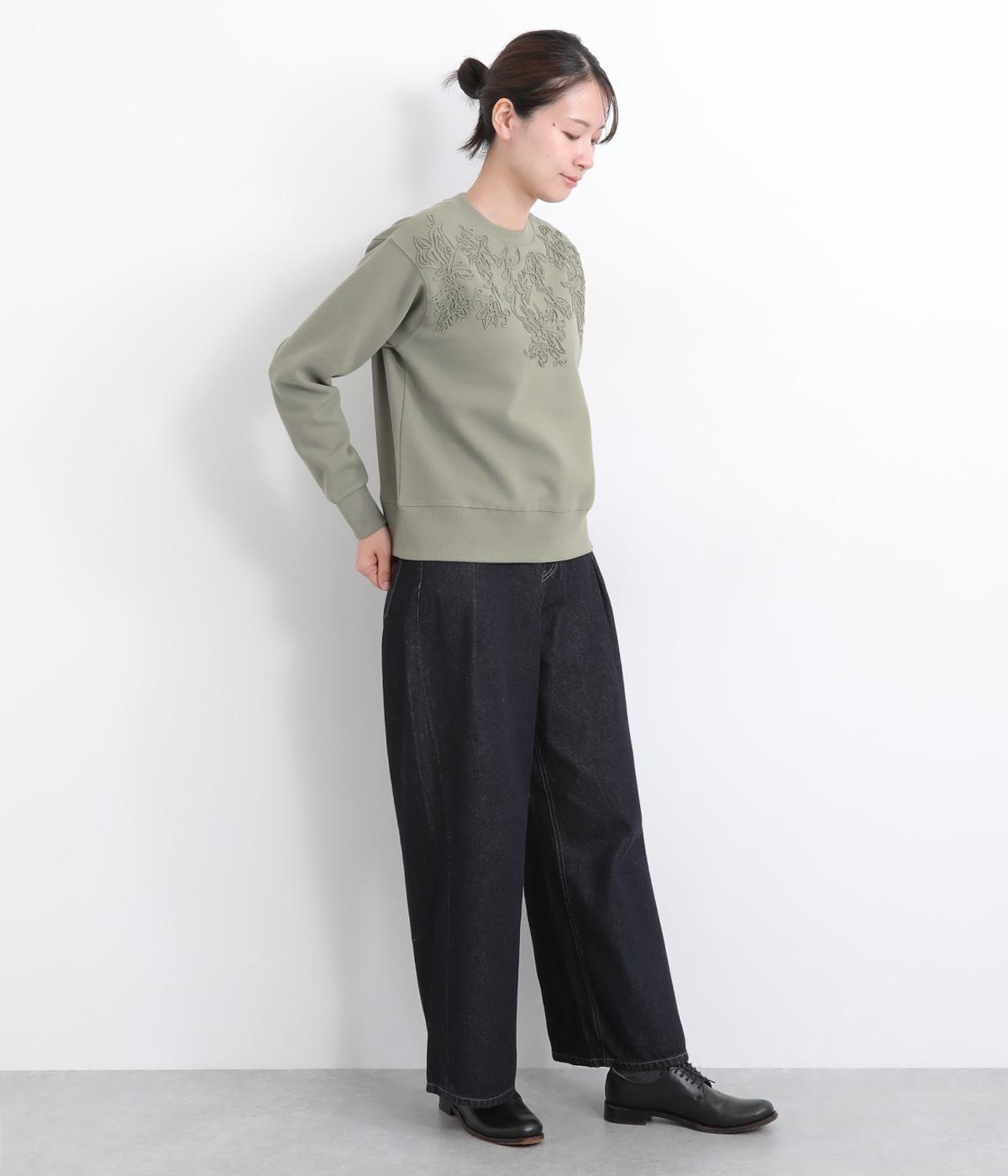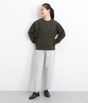 エンブロイダリー刺しゅうで顔まわりを華やかに魅せてプルオーバー。スウェット感覚でカジュアルに着やすく、手抜きに見えないお洒落感も両立。ルーズ見えを回避したシルエットもポイントで、ラフだけどすっきりしたスタイリングに。