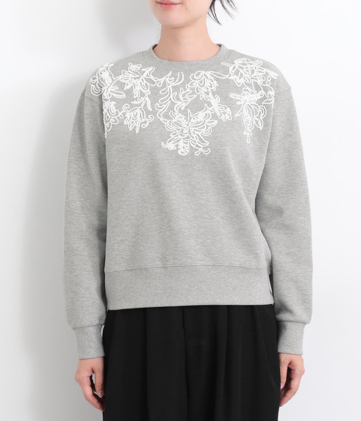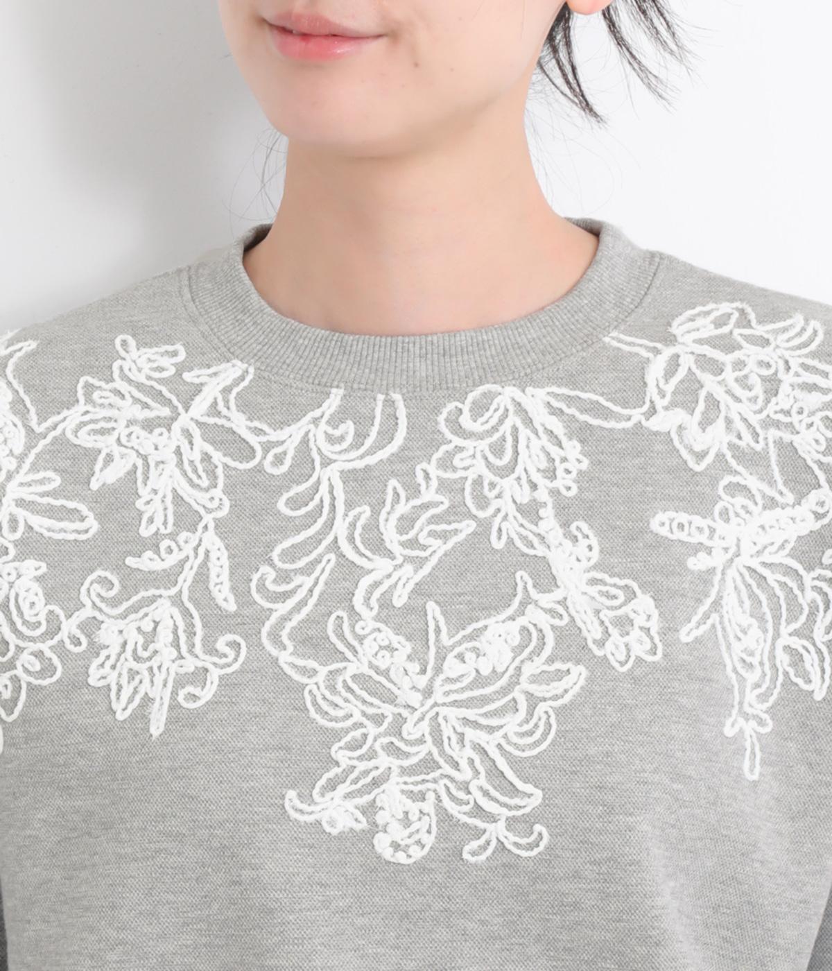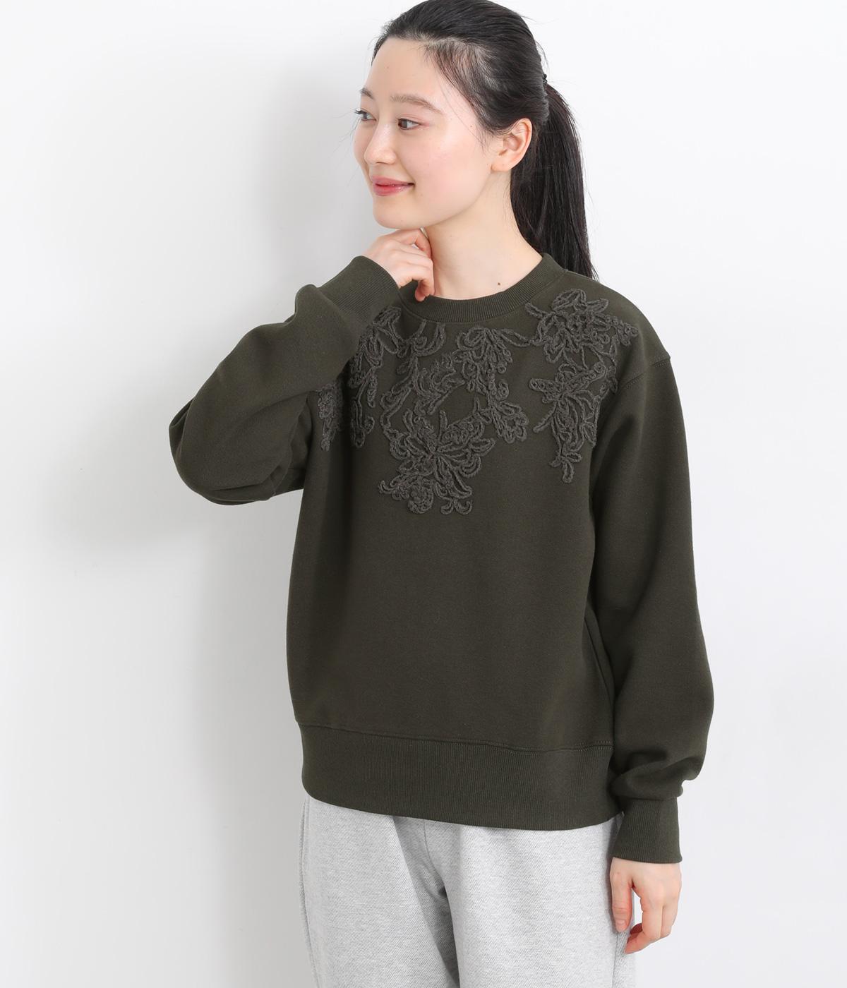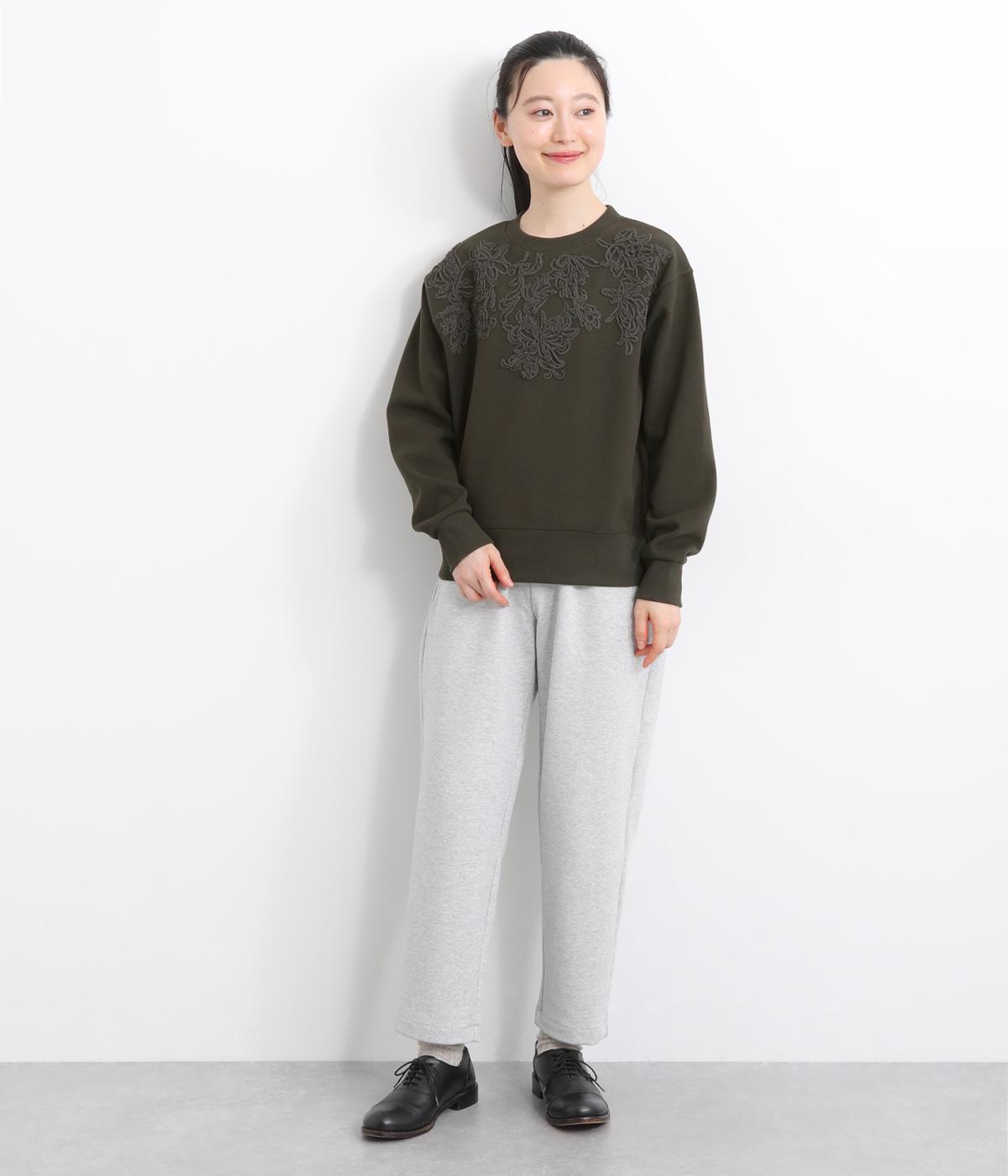 エンブロイダリー刺しゅうで顔まわりを華やかに魅せてプルオーバー。スウェット感覚でカジュアルに着やすく、手抜きに見えないお洒落感も両立。ルーズ見えを回避したシルエットもポイントで、ラフだけどすっきりしたスタイリングに。