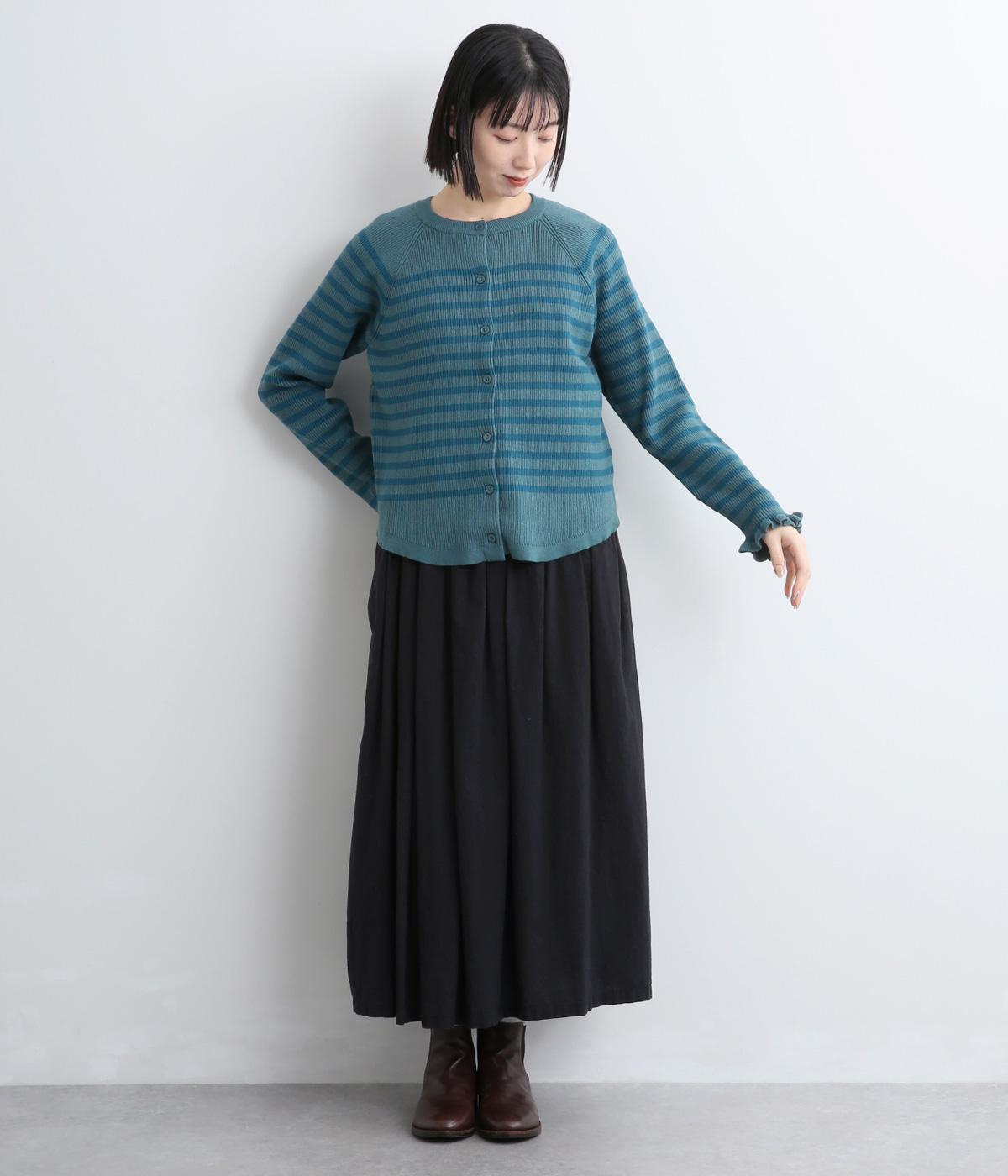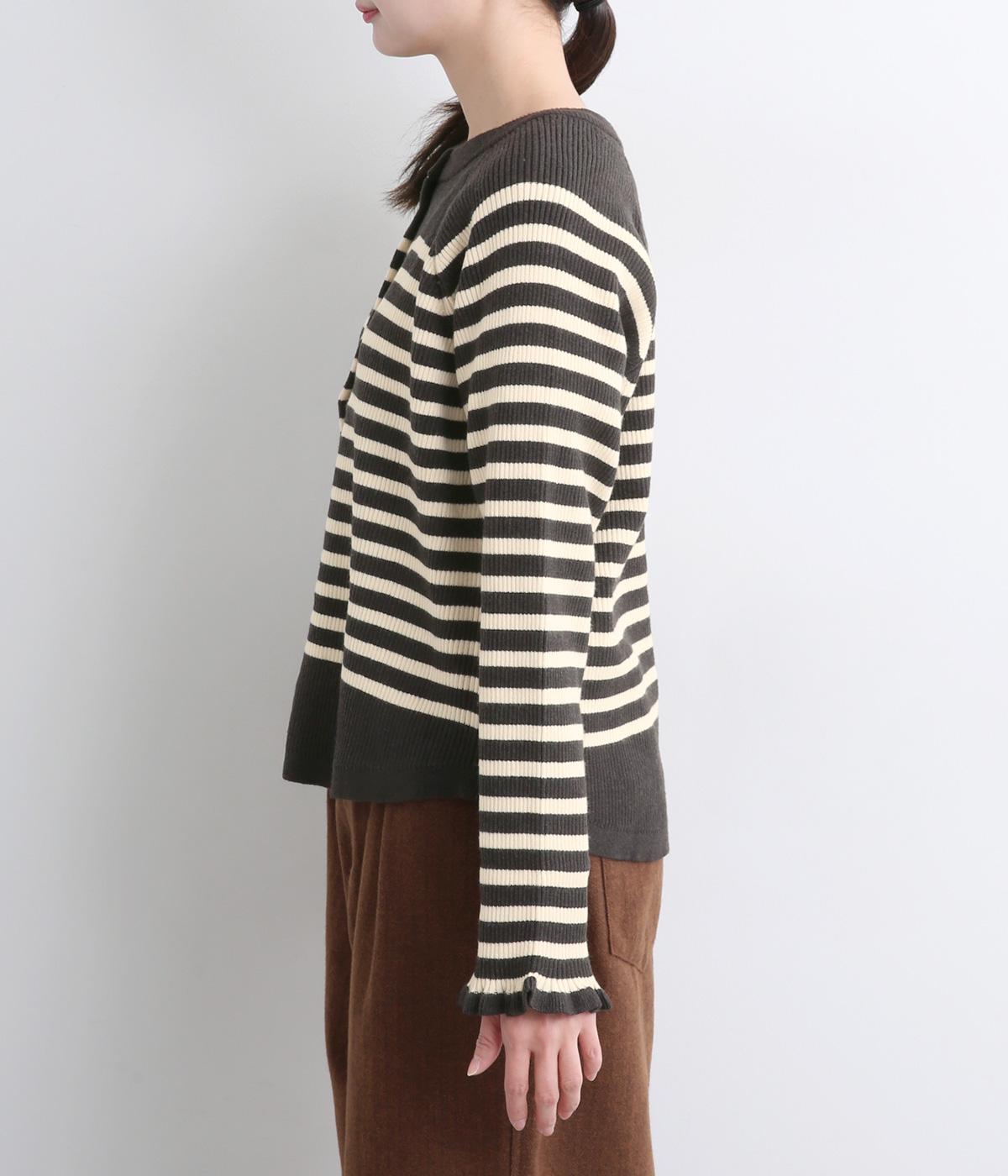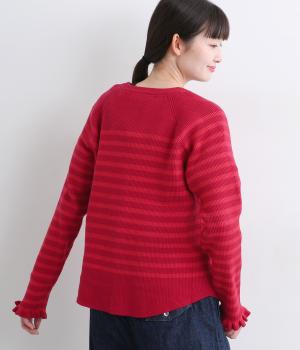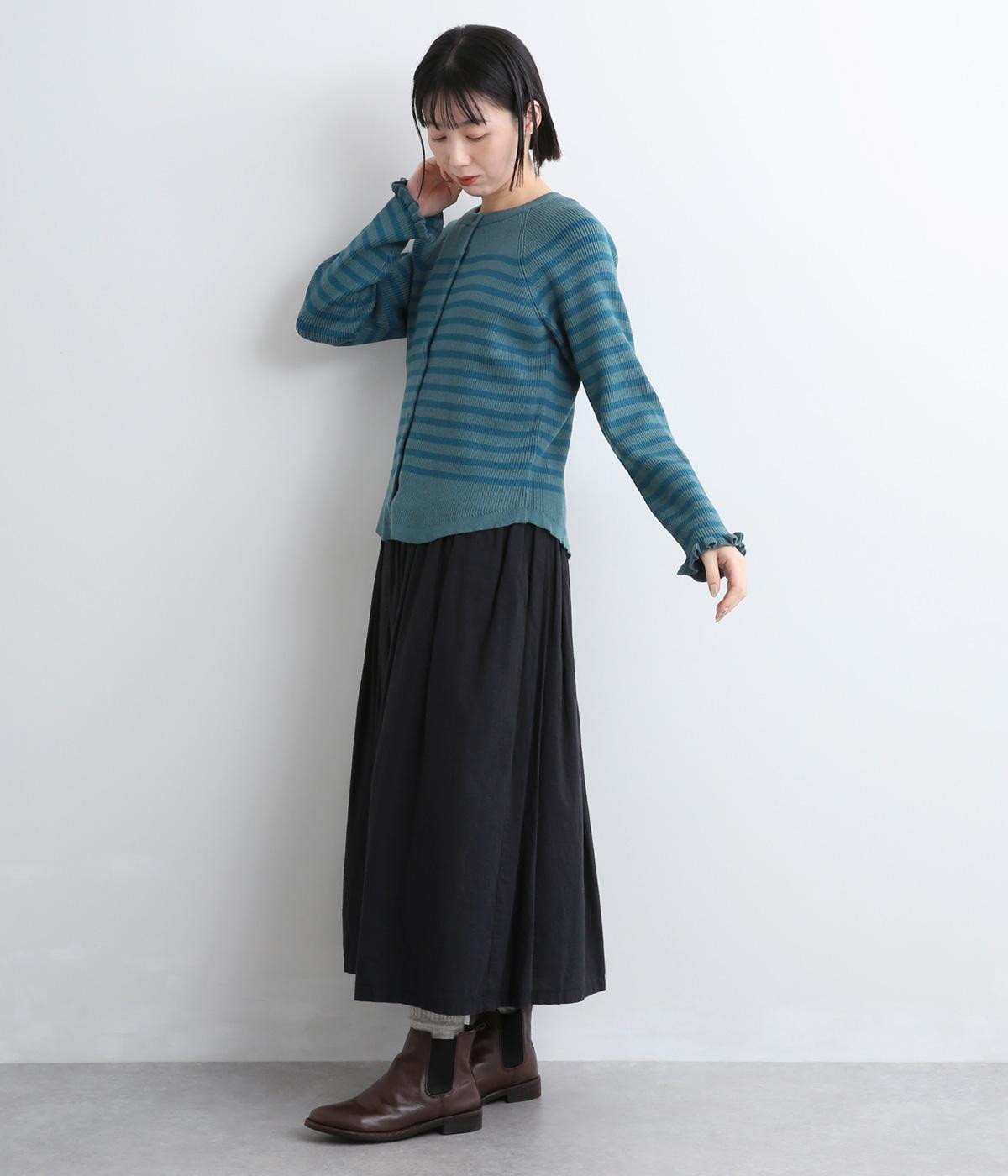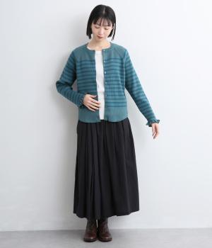 無地とのバランスや袖口のフリルでカジュアルすぎない印象に仕上げました。まあるい線を描く裾のラインが女性らしいシルエットをつくり、装いにニュアンスをプラス。伸縮性に優れた抜群の着心地で、思わず手に取ってしまう一枚です。