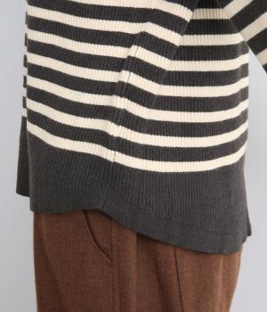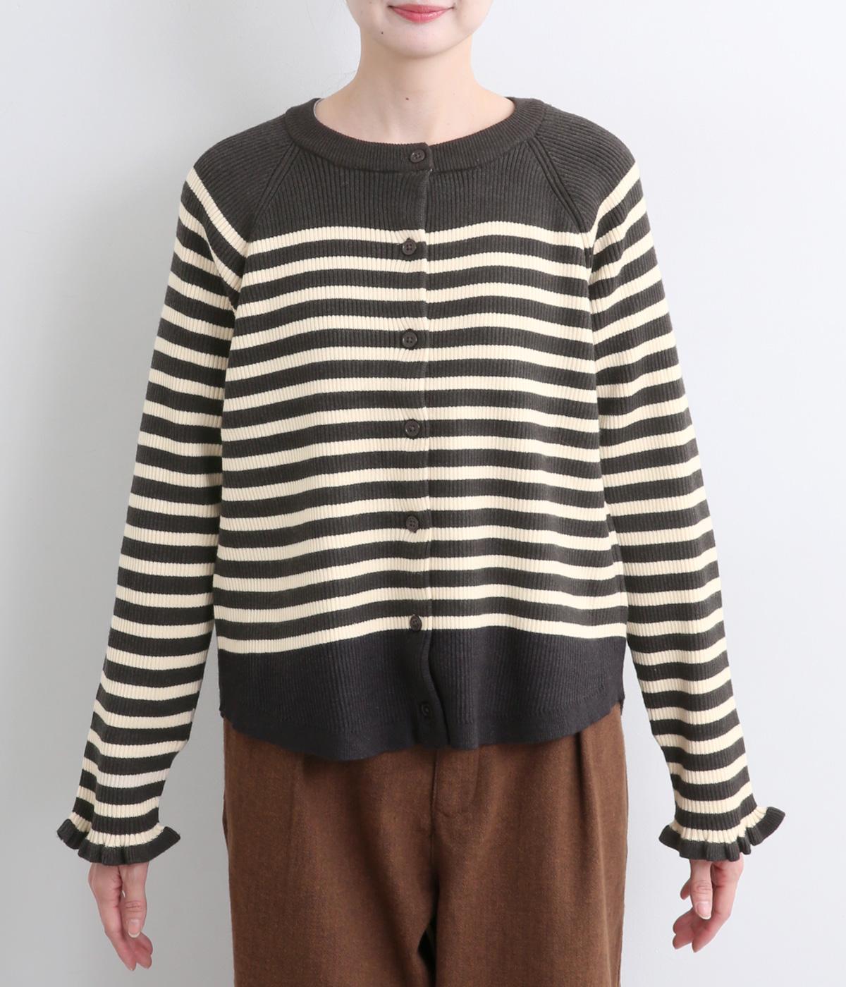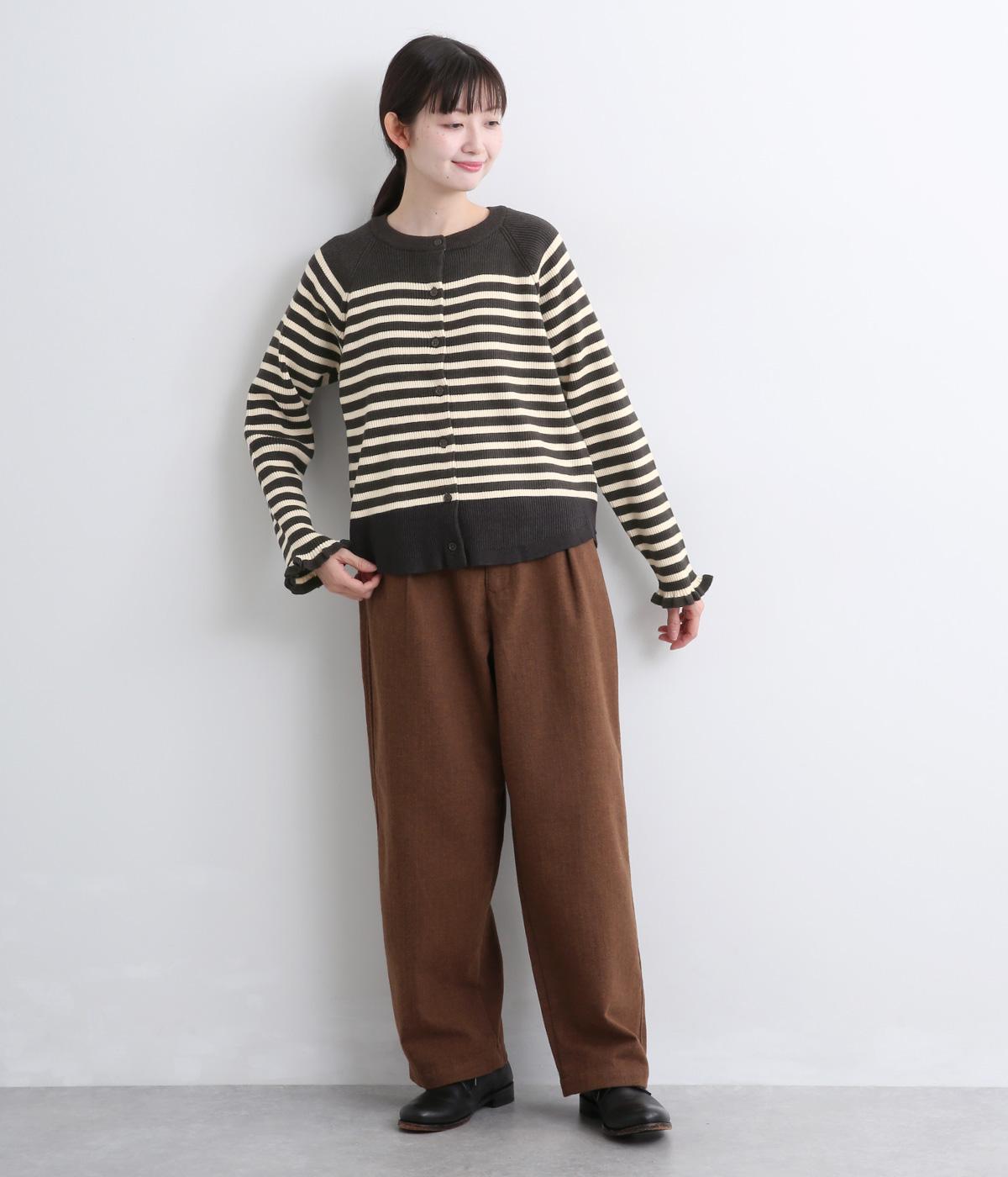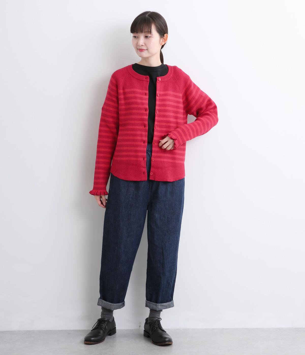 無地とのバランスや袖口のフリルでカジュアルすぎない印象に仕上げました。まあるい線を描く裾のラインが女性らしいシルエットをつくり、装いにニュアンスをプラス。伸縮性に優れた抜群の着心地で、思わず手に取ってしまう一枚です。