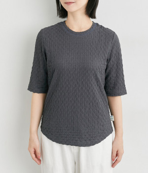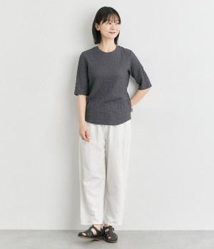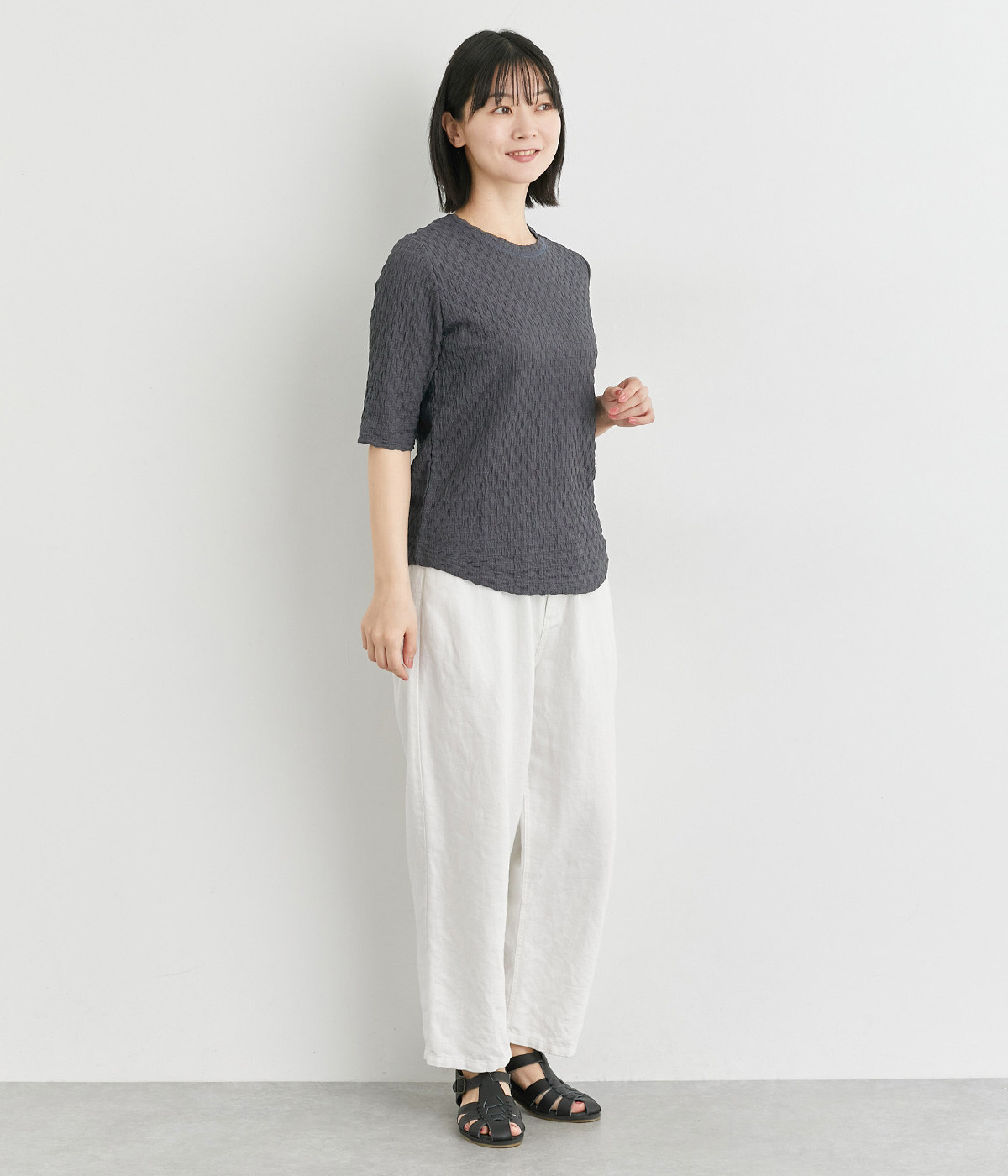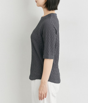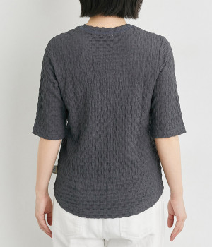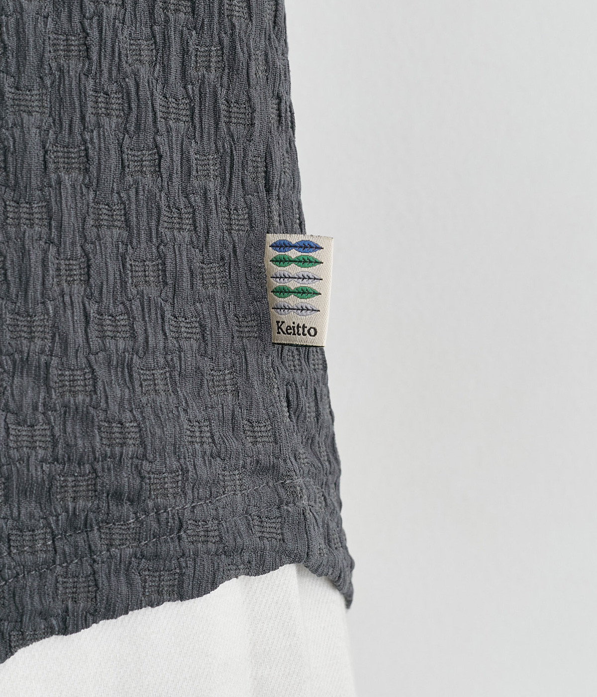ブロック柄のシャーリング生地が特徴的なカットプルオーバーです。やや伸縮性があり肌へのまとわりが少ない生地感で、汗ばむ季節も快適に着用できます。