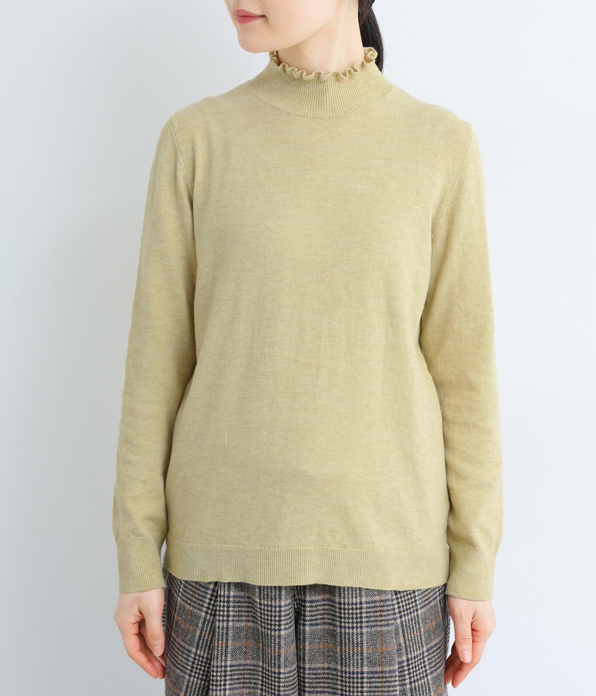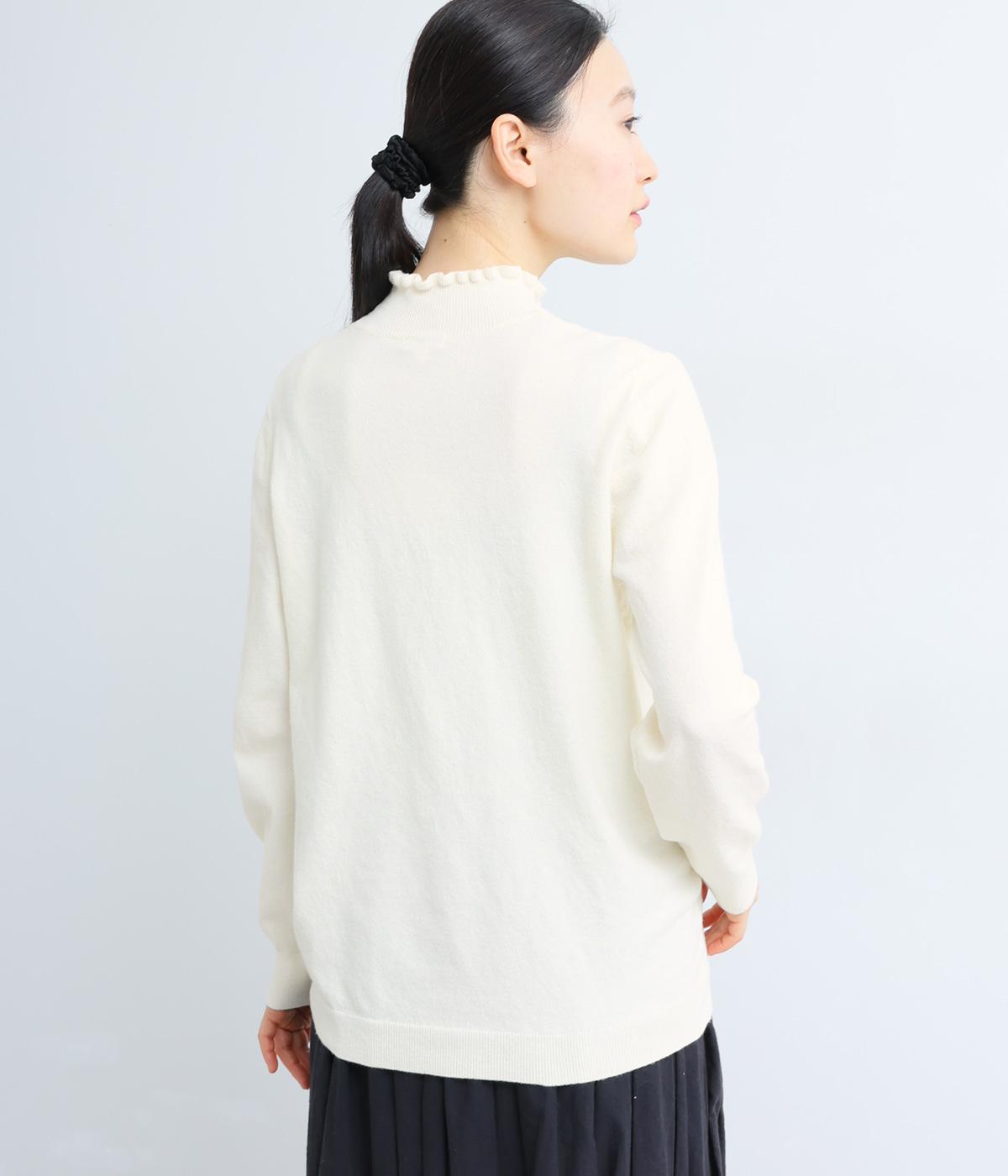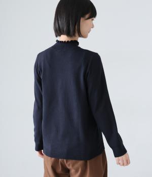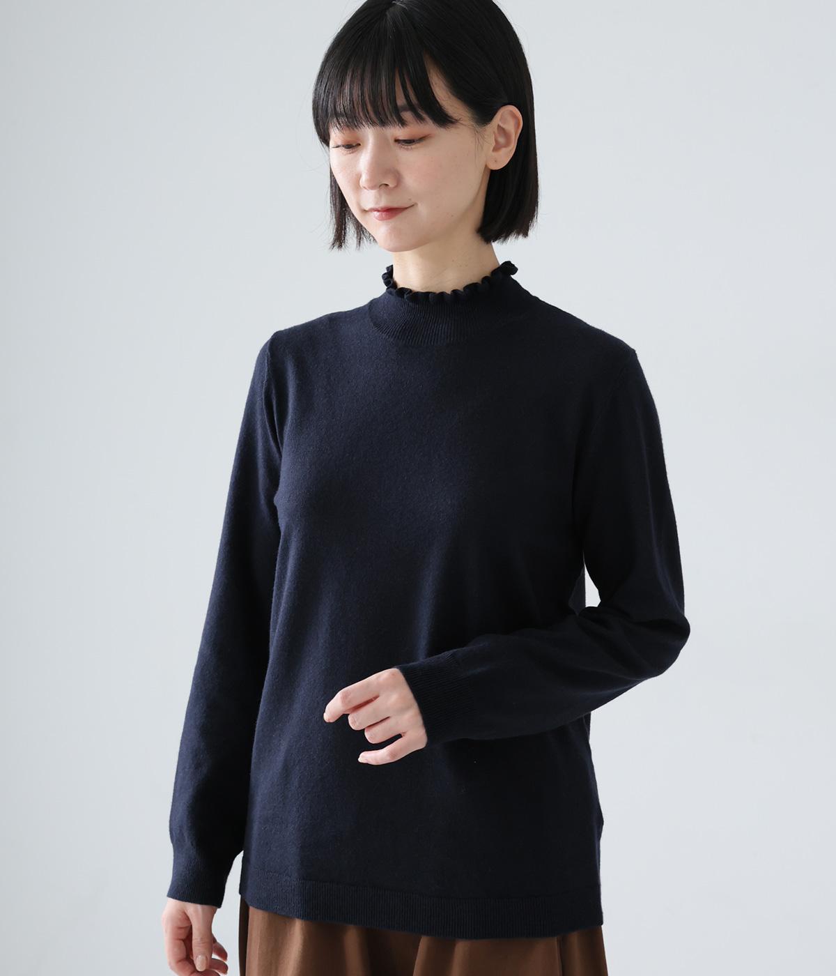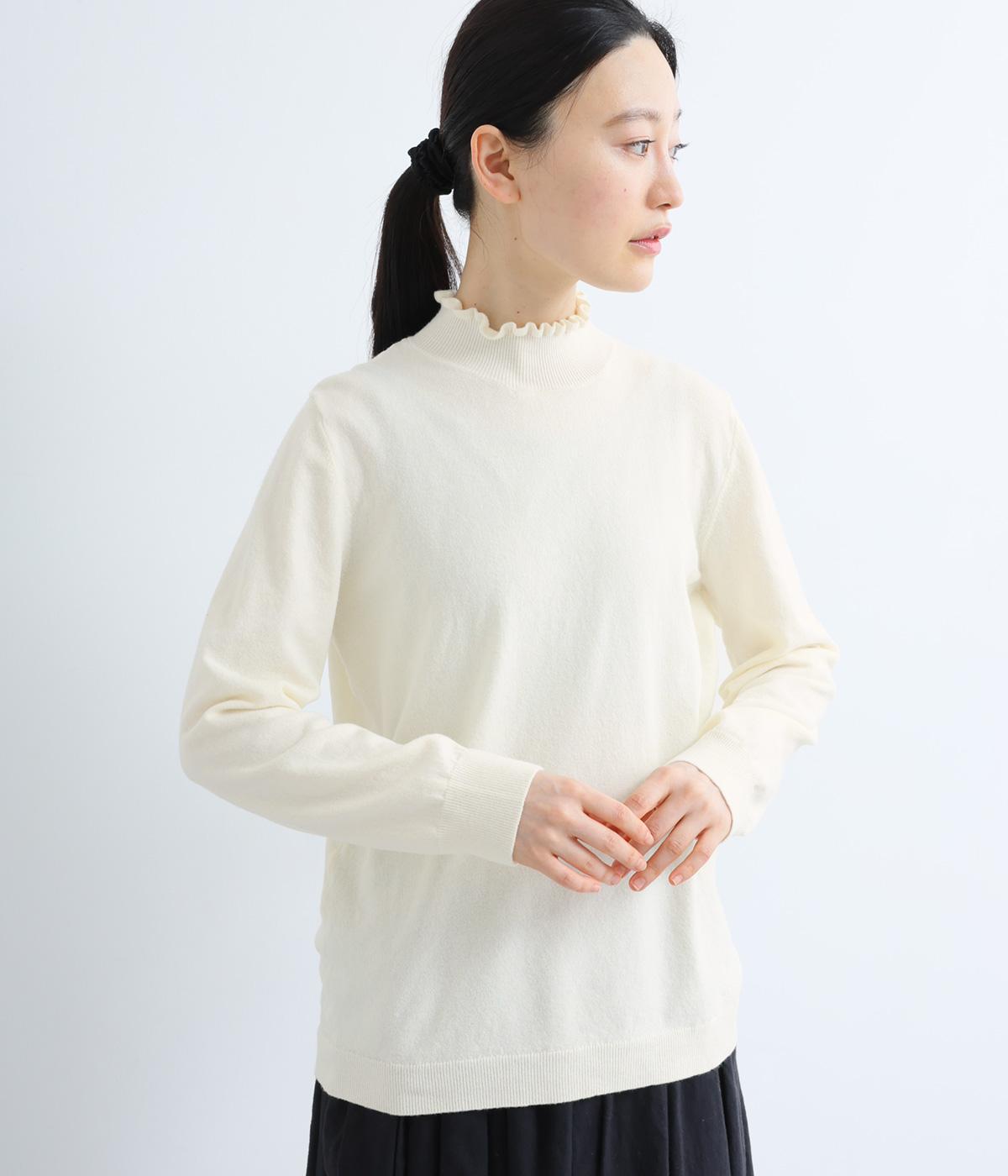 襟元の控えめなフリルが大人の愛らしさを演出するニットプルオーバーです。すっきりとしたシルエットとシンプルなデザインで、一枚ではもちろんインナーとしても活躍。ボリュームのあるボトムスや柄物にも好相性です。
