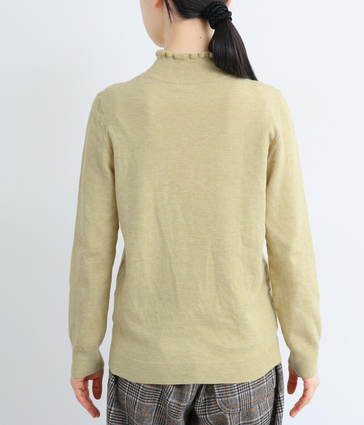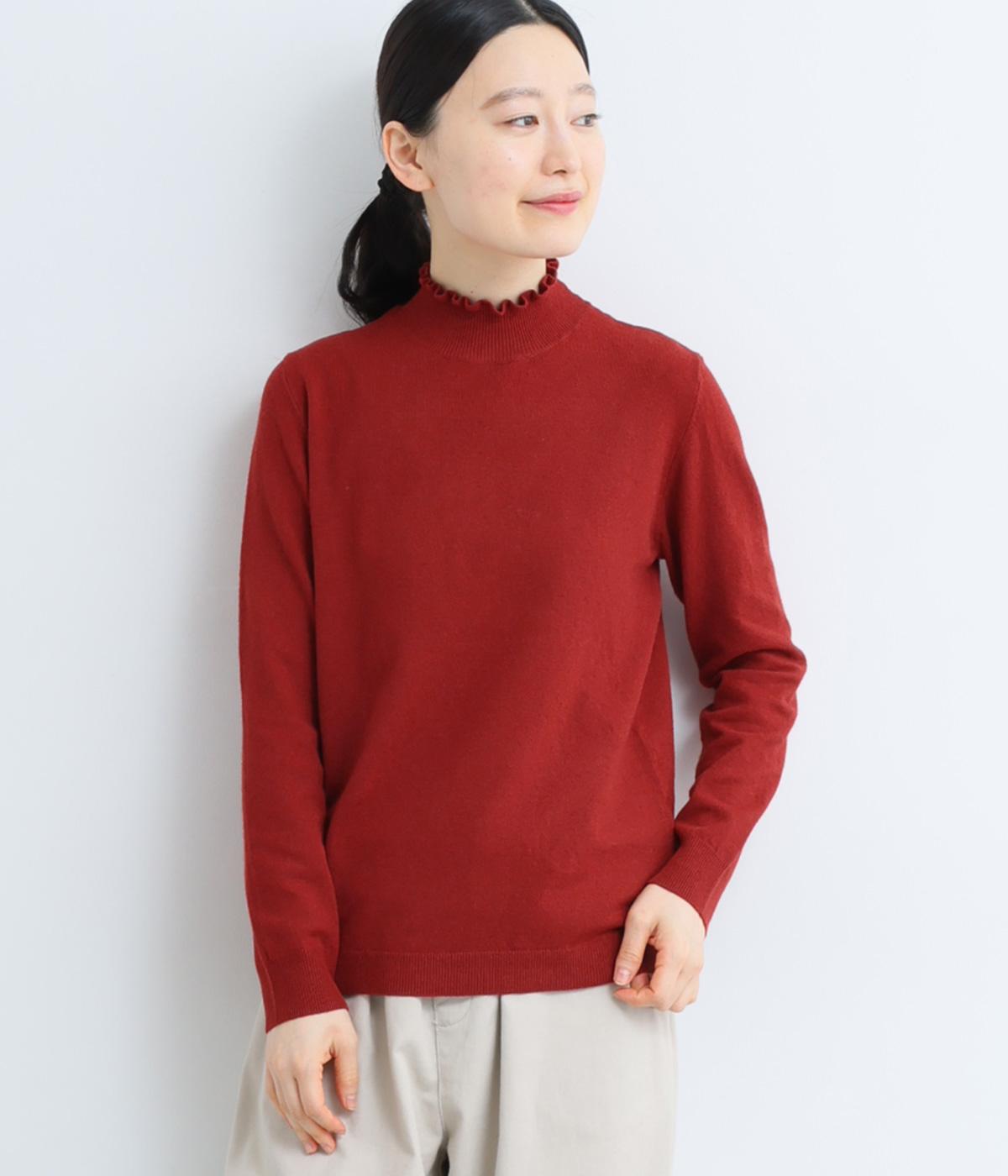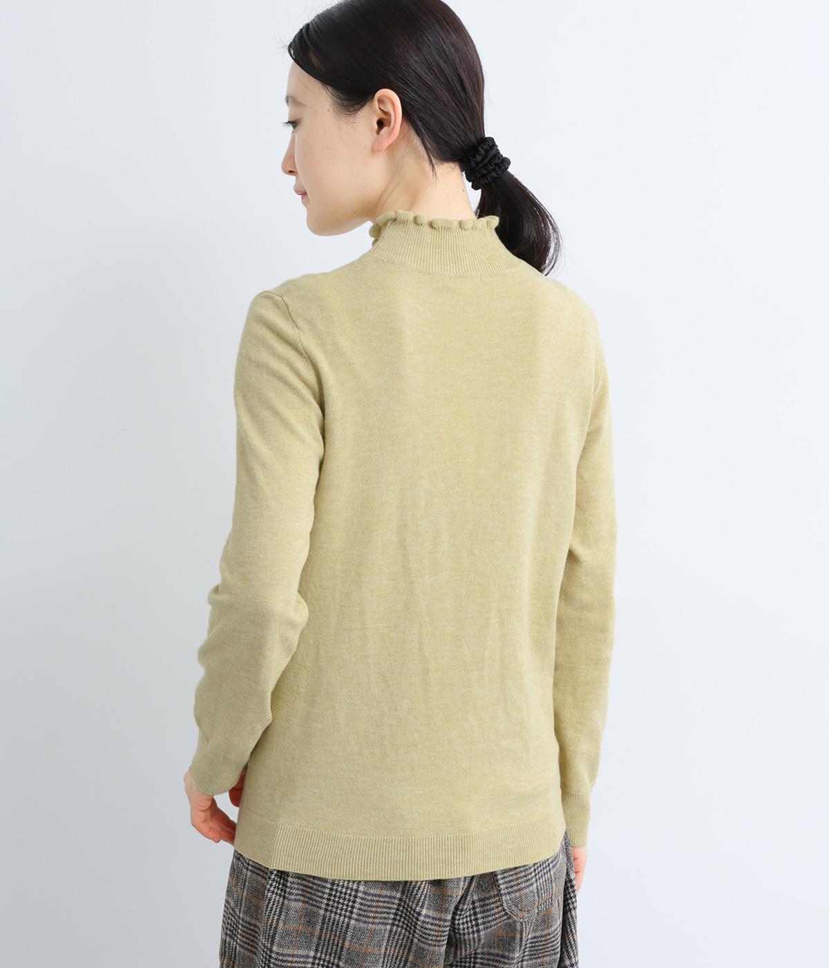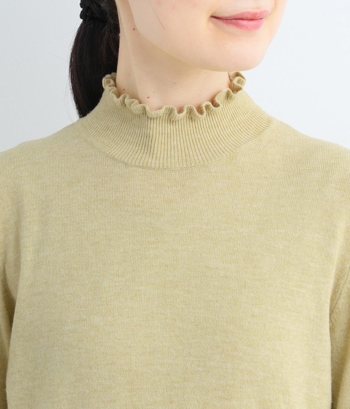 襟元の控えめなフリルが大人の愛らしさを演出するニットプルオーバーです。すっきりとしたシルエットとシンプルなデザインで、一枚ではもちろんインナーとしても活躍。ボリュームのあるボトムスや柄物にも好相性です。