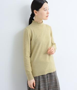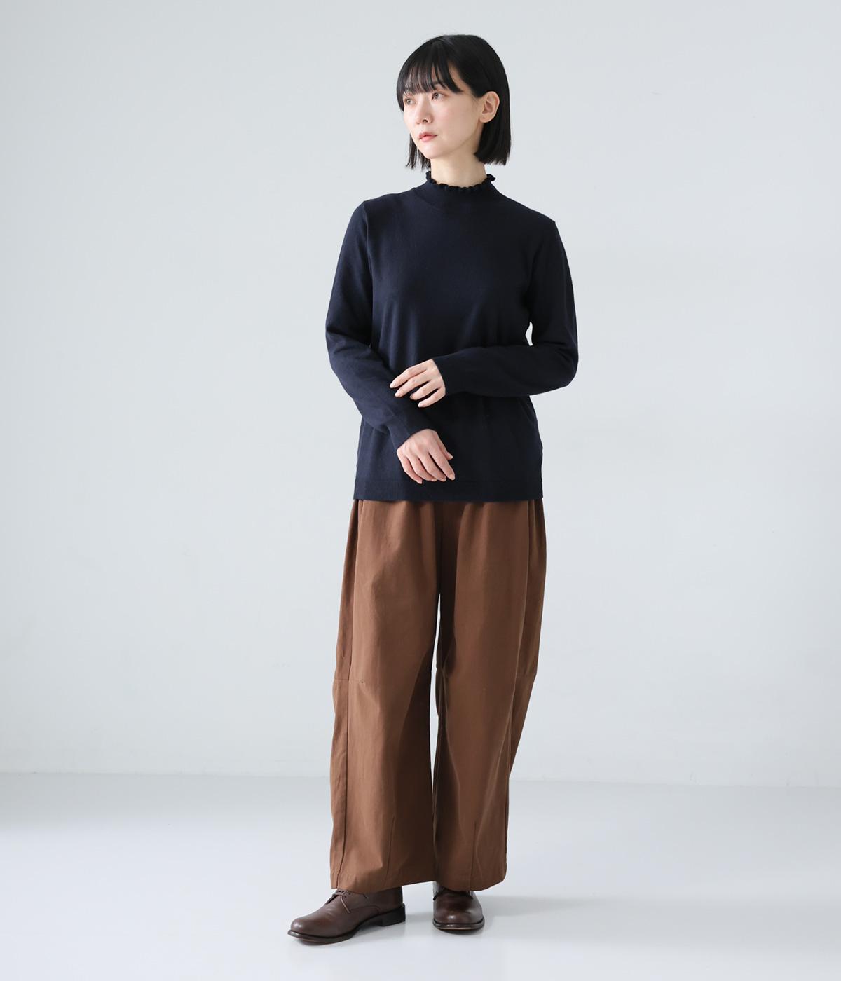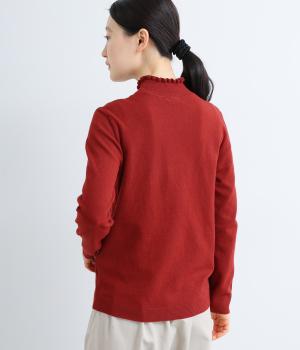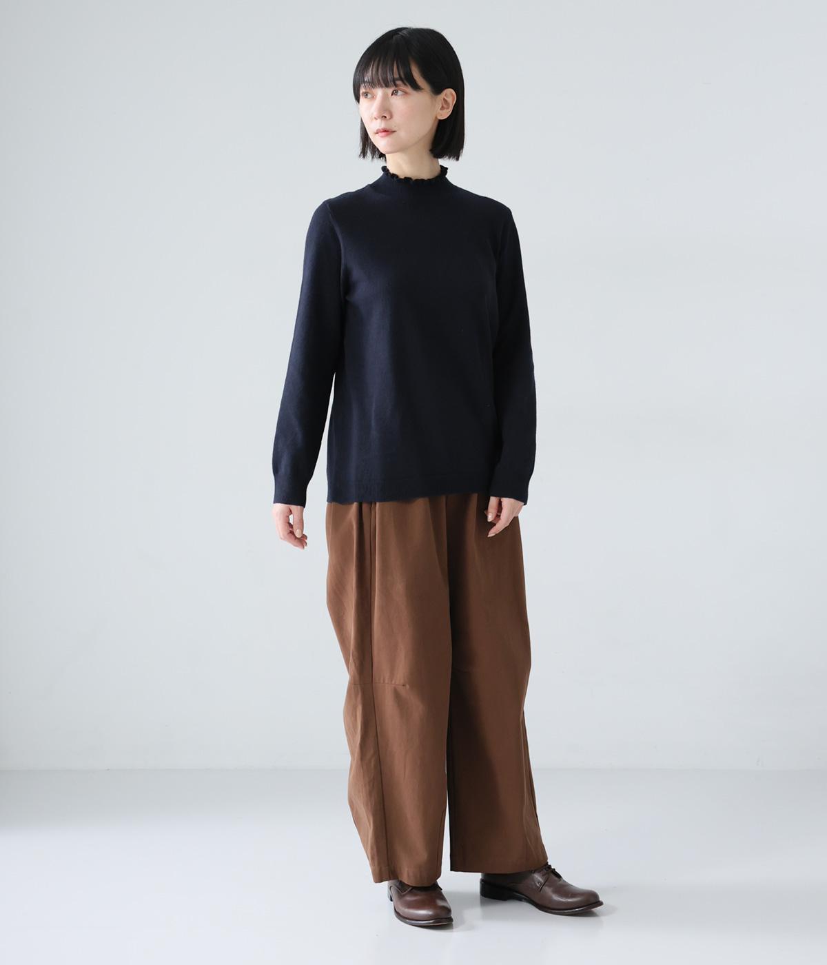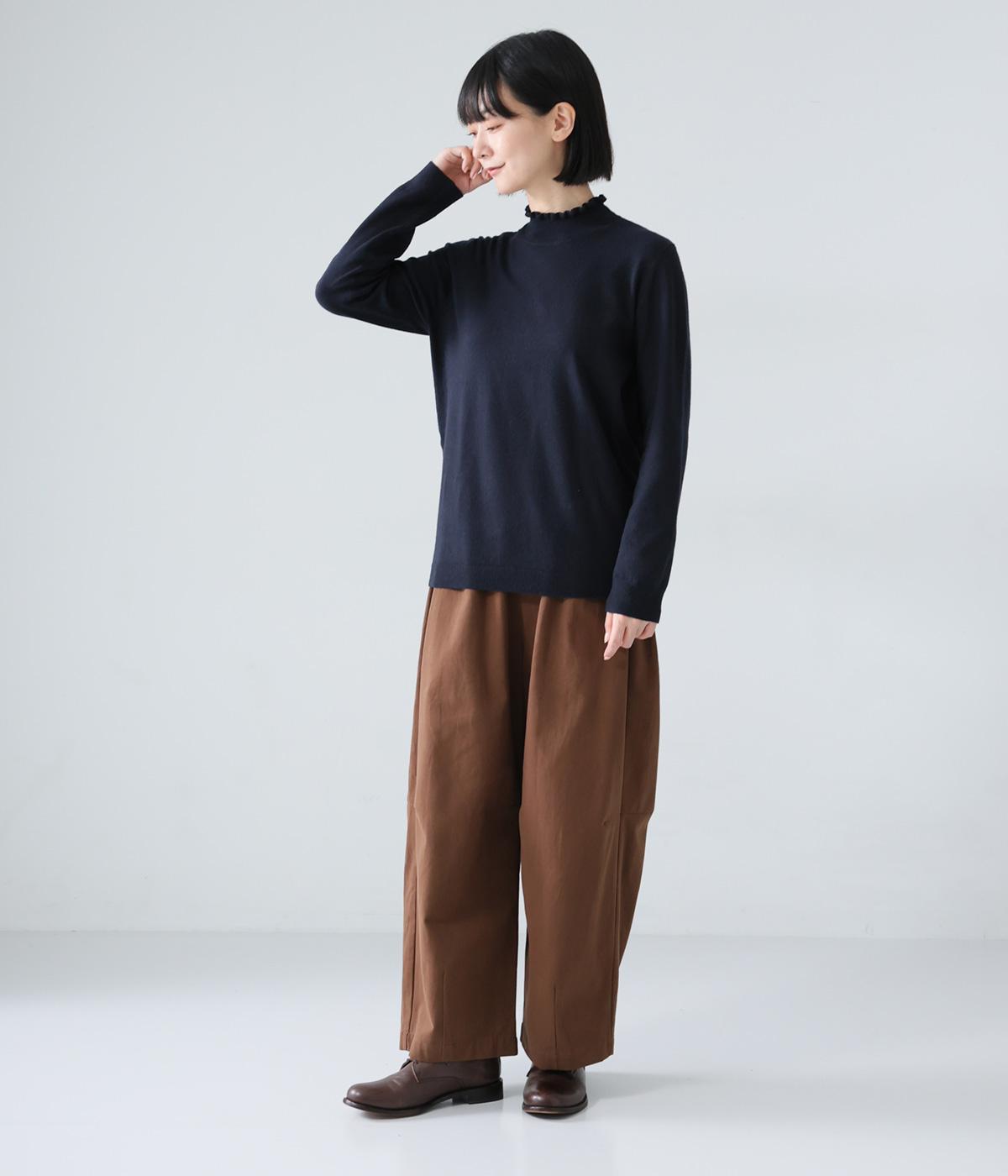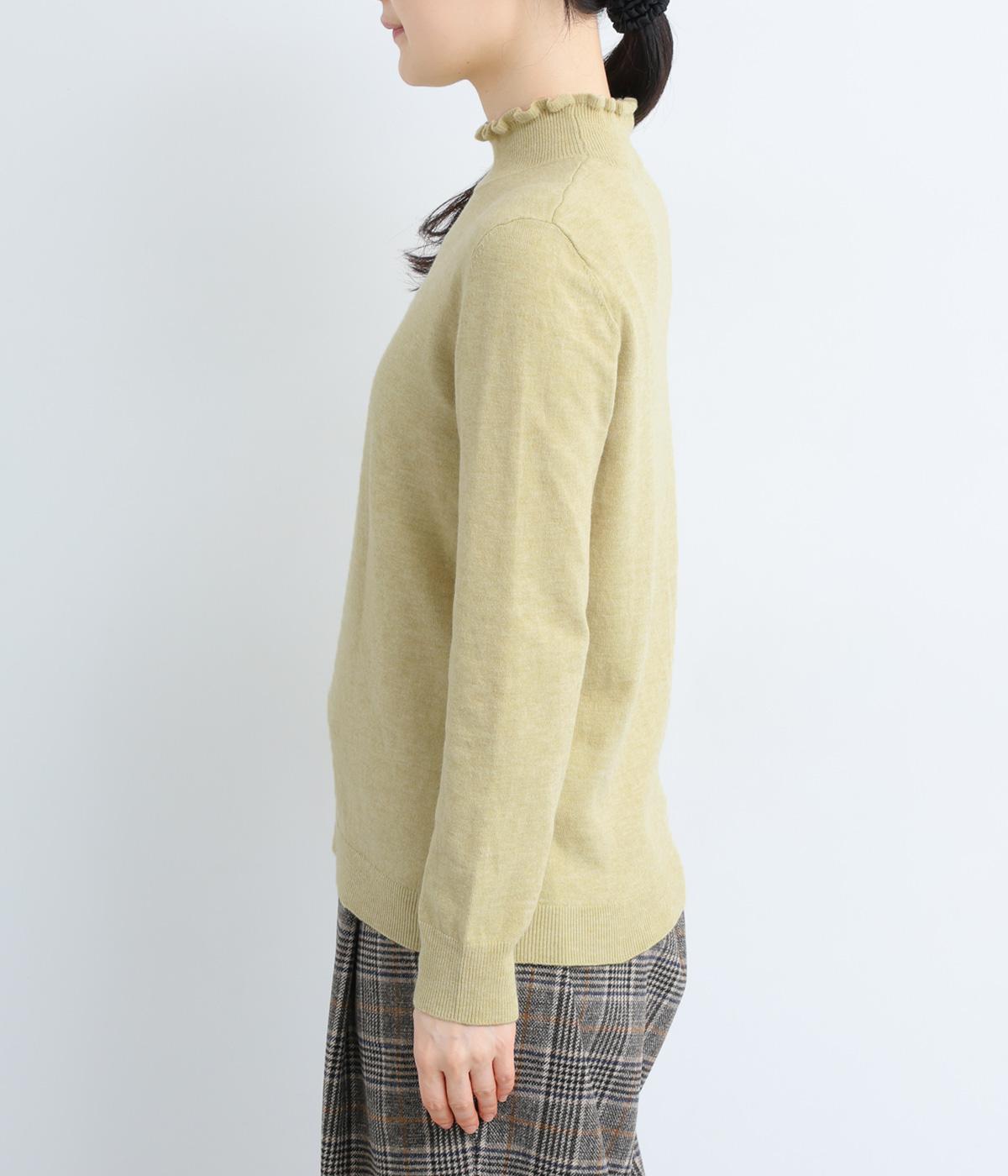 襟元の控えめなフリルが大人の愛らしさを演出するニットプルオーバーです。すっきりとしたシルエットとシンプルなデザインで、一枚ではもちろんインナーとしても活躍。ボリュームのあるボトムスや柄物にも好相性です。
