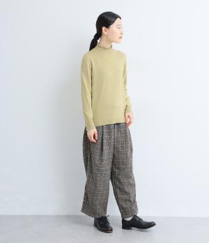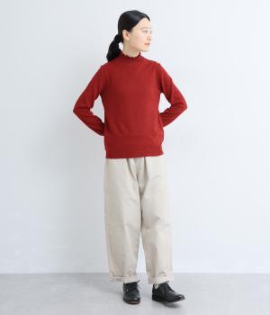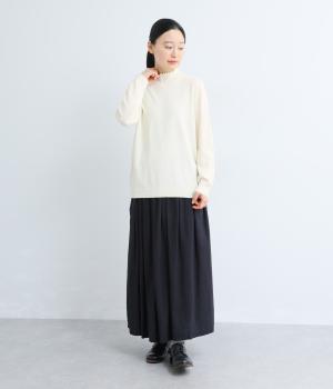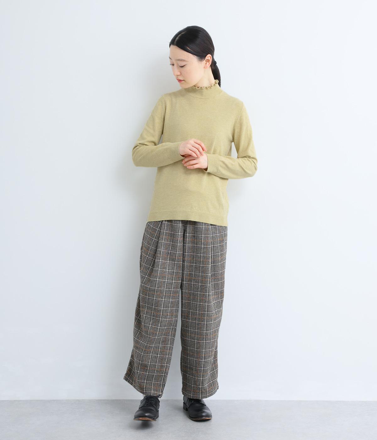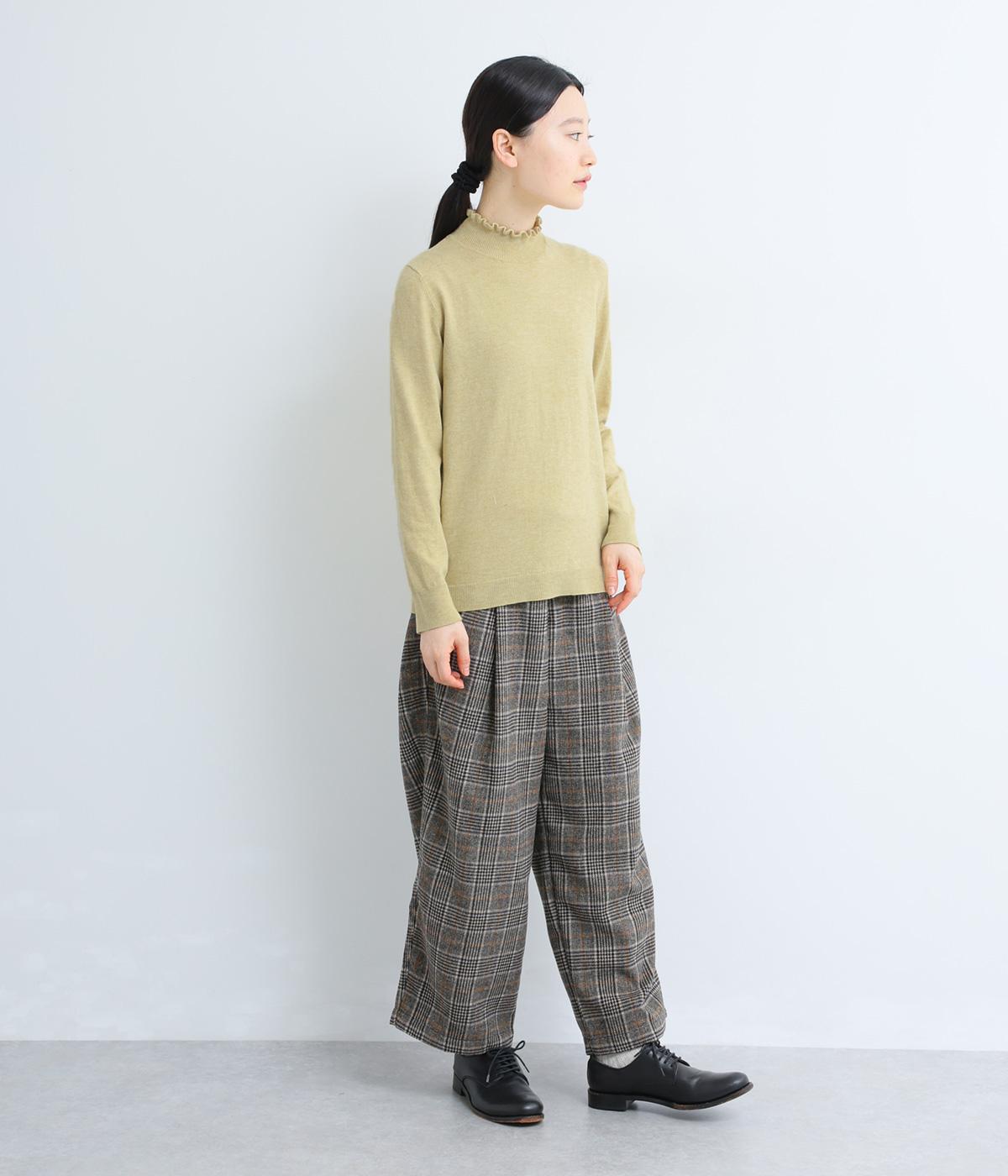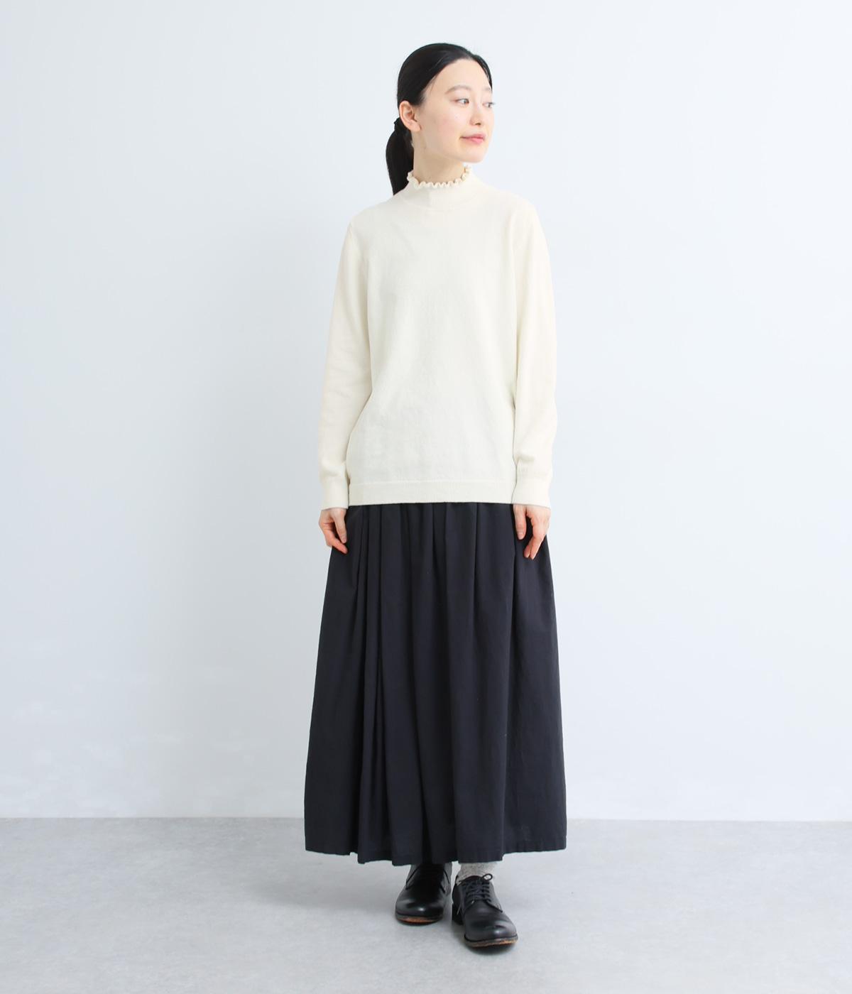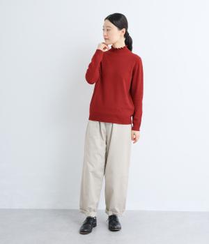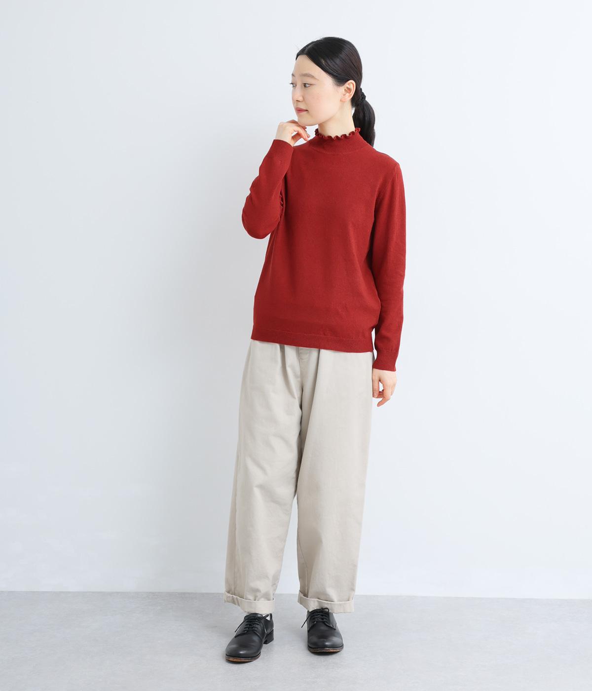 襟元の控えめなフリルが大人の愛らしさを演出するニットプルオーバーです。すっきりとしたシルエットとシンプルなデザインで、一枚ではもちろんインナーとしても活躍。ボリュームのあるボトムスや柄物にも好相性です。
