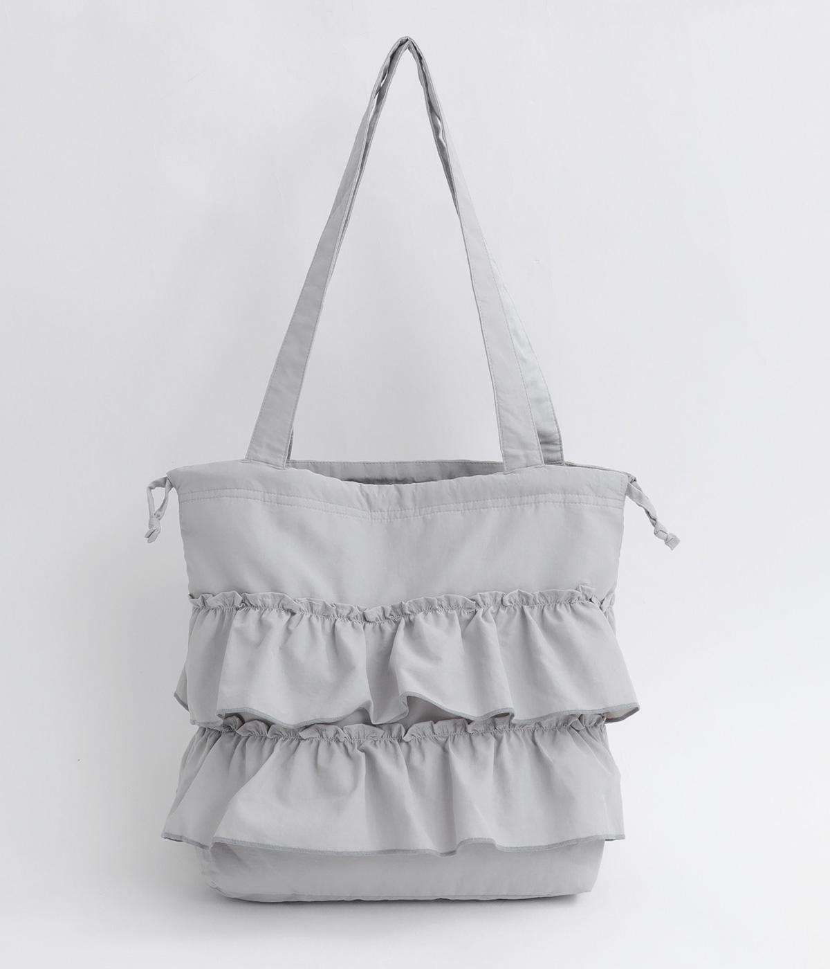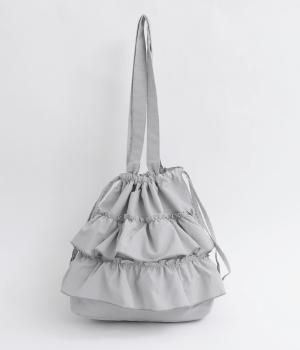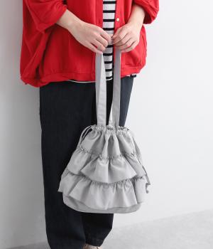 くらげのようにふわんとしたフォルムにフリルディテールが大人かわいい印象の巾着バッグ。どちらもカジュアルテイストな素材を用いているので甘さをほどよく中和させてくれます。手持ちも肩掛けもできるハンドル長さもポイント。