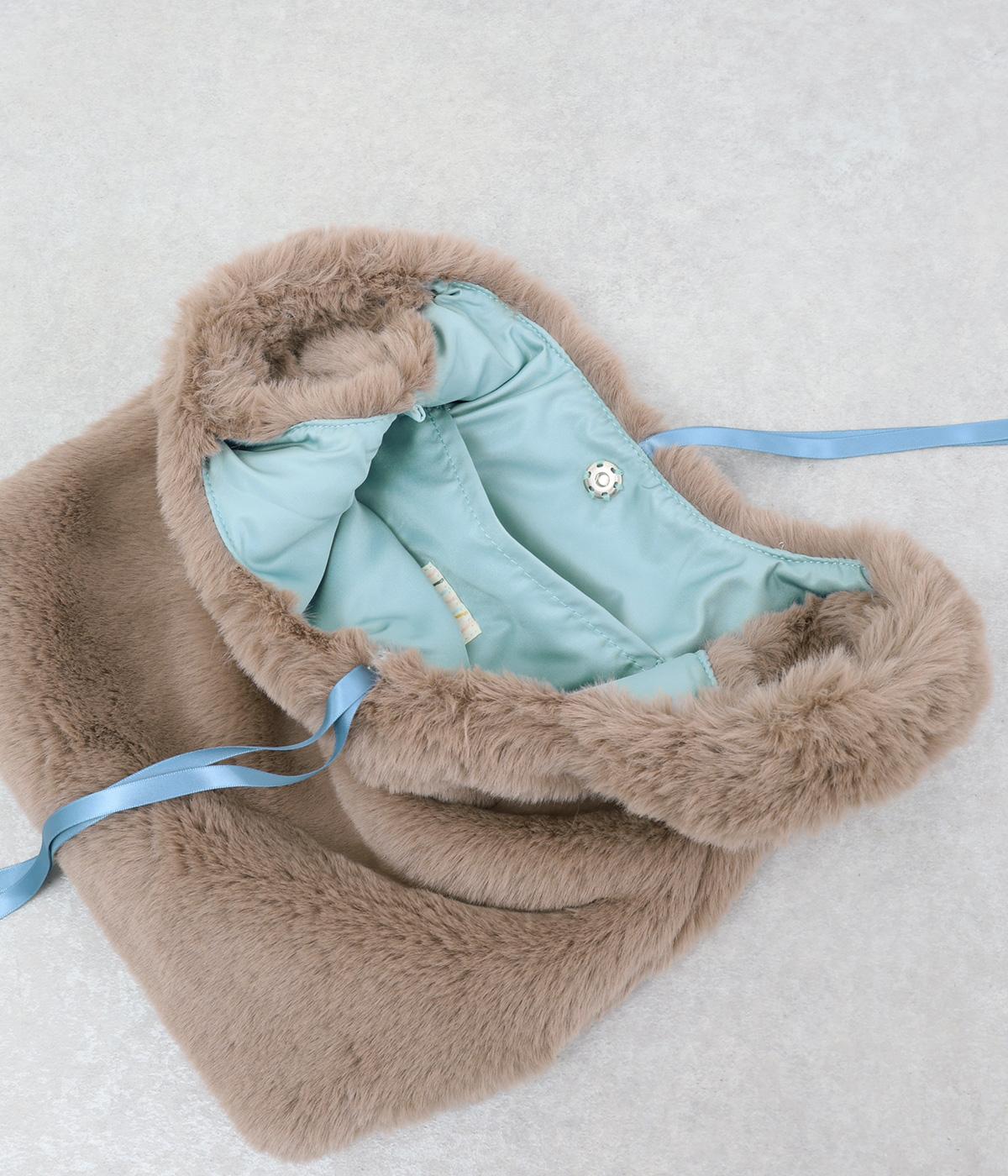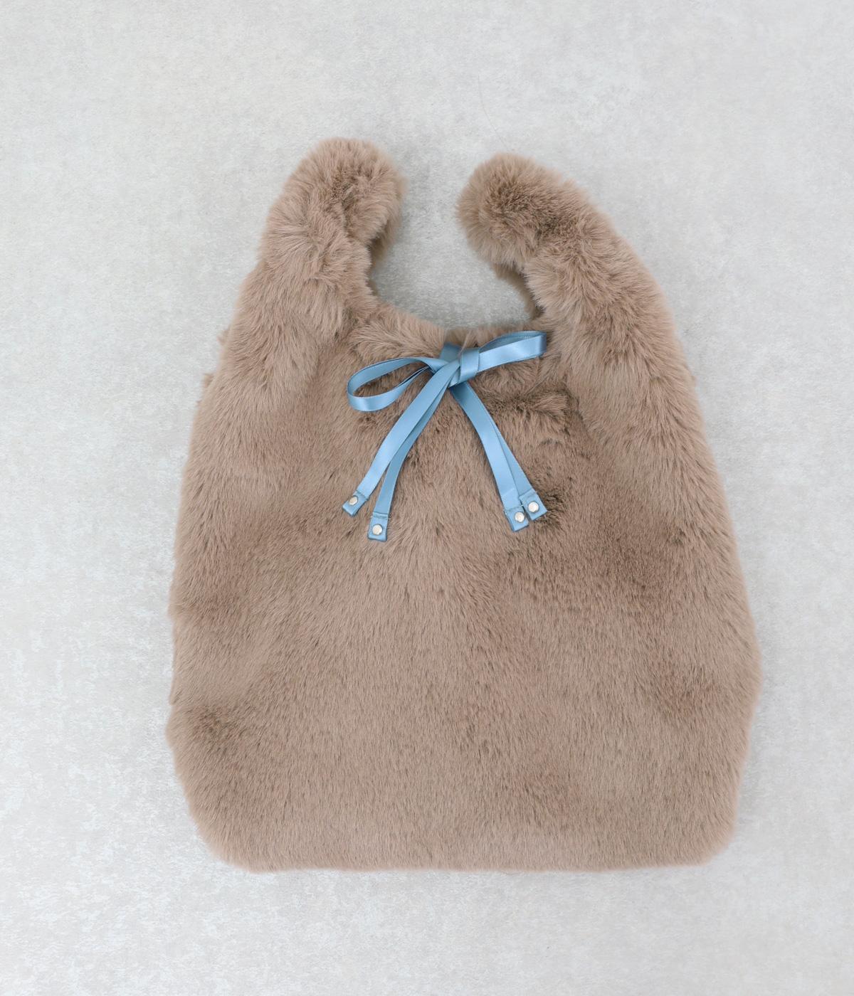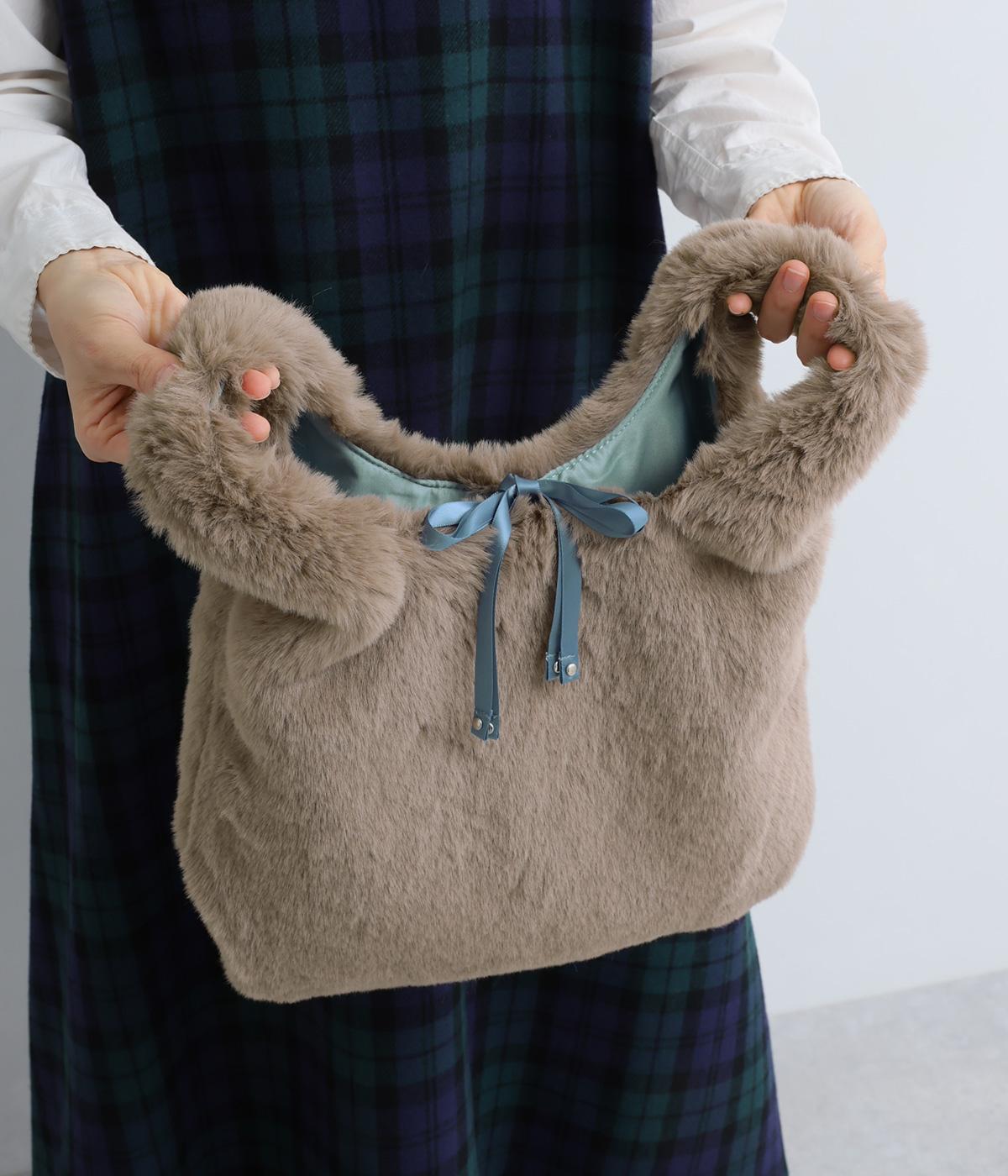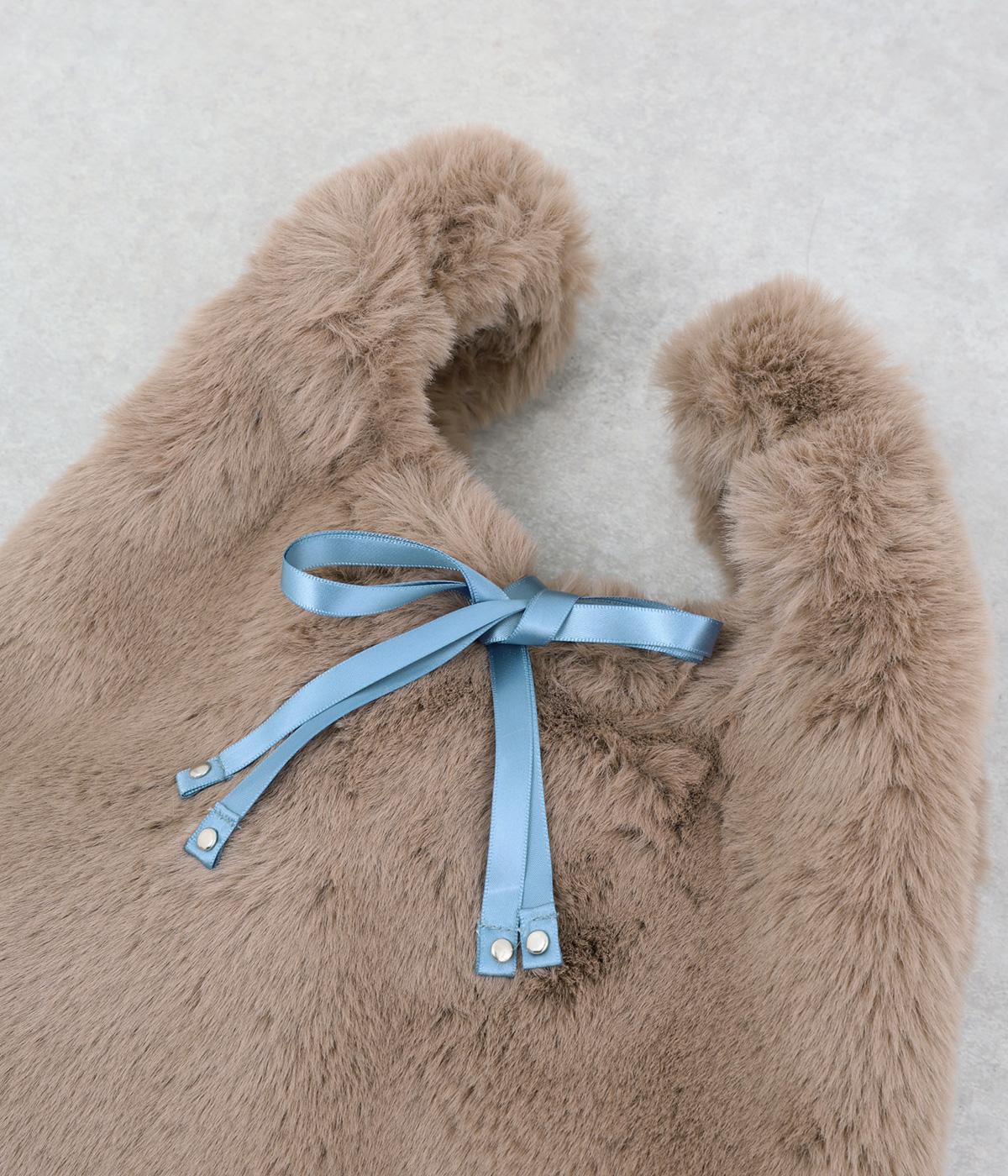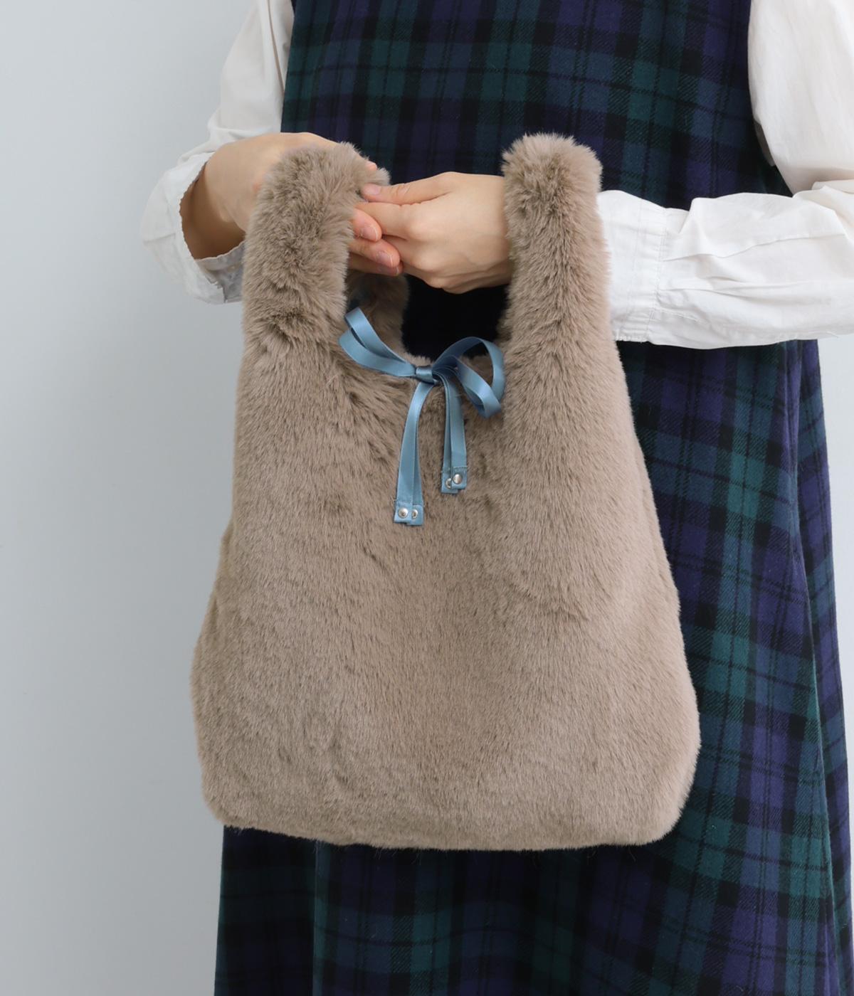 特別なシーンでも持ちたくなるような、リッチ感のあるファーバッグ。配色をきかせた内袋やサテンリボンがアクセントになっています。エコバッグ感覚で気軽に持ちやすいのも好印象で、デイリースタイルのポイント使いにも。